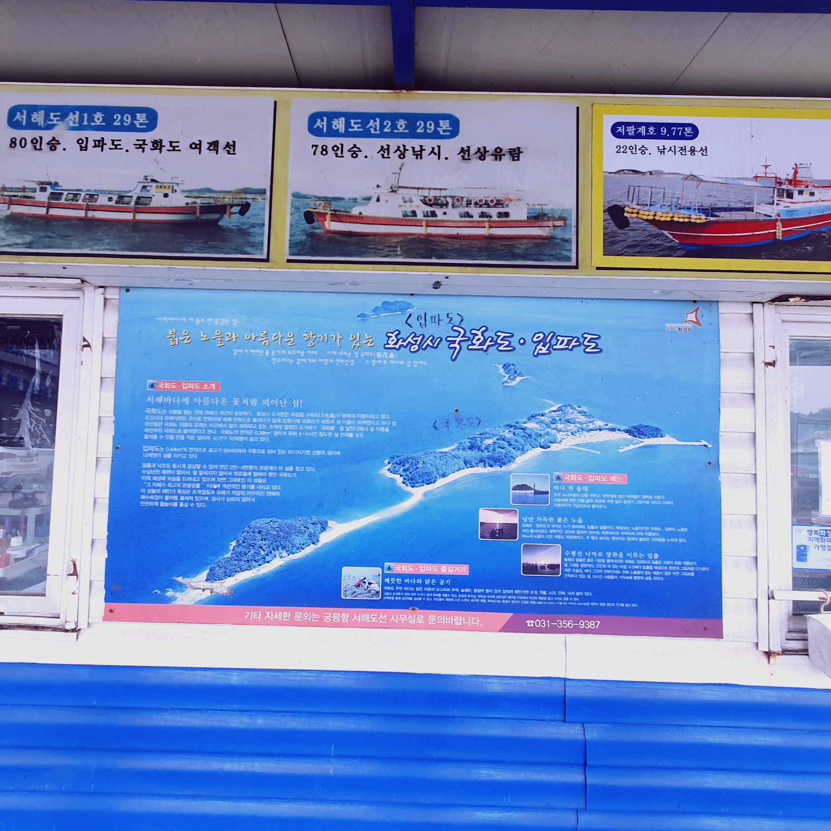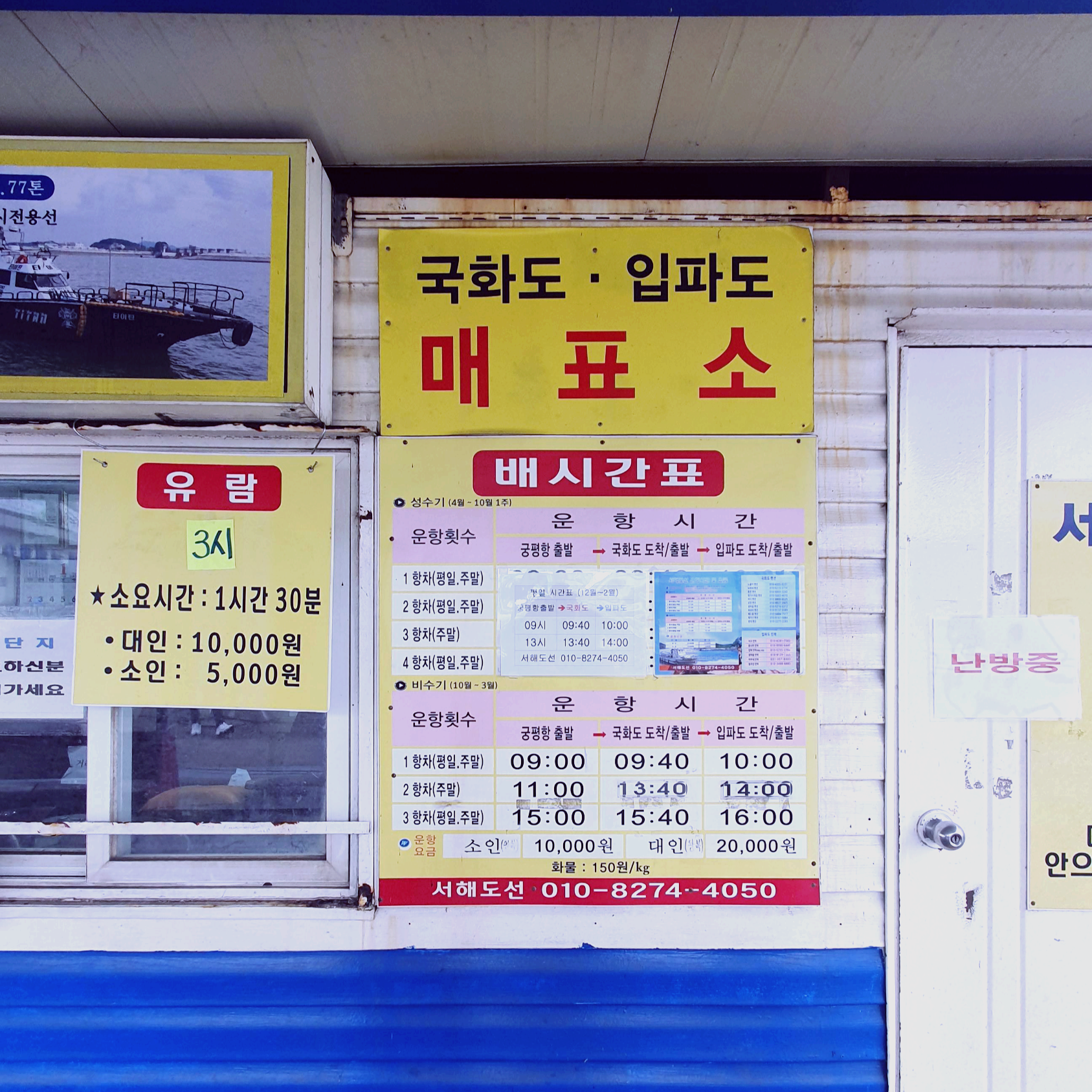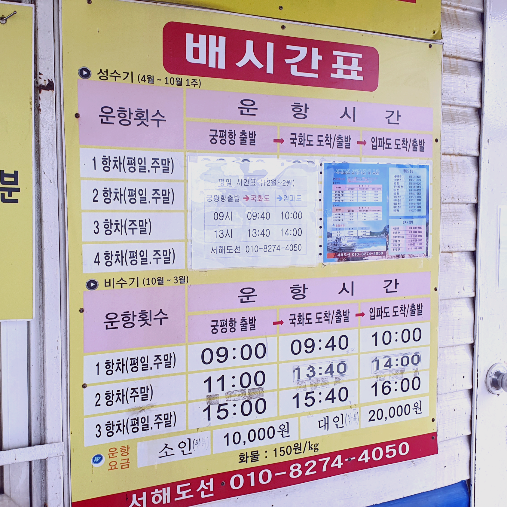 성수기와 비수기로 되어 나뉘어 있습니다. 겨울에는 9시,13시에 출발하고 성수기에는 9시, 11시, 15시로 보여집니다. 정확한 시간이 궁금하다면 '서해도 매표소 (010-8274-4050)'으로 전화해서 문의하면 됩니다. 운항요금은 왕복요금으로 대인 20,000원, 소인 10,000원입니다. 화물은 1kg당 150원 추가