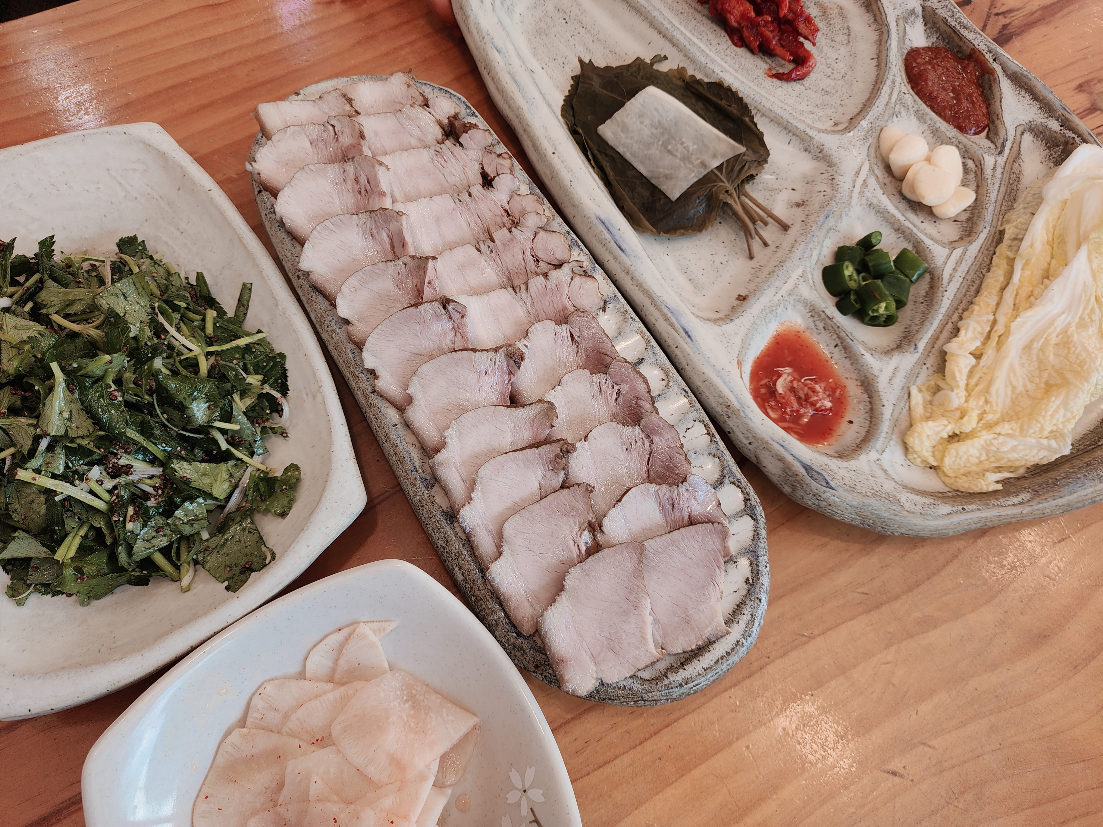 깻잎과 무쌈이 겹겹이 되어 나와 먹기 편했고 무말랭이와 함께 배추쌈으로 먹기에 적당했습니다.