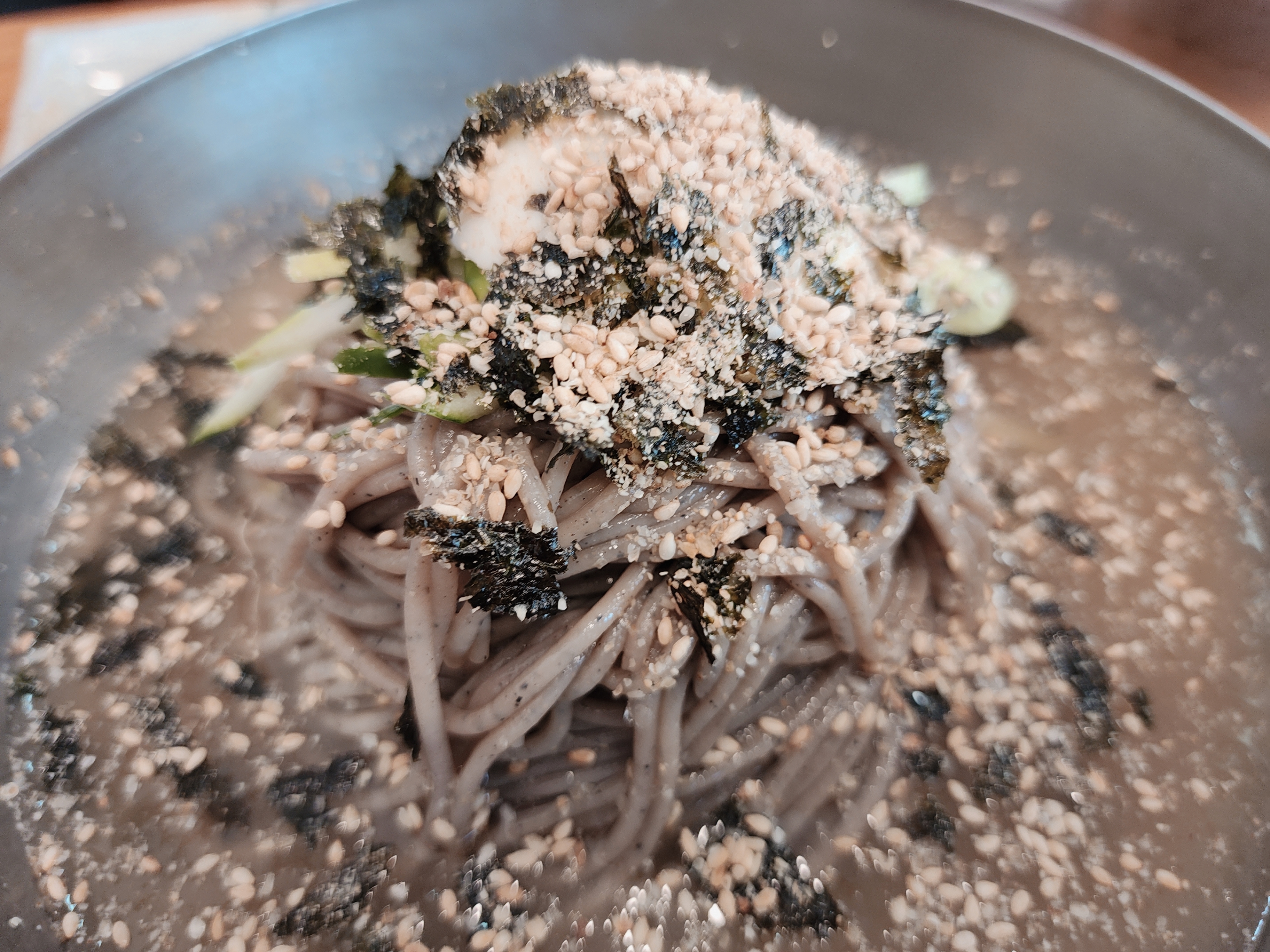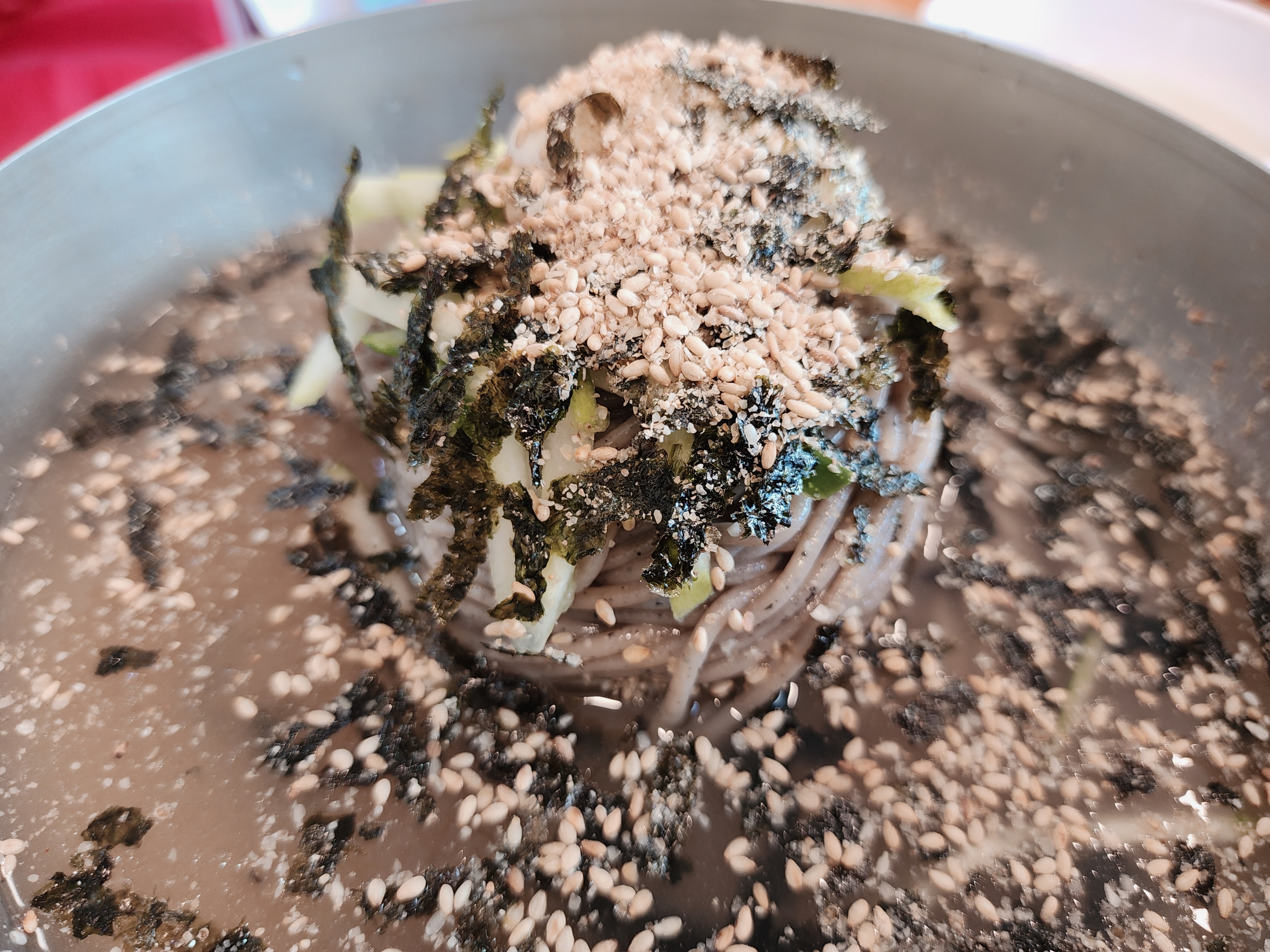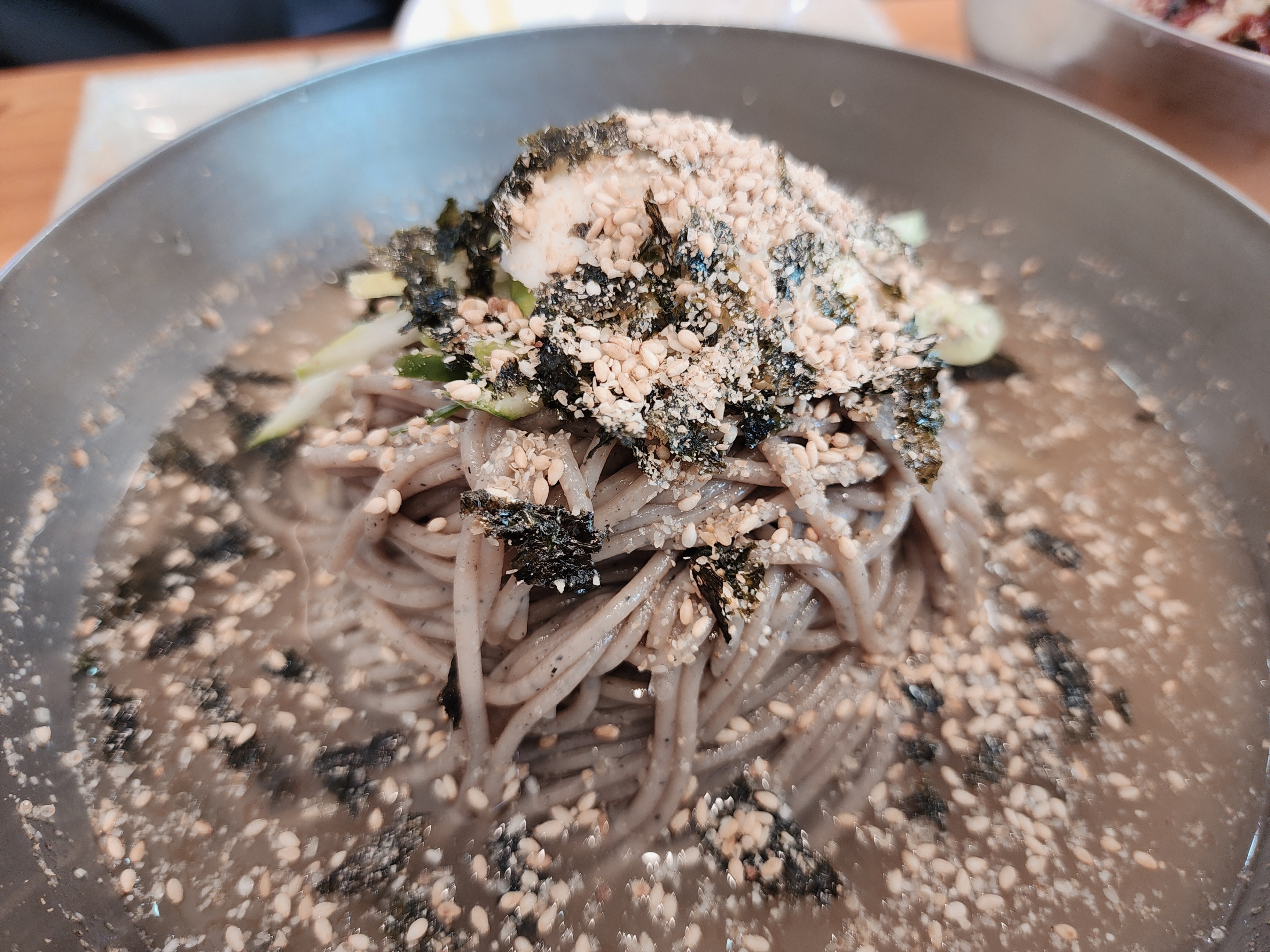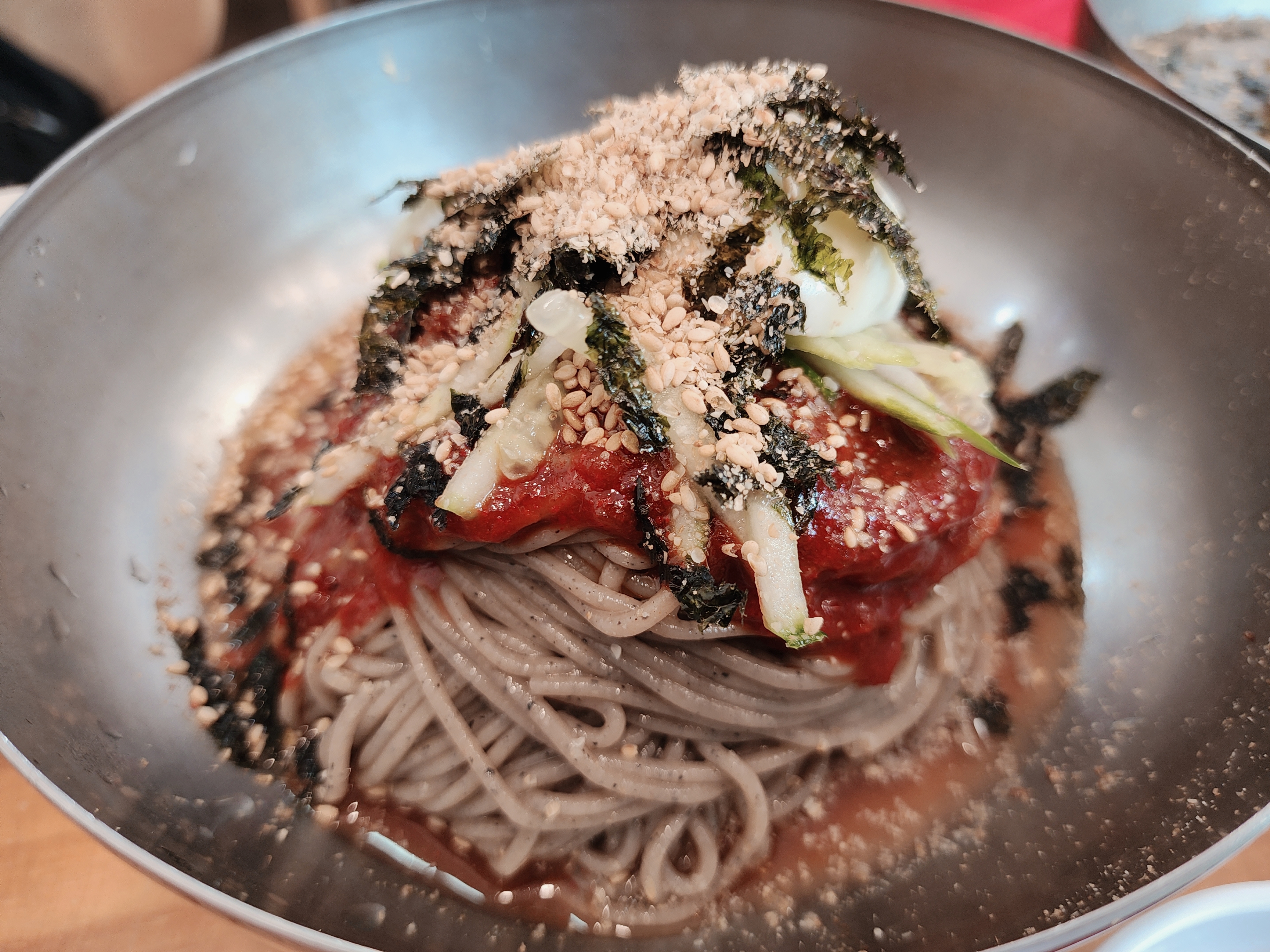 대표메뉴인 물(냉)막국수와 비빔막국수가 있었는데 물막국수가 더 괜찮았던 느낌입니다. 고소하고 속이 부담이 가지 않았습니다. 비빔국수도 족발집에서 먹는 막국수와는 차이가 있었습니다.