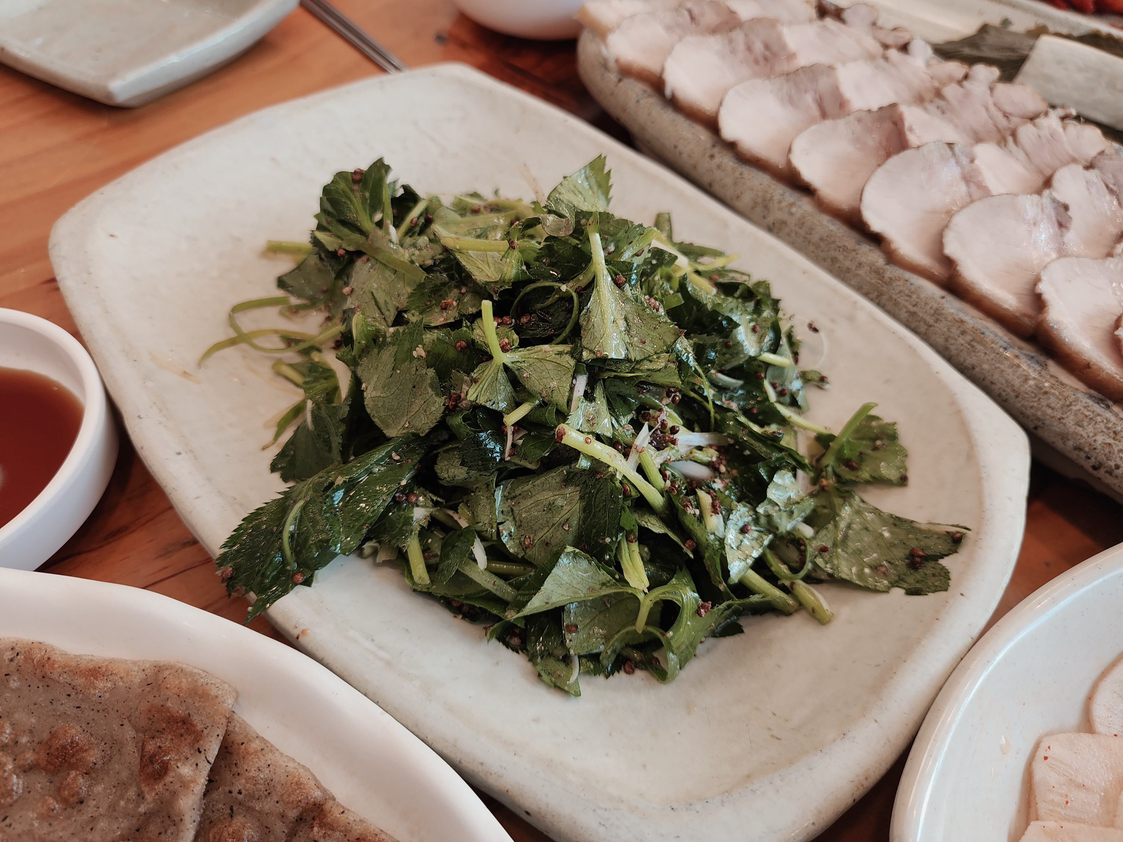 수육을 주문하면 1회만 나오고 추가시에는 추가금을 내야합니다. 들깨기름과 들깨가루로 무쳐있어 아주 맛있습니다.