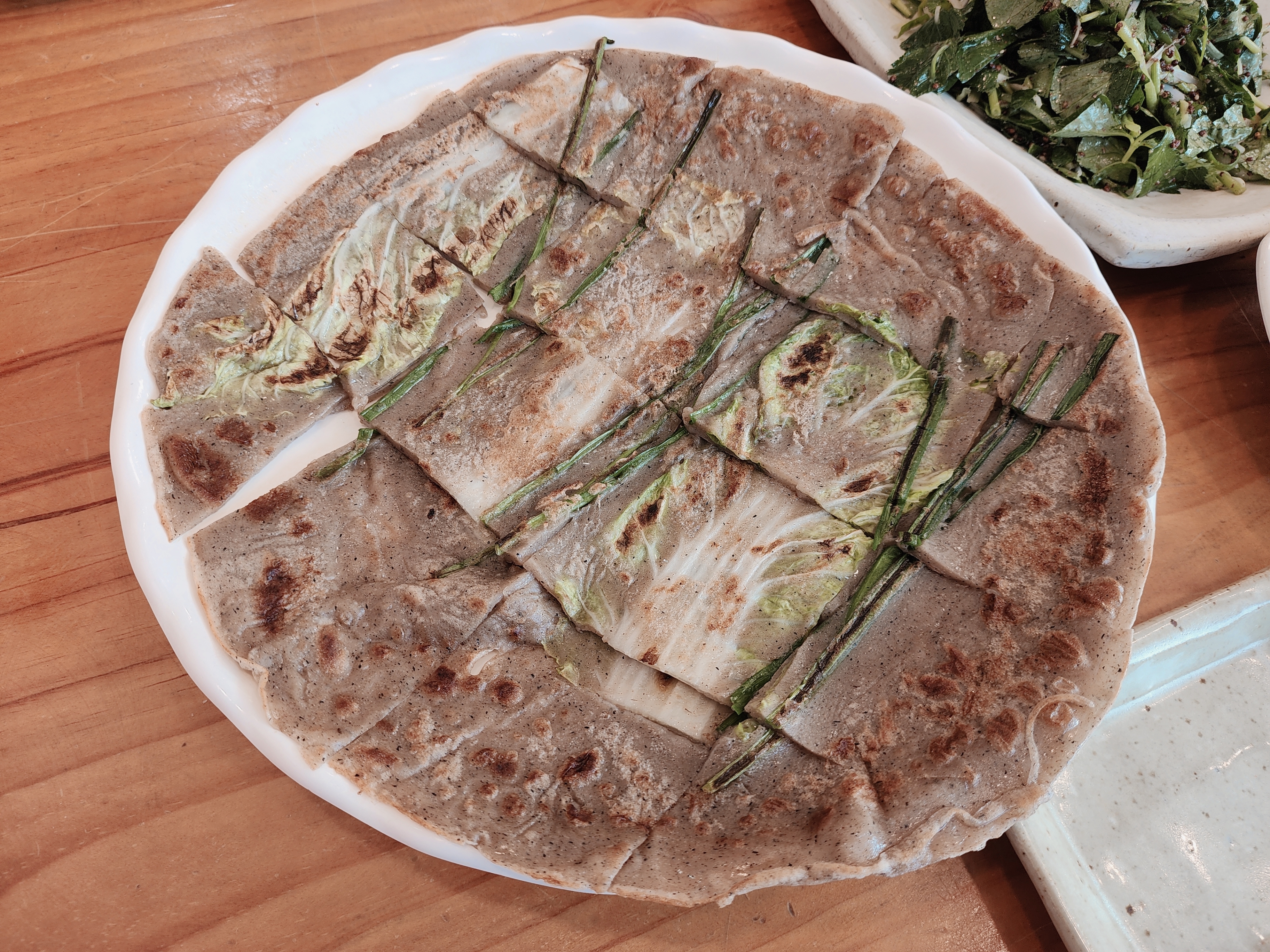 메밀전은 5,000원으로 부드러운 배추전을 먹는 느낌으로 아삭함과 부드러움을 함께 느낄 수 있는 부침개였습니다.