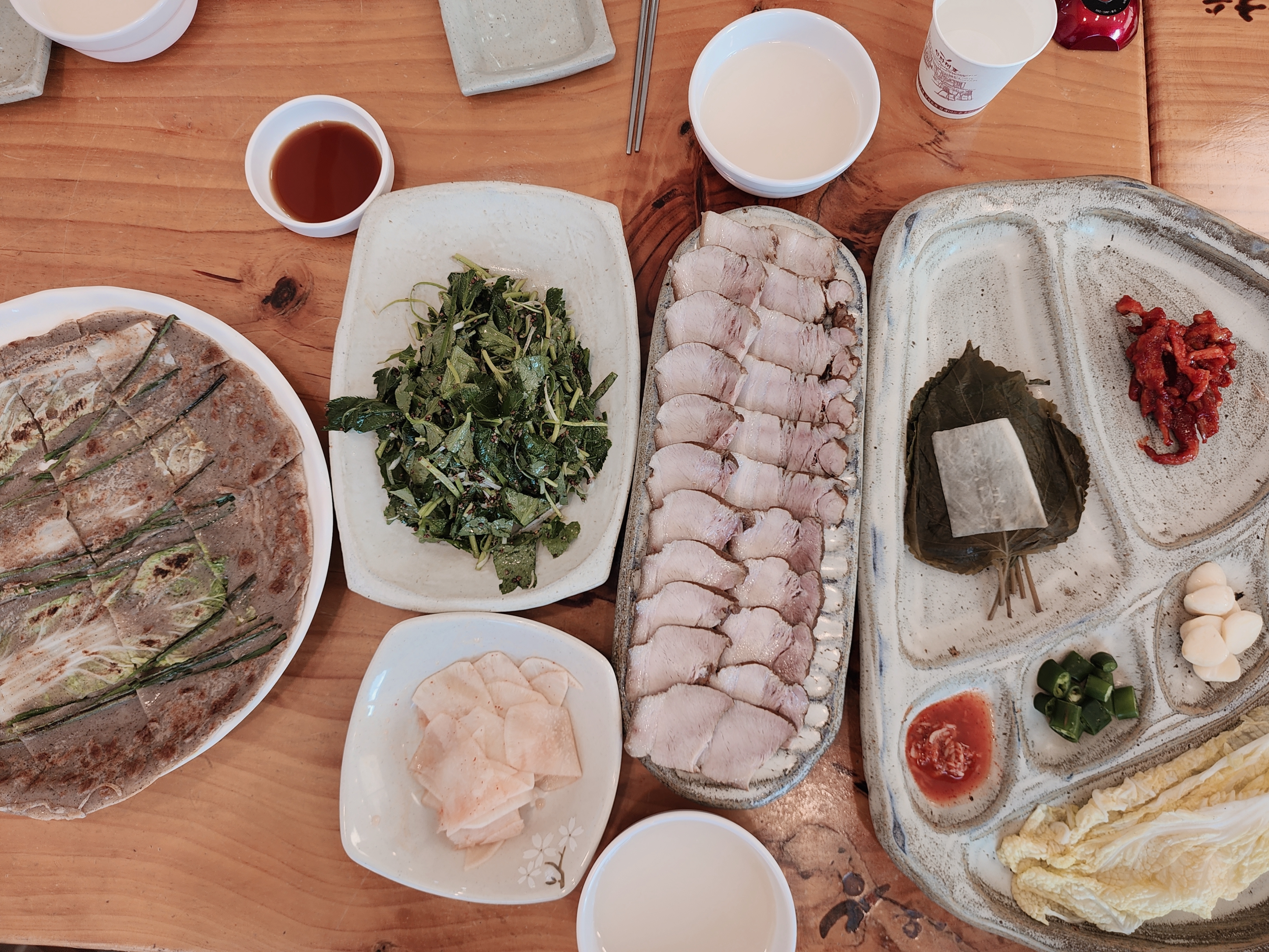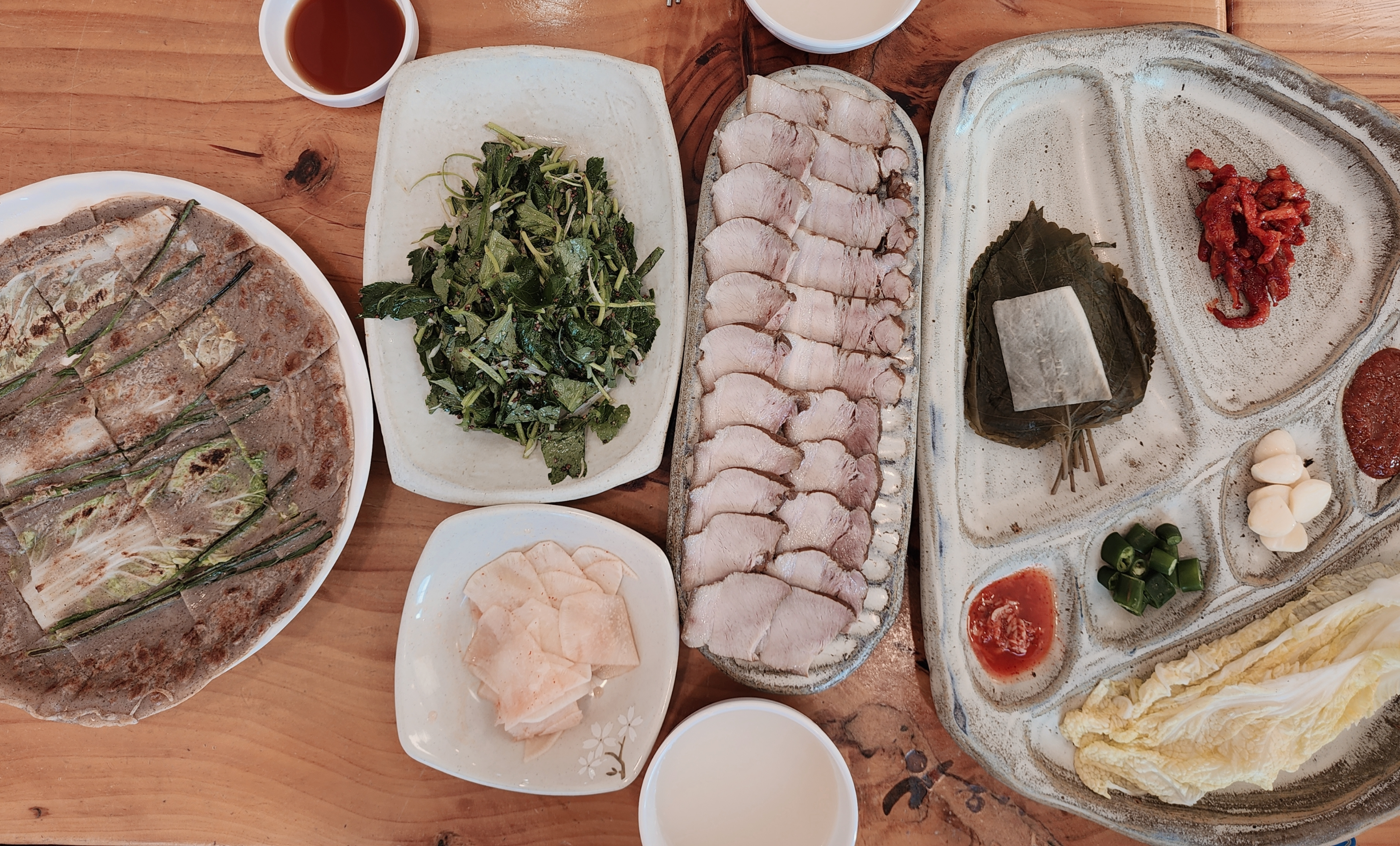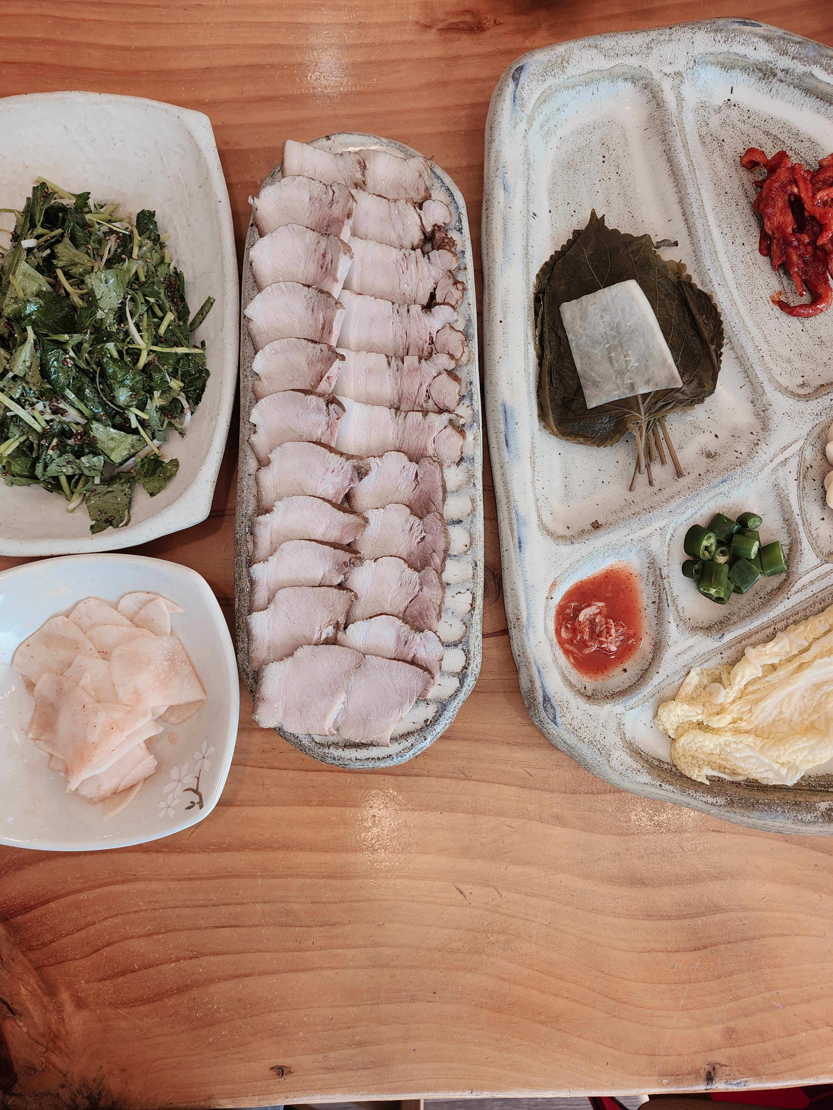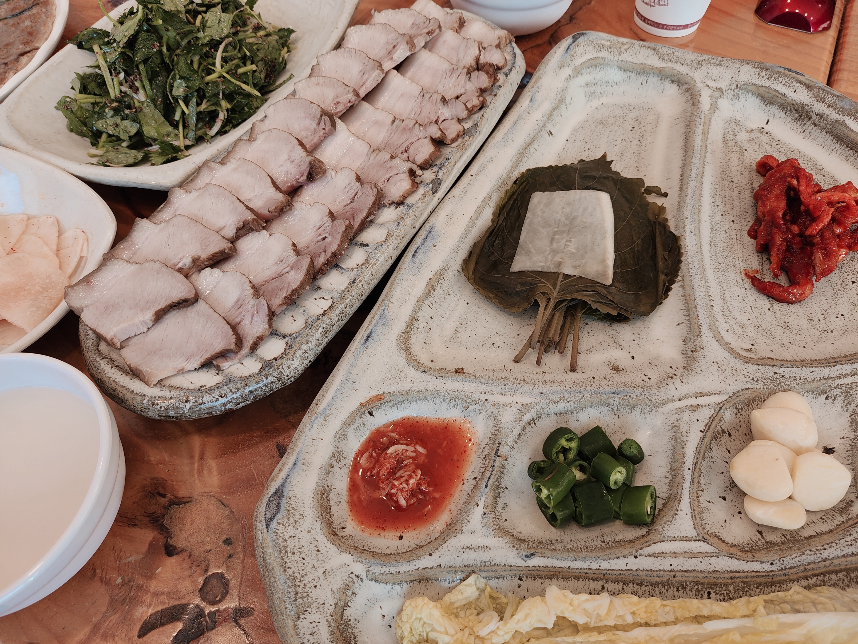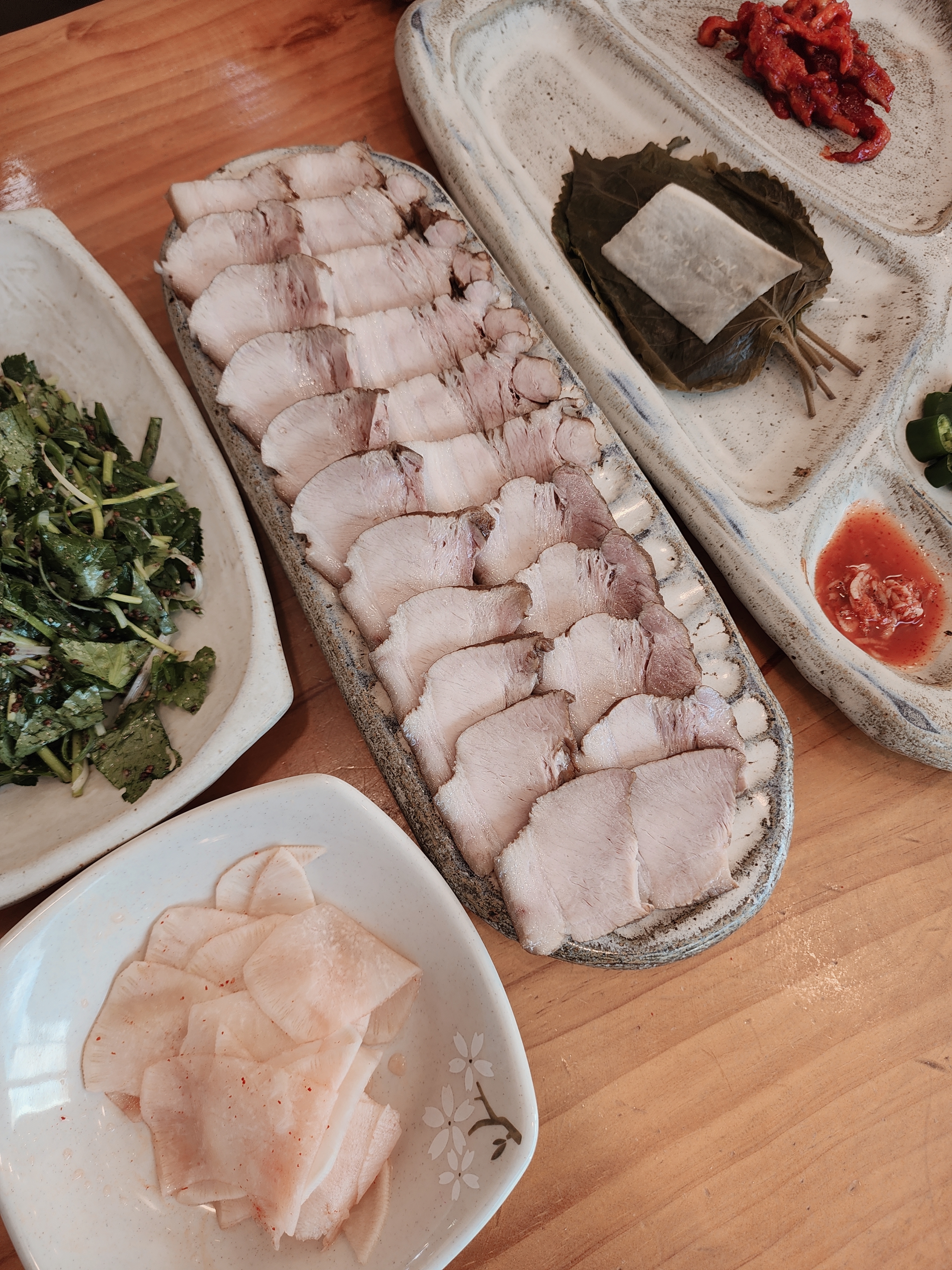 도마에 나오는 제주 돔베고기와 비슷한 느낌으로 나오는 수육은 부드럽고 기름기가 별로 없었습니다.
