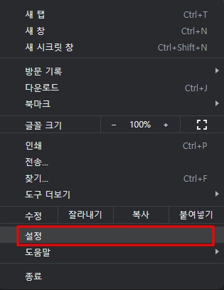 1. 크롬창 우측 상단에 ⋮ 점이 세로로 3개가 있습니다. [Chrome 맞춤설정 및 제어] 선택합니다.