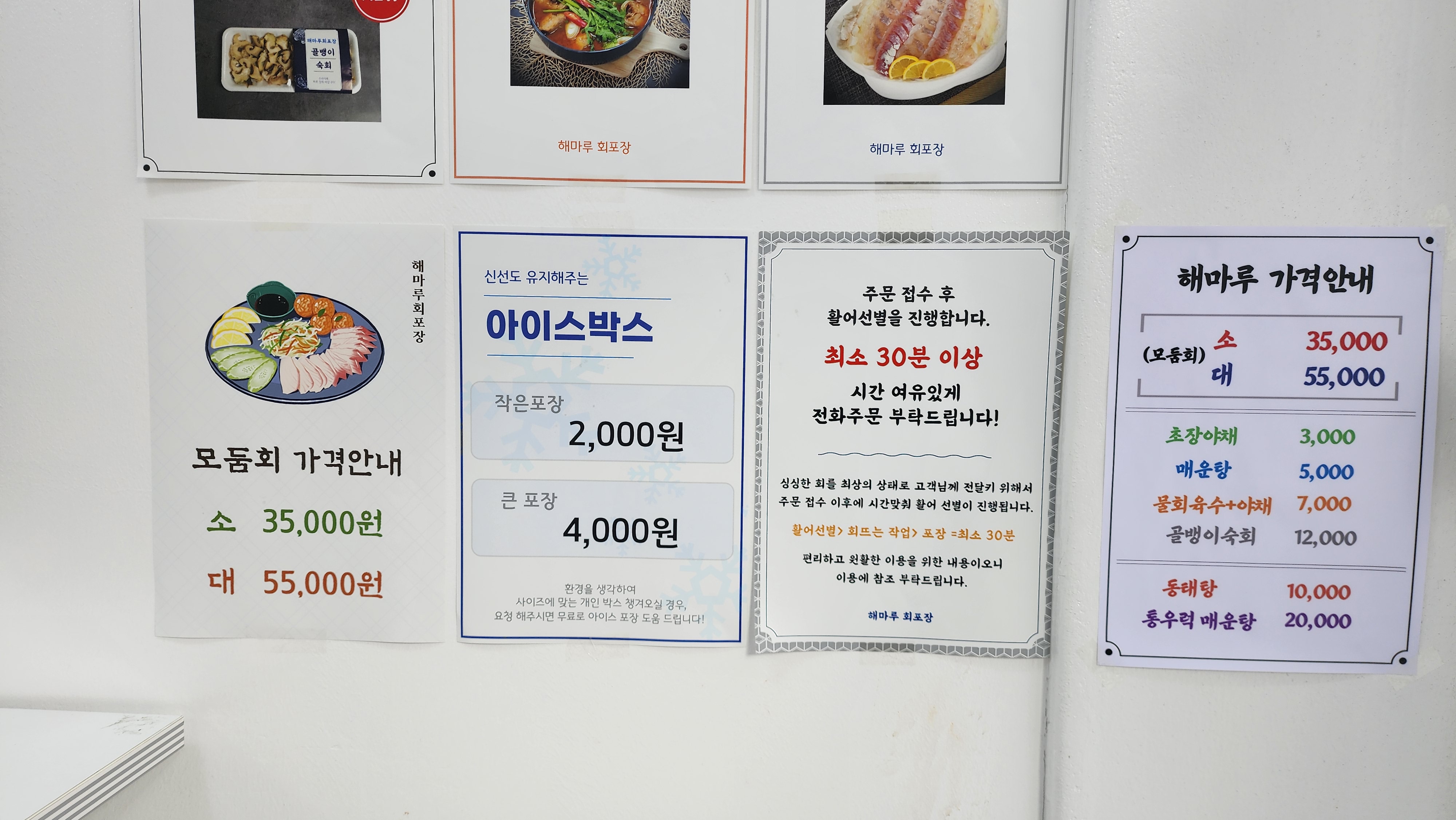 이번에 가고 싶었던 회포장 전문점은 '신유네 회포장'이었는데 미리 예약을 못해 해마루 회포장으로 방문했습니다. 신유네 회포장을 방문해보지는 않았지만 새우와 멍게가 들어가 있는 것 같습니다. 다음에는 신유네에 가보겠습니다. 해마루회포장은 도착 30분 전에 전화하면 바로 픽업할 수 있습니다.