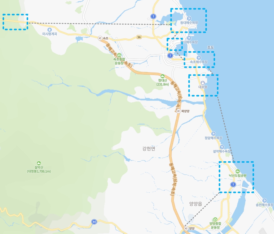 동해고속도로로 북양양 IC 나갈 경우 낙산사, 대포항, 속초해수욕장, 중앙시장, 아바이마을, 동명항, 영랑호 순서대로 가는 게 편합니다. 다음날은 국도로 설악산 케이블카를 타고 미시령을 넘어 인제에 있는 백담사를 한번 보고 돌아오면 1박 2일 코스로 알차게 관광할 수 있습니다.