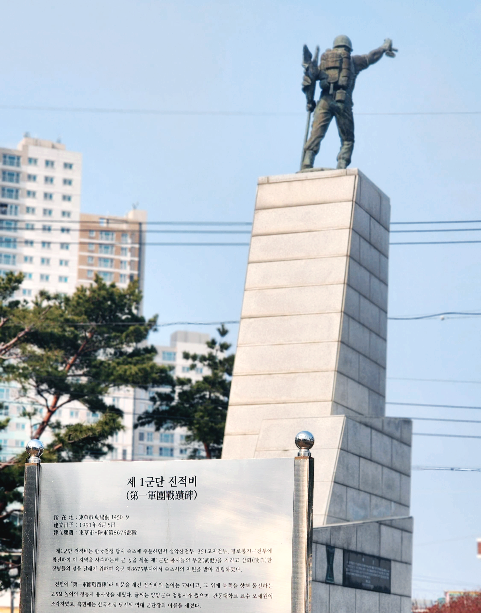 한국전쟁 당시 속초에 주둔하면서 설악산전투, 351고지전투, 향로봉지구전투에 참전한 1군단 군인 분들을 위한 1군단 전적비가 속초해수욕장에서 북쪽을 바라보며 진군하는 모습으로 있습니다.