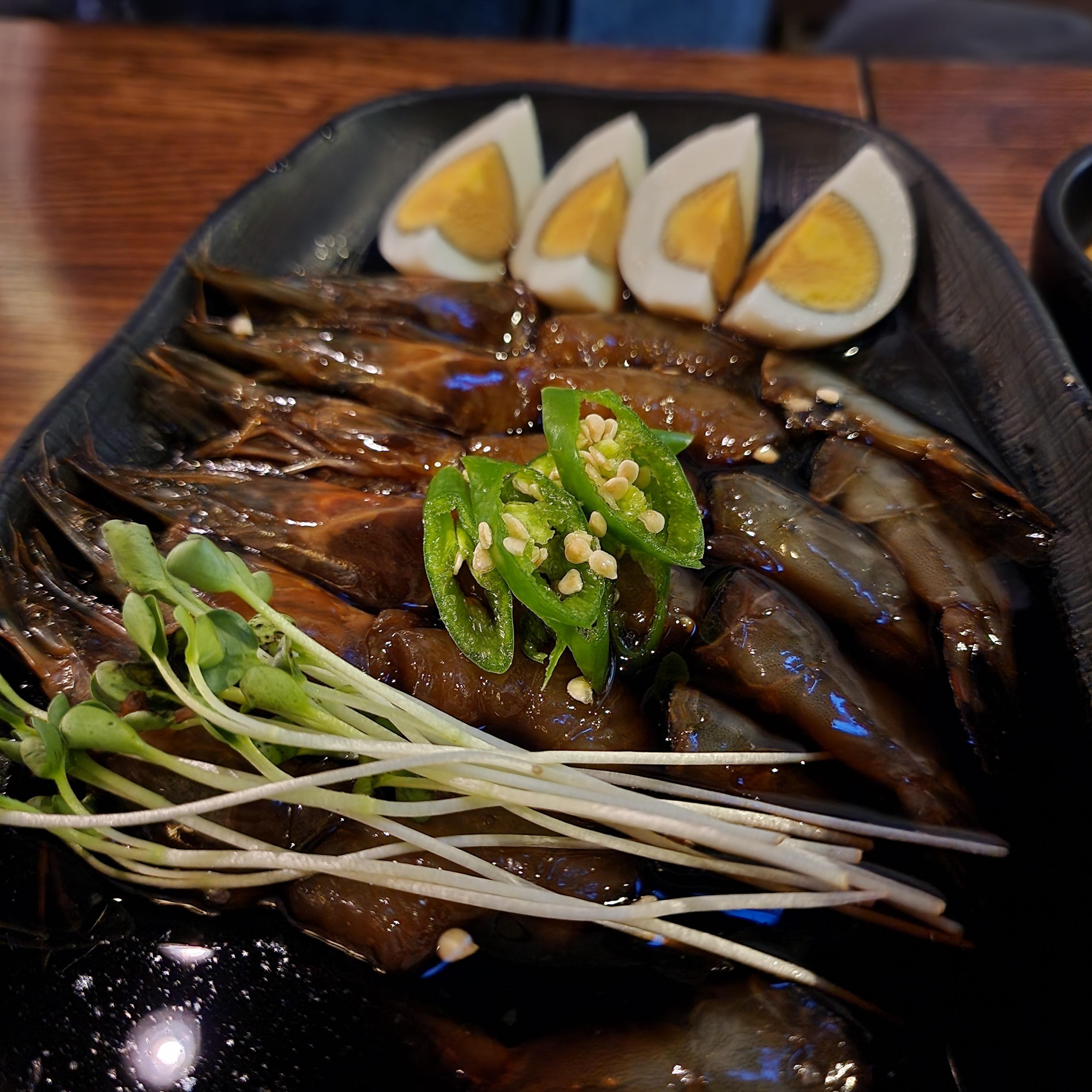 간장새우에는 무순과 삶은 계란이 들어가 있고 새우는 8마리였습니다. 버터구이도 8마리로 머리와 분리되어 나옵니다. 지인은 강추를 하며 간장새우를 추천하여 먹어봤는데 다른 곳보다 조금 덜 물컹거리는 느낌이였고 잡내는 전혀 없었습니다.