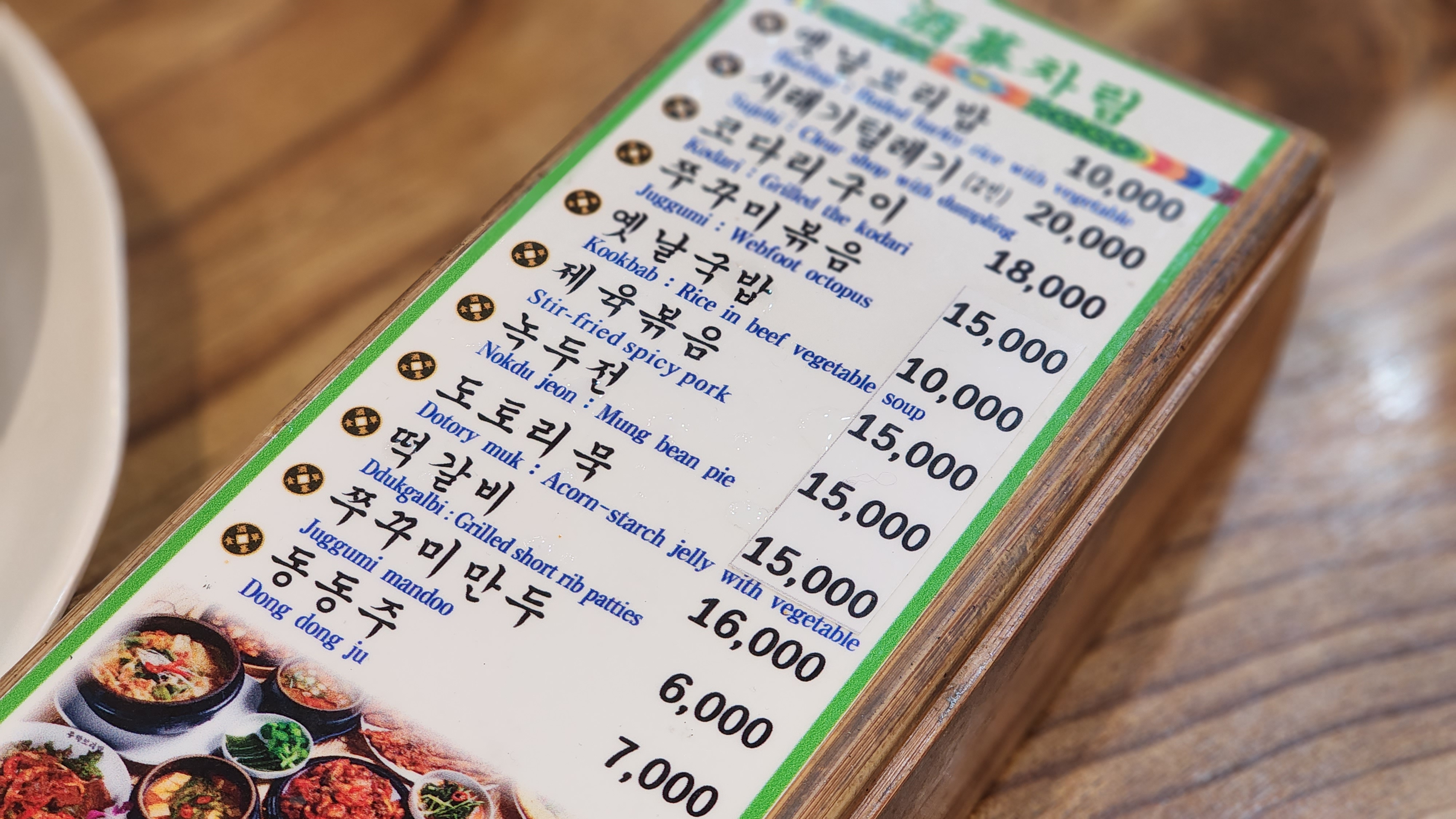 테이블은 입식과 좌식으로 절반정도 나뉘어 있습니다. 우리는 입식테이블이 앉아 수저통에 있는 메뉴통을 보고 수제비를 주문했습니다. 사실 오기 전에 수제비를 먹고 싶다고 말해서 아는 맛집이 있다고 데리고 왔습니다. 여기 시그니처 메뉴는 보리밥이지만 손님의 절반 정도는 시래기털레기를 주문하여 먹습니다. 시래기털레기는 보리새우가 들어간 된장국 베이스의 수제비입니다. 전에 방문해서 보리밥과 쭈꾸미볶음을 먹었는데 쭈꾸미볶음이 아주 괜찮았습니다. 두명이 보리밥만 먹기에는 뭔가 아쉽고 쭈꾸미볶음은 과한 느낌으로 시래기털레기만 주문했습니다.
