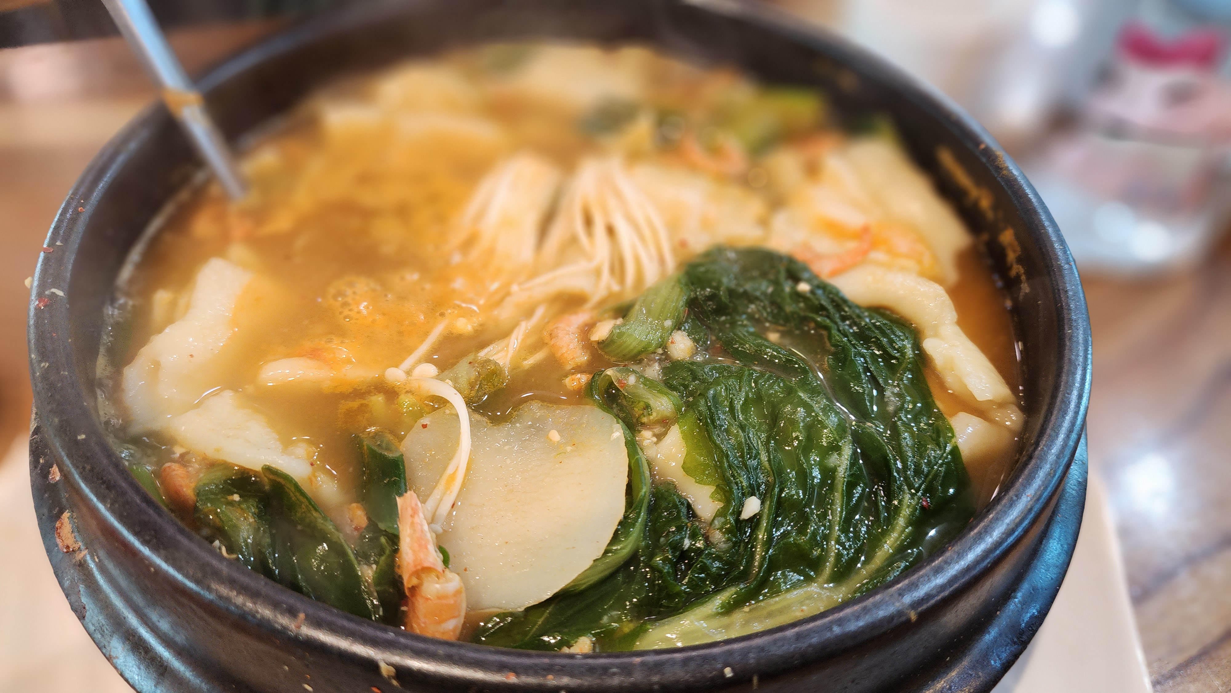 사진으로 양이 작아 보일 수 있지만 2명이 먹을 수 있는 양이 아닙니다. 이렇게 큰 뚝배기가 있어 놀라고 수제비양에 놀랍니다. 모든 재료가 엄청 들어가 있어 시원하면서 구수한 맛을 내고 수제비 반죽도 잘해서인지 얇고 맛있습니다.