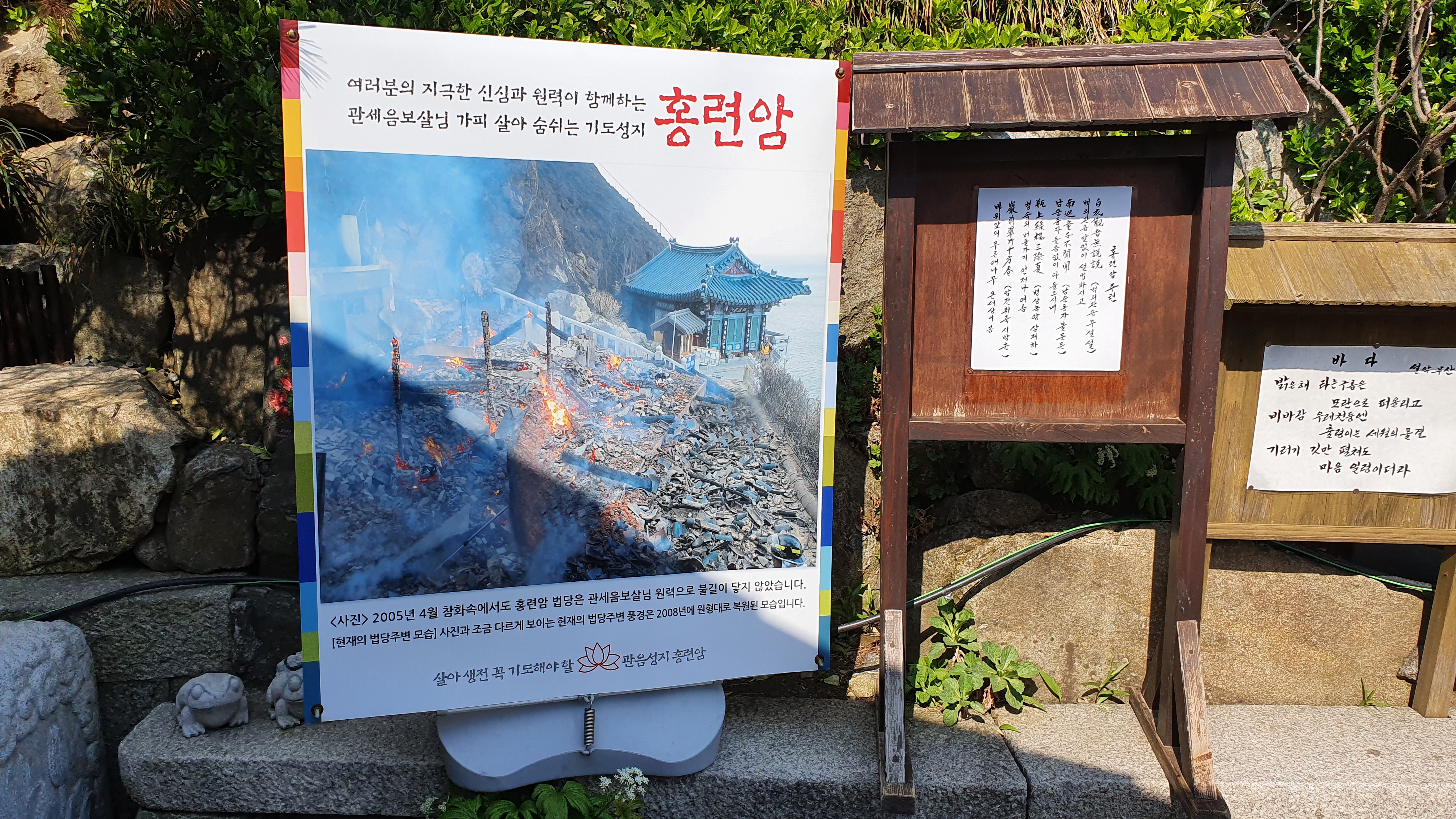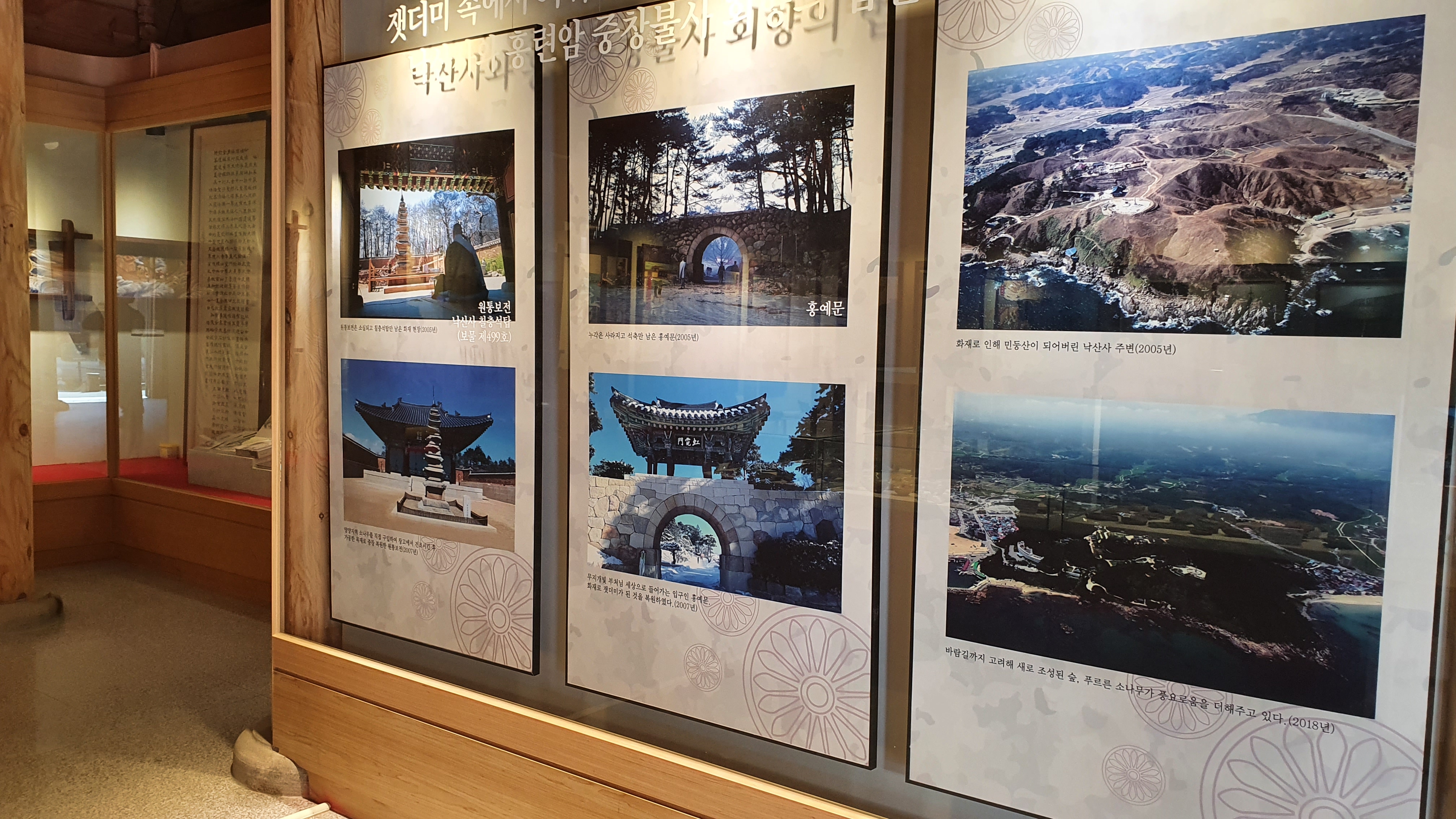 낙산사의 역사와 2005년에 화재로 인해 낙산사에 큰불로 소실과 복원의 과정을 볼 수 있는 곳입니다. 지금의 낙산사는 이미 복원이 되었고 지금의 낙산사는 가장 번성했던 조선시대의 모습으로 복원된 모습이라고 합니다.