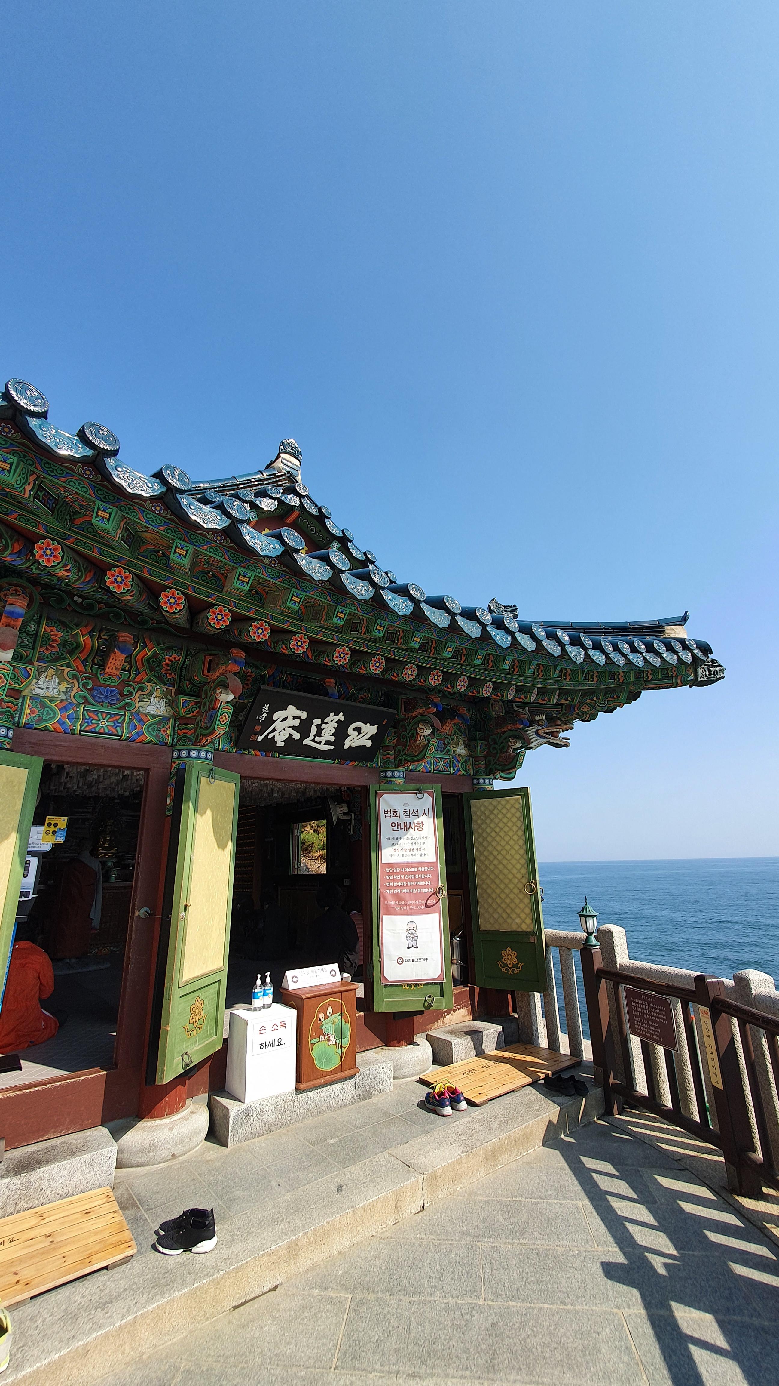 홍련암은 법당에서 절을 하면 바닥에 유리바닥으로 되어 있는 부분이 있습니다. 그곳을 통해 절벽에 파도가 부딪치는 모습을 볼 수 있습니다. 절벽 위에 세워진 법당입니다.