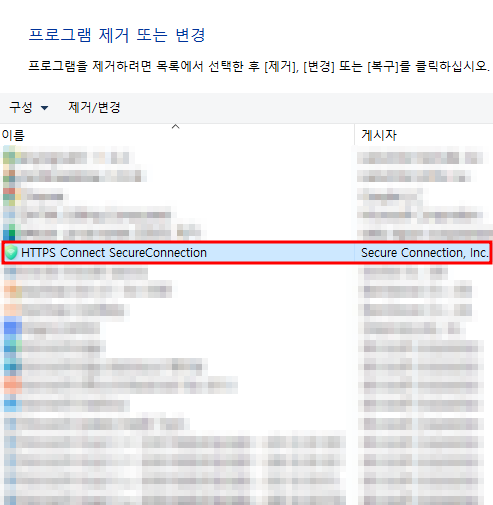 설치된 프로그램 중에 문제의 프로그램을 찾는데 정말 교묘하게 숨어 있어 찾기 힘듭니다. 꼭 기본프로그램인것처럼, 지우면 안되는 파일처럼 이름을 만들어져 있었습니다. 문제의 파일명은 'HTTPS Connect SecureConnection' 였습니다.