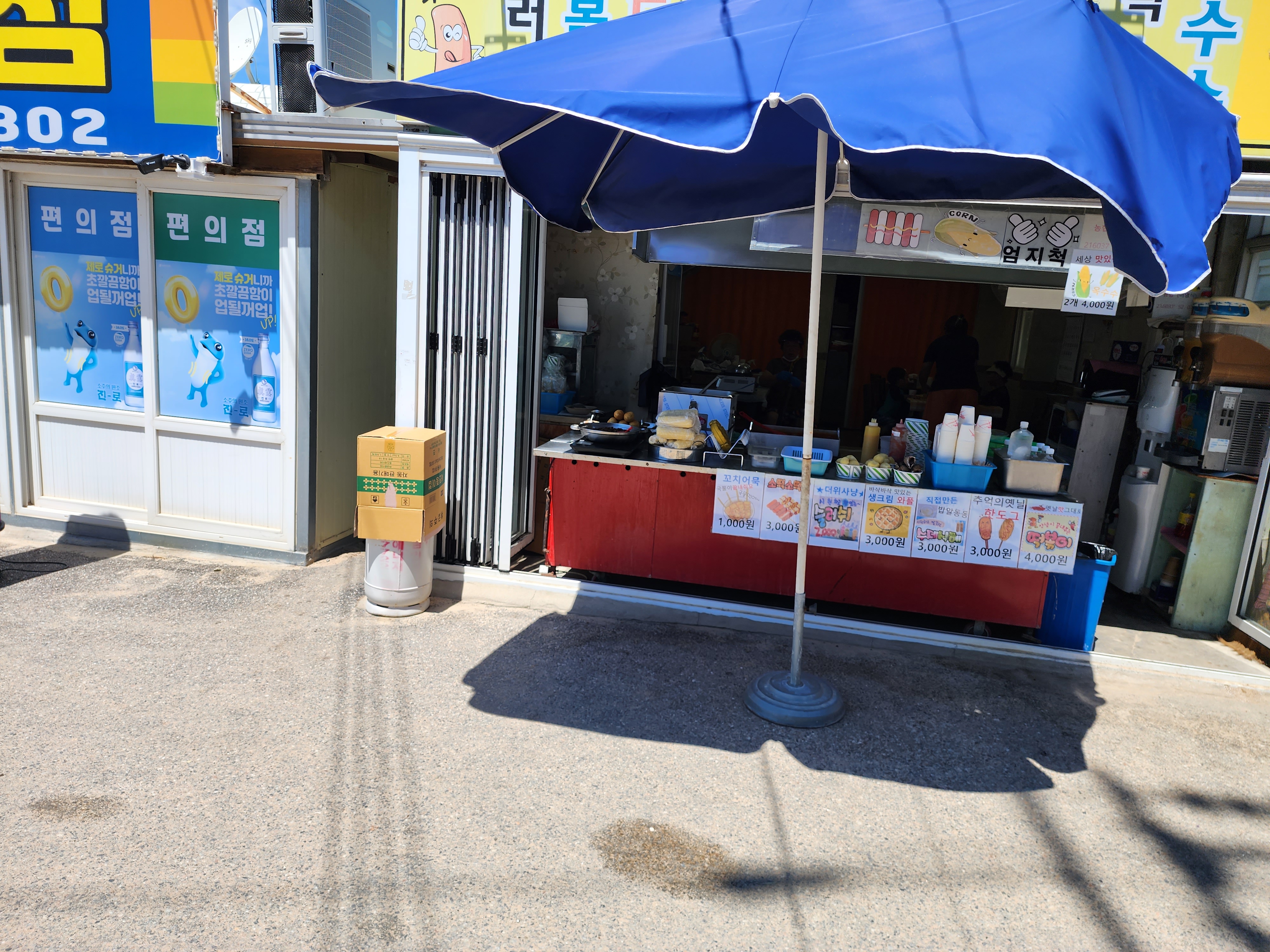 이번에는 해수욕장 앞에 있는 이마트 편의점에 주차를 하고 정문으로 들어갔습니다. 정문에서 멀지 않게 관리사무소와 상가들이 보이고 해변으로 들어갈 수 있습니다.