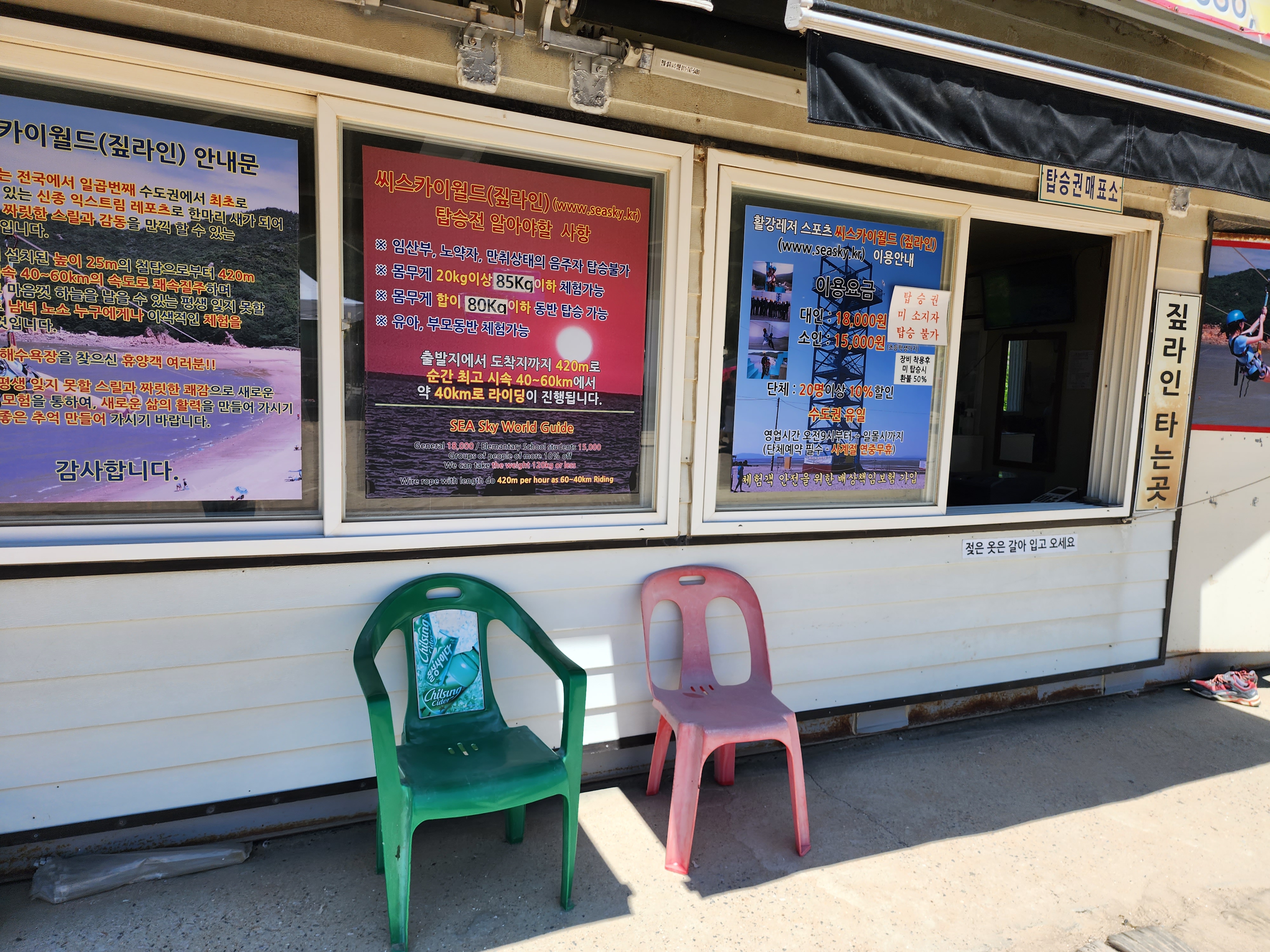 하나개 해수욕장에 짚라인이 있는데 성인 18,000원, 소인 15,000원 안내표지판이 보입니다. 탑승시 유의점이 눈에 들어왔는데 '체중 20kg ~ 85kg', '동반탑승시 합이 80kg이하' 까지만 탈 수 있다고 합니다. 그래서인건지 남자보다는 여자가 많이 타는 걸 볼 수 있었습니다. 짧아서인지 재미있어 보이지는 않았습니다.