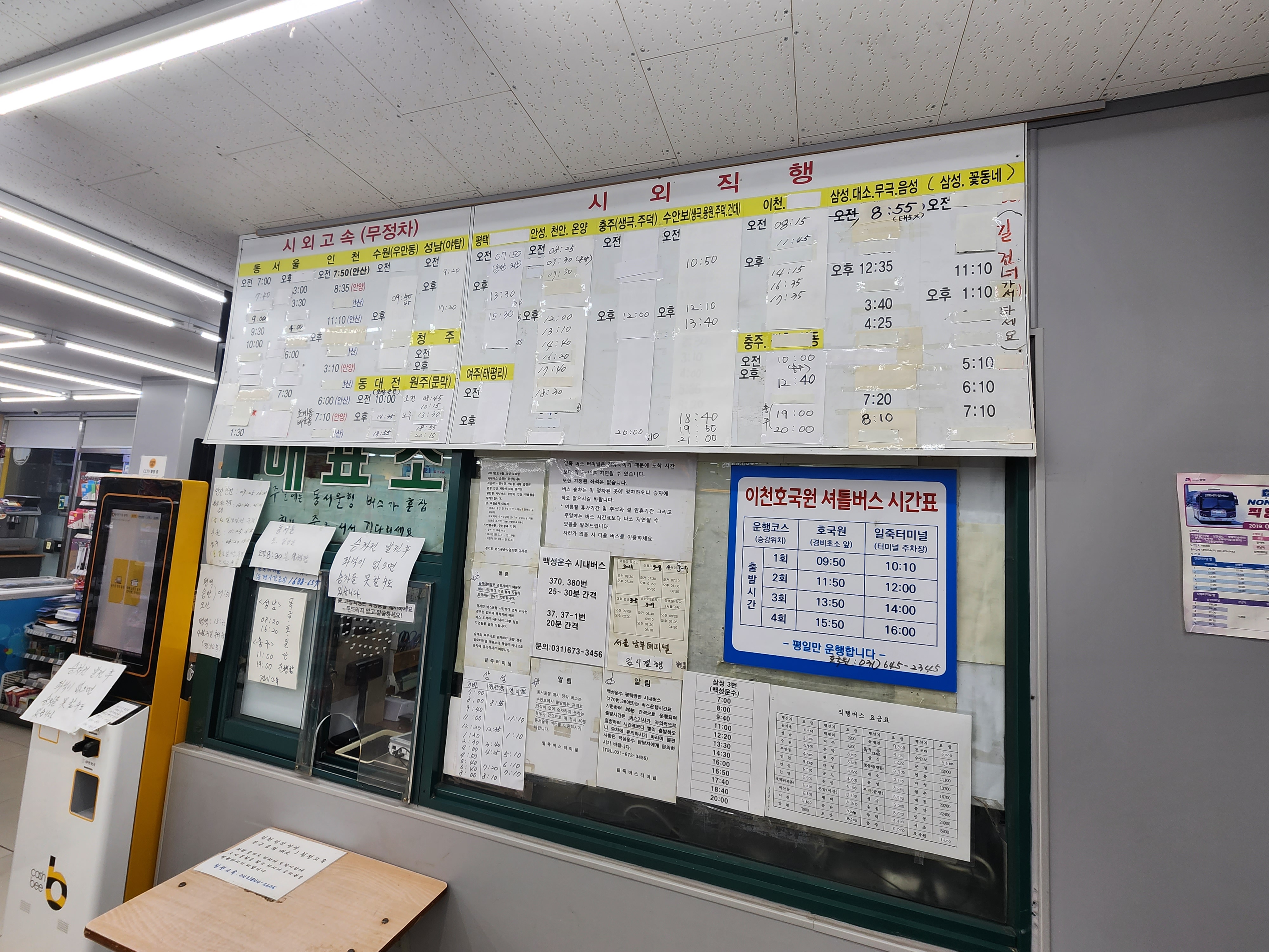 장호원이나 안성, 이천쪽에서 갈 수 있는 터미널로 시내버스도 탈 수 있고 시외버스도 탈 수 있는 터미널입니다. 일죽에서 출발하는 버스가 아니라 대부분 경유하는 터미널이다보니 자리가 없을 수 있습니다. 이럴 경우 다른 터머널을 이용해야 하는 경우가 있습니다. 근처에 더 큰 터미널(죽산터미널, 두원공대터미널)을 이용하면 됩니다. 또는 택시를 타고 25분정도 가면 '이천역'으로 갈 수 있습니다. 택시비는 45,000원정도 발생합니다.