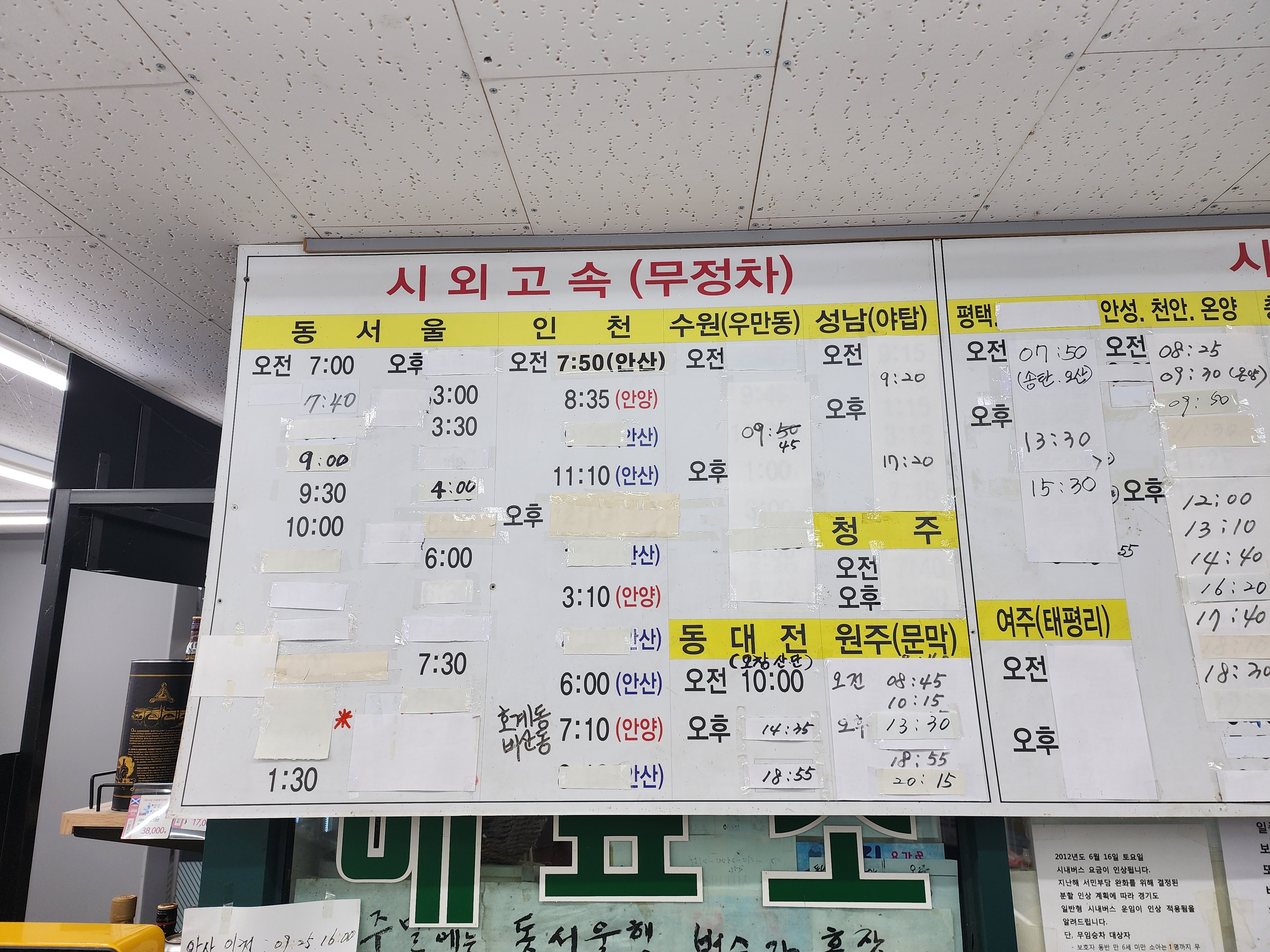 | 동서울 | 07 : 00 07 : 40 08 : 30(주말만) 09 : 00 09 : 30 10 : 00 13 : 30 15 : 00 15 : 30 16 : 00 18 : 00 19 : 30 |
