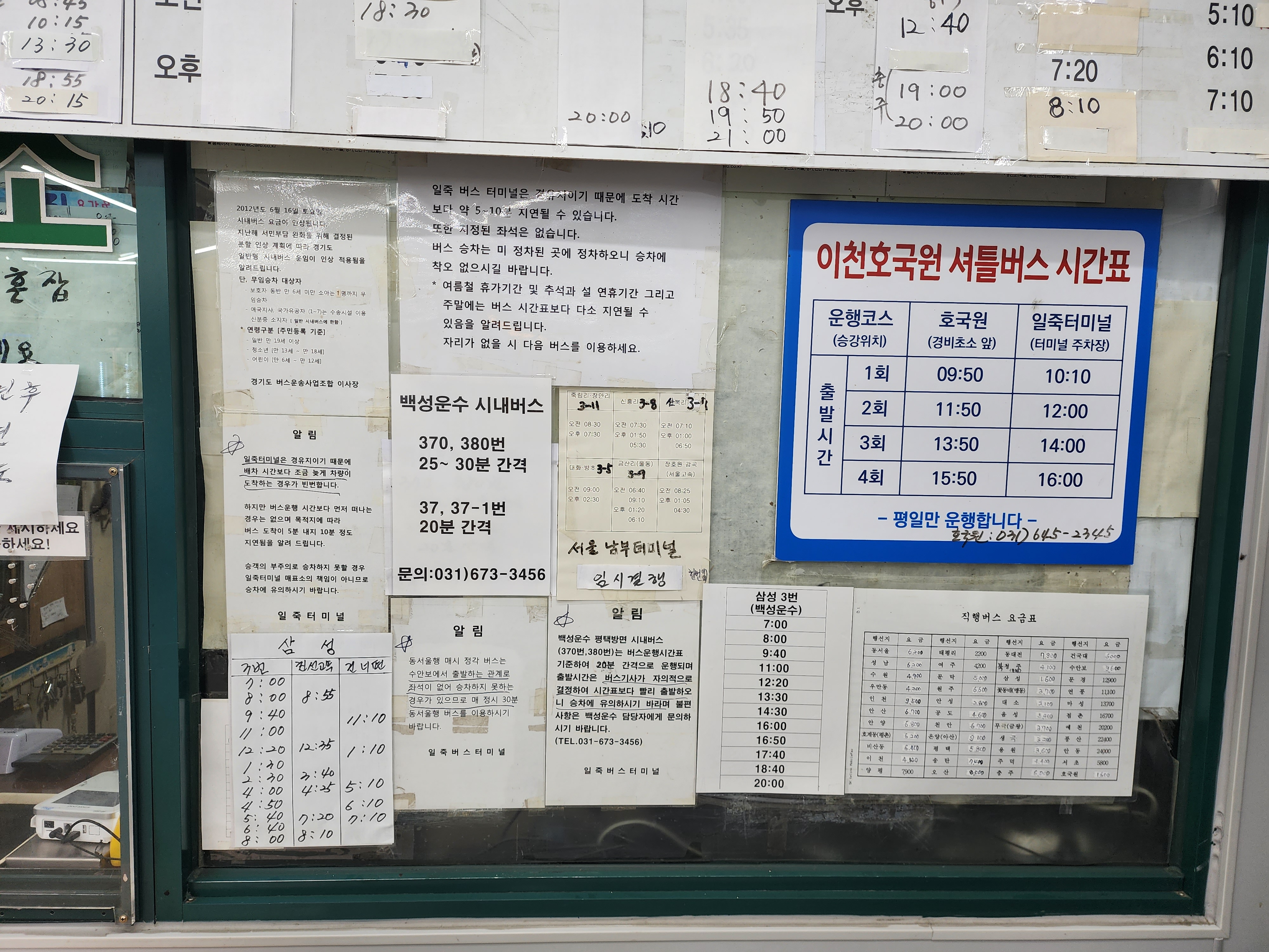 장호원이나 안성, 이천쪽에서 갈 수 있는 터미널로 시내버스도 탈 수 있고 시외버스도 탈 수 있는 터미널입니다. 일죽에서 출발하는 버스가 아니라 대부분 경유하는 터미널이다보니 자리가 없을 수 있습니다. 이럴 경우 다른 터머널을 이용해야 하는 경우가 있습니다. 근처에 더 큰 터미널(죽산터미널, 두원공대터미널)을 이용하면 됩니다. 또는 택시를 타고 25분정도 가면 '이천역'으로 갈 수 있습니다. 택시비는 45,000원정도 발생합니다.