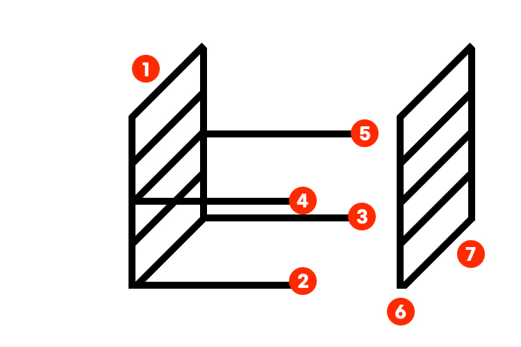 ①바닥 → ② 기둥 1번 →③ 기둥 2번 → ④ 측면 → ⑤ 기둥