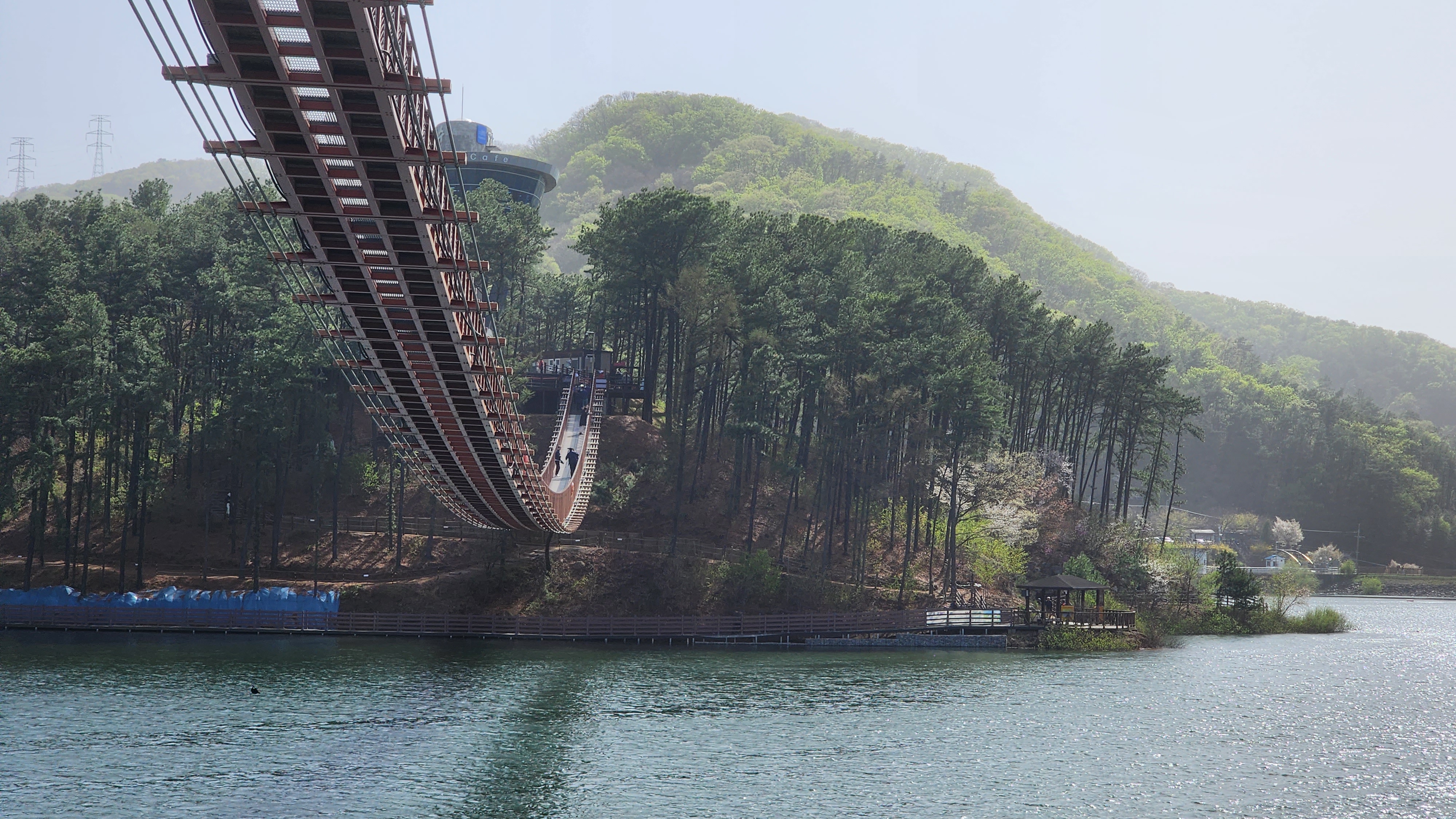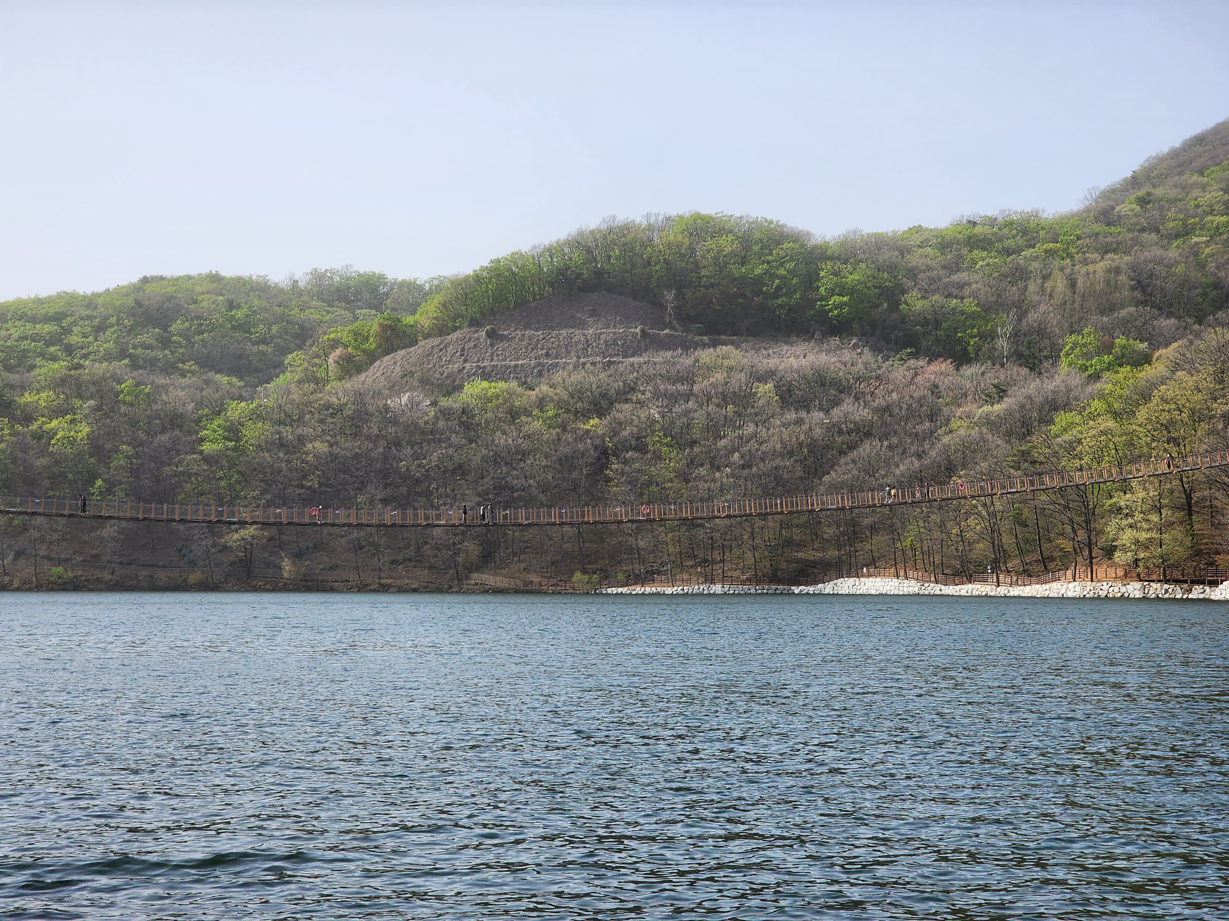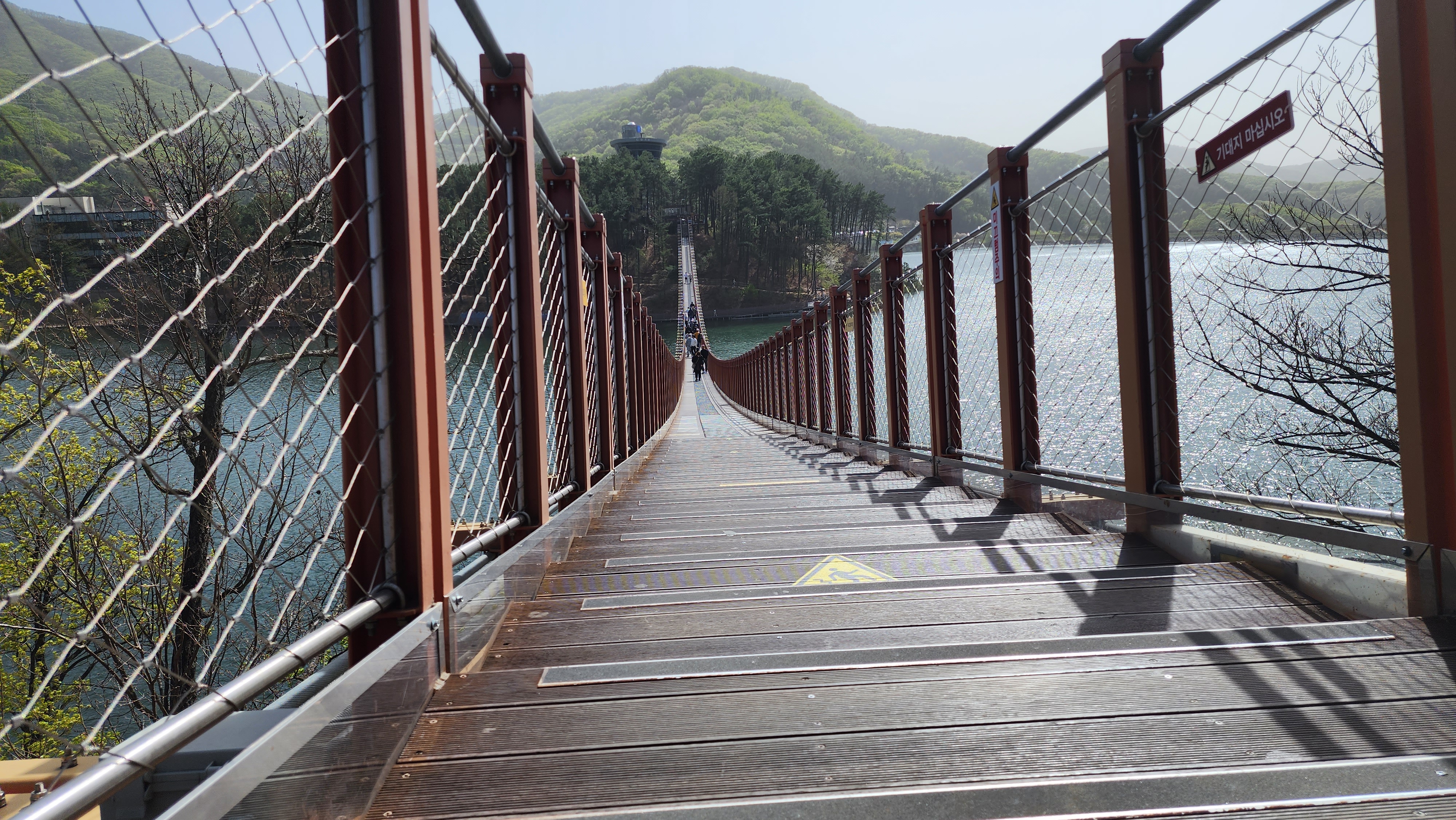 사진으로는 다리의 길이가 길어 보이지만 220m로 길지는 않고 다리 중간에는 호수 바닥이 보이는 강화유리 바닥으로 되어 있습니다. 다리의 흔들림은 거의 없을 정도로 안전한 다리였습니다.