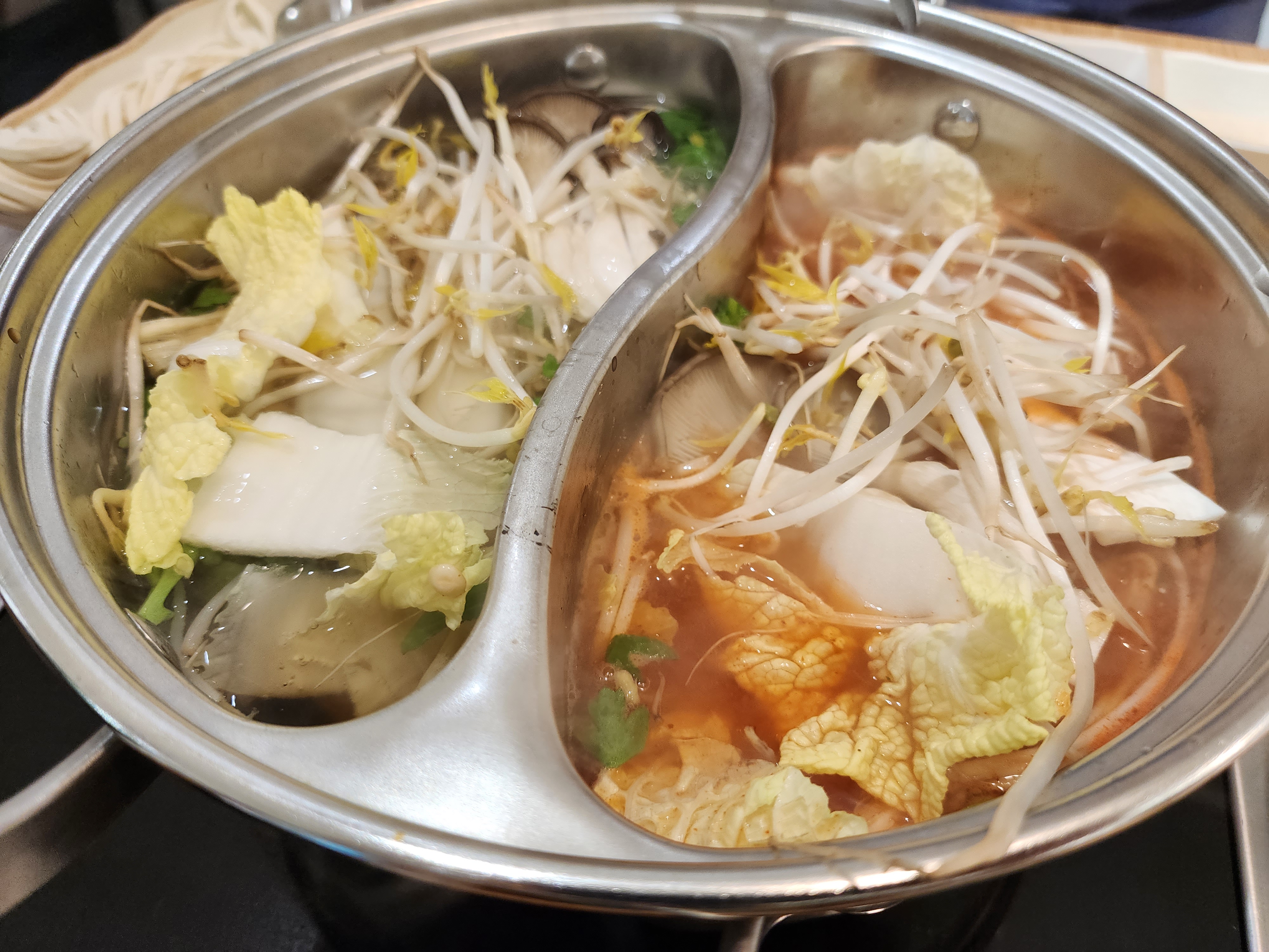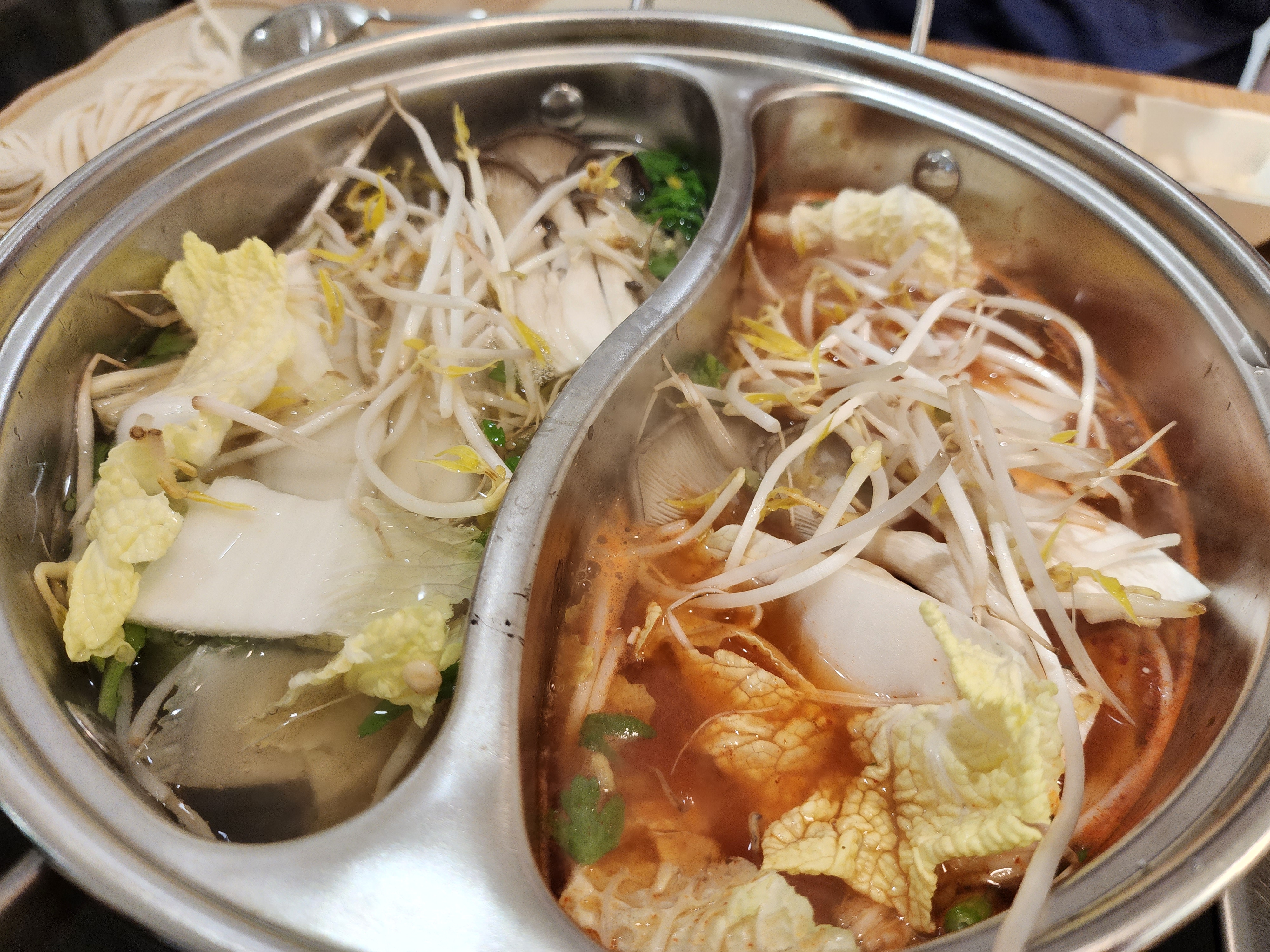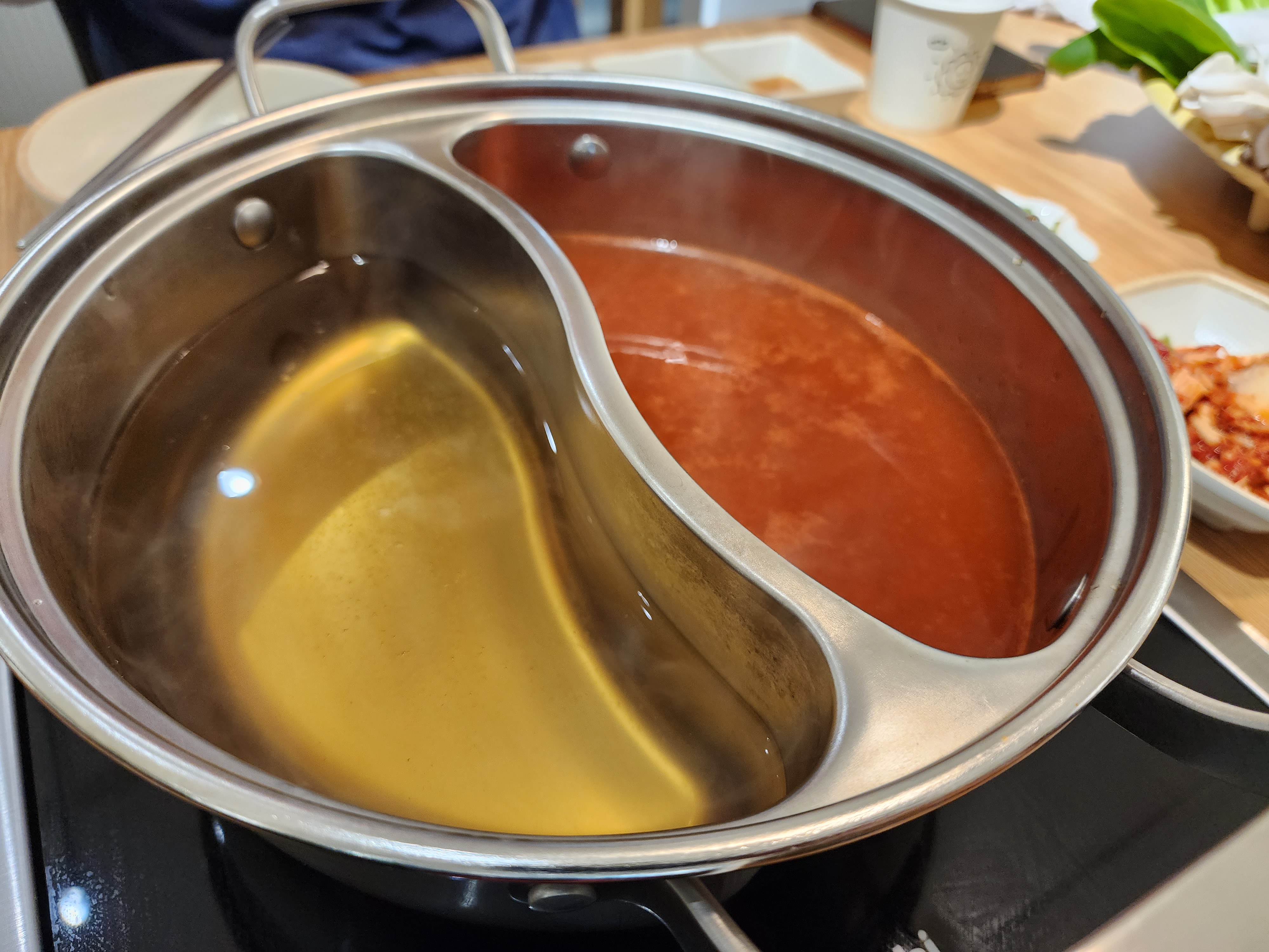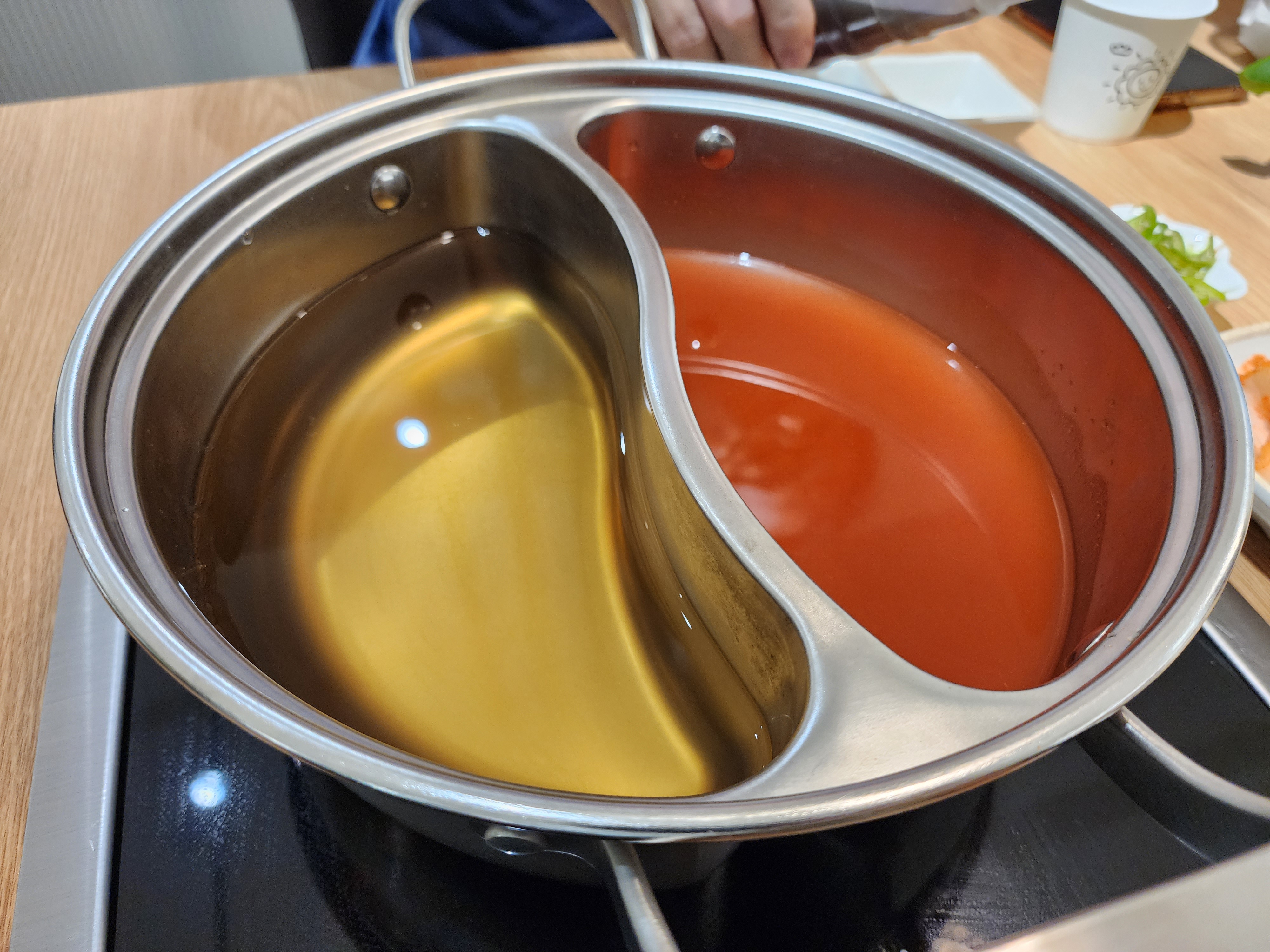 훠궈와 비슷한 구조로 된 냄비에 2가지 육수가 담겨 나왔습니다.