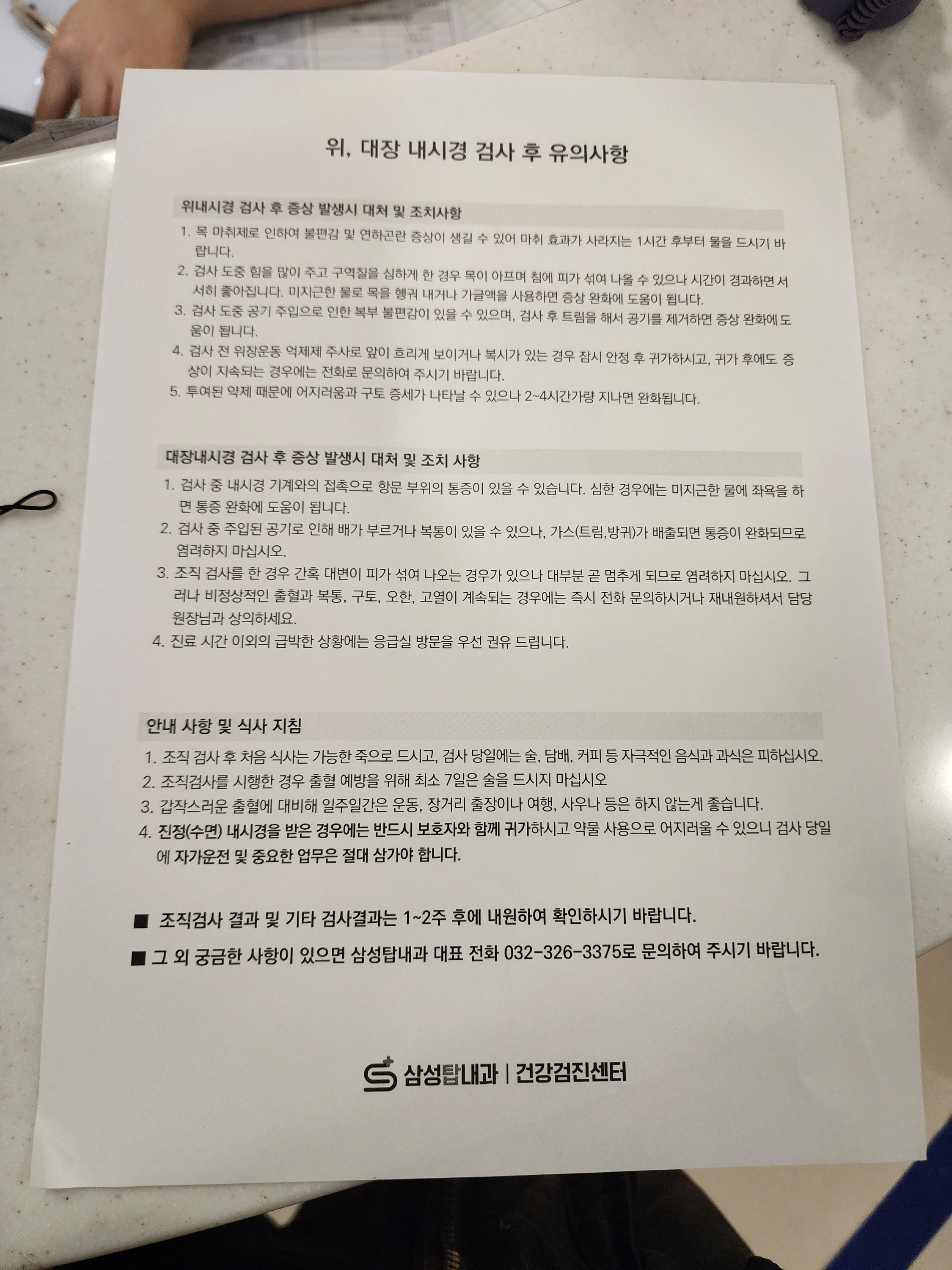위내시경 검사 후 증상 발생시 대처 및 조치사항
