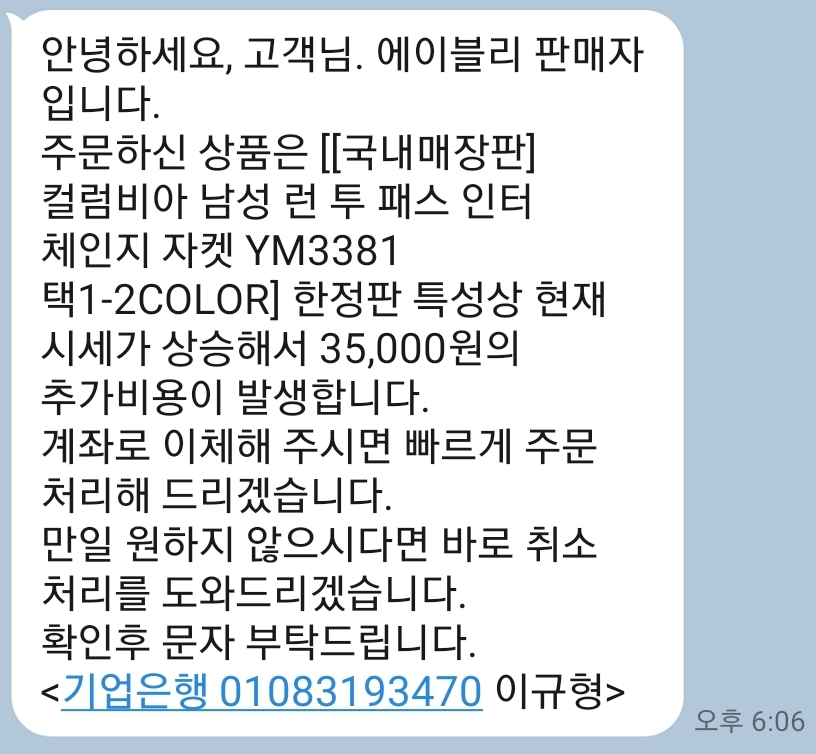 블랙프라이데이 기간에 매장을 다니다가 마음에 드는 자켓을 발견하고 구매 방법을 고민하고 매장이 아닌 온라인 쇼핑몰에이블리에서 구매를 했습니다. 에이블리에서 3만원 할인이 되었고 적립금까지 모두 사용하여 41만원 정도에 결제를 완료를 했습니다. 그런데 출고일에 판매자로부터 황당한 문자를 받게 됩니다. 인기 제품이라고 추가금을 달라고 하는 업체에 짜증이 났습니다. 이미 만들어진 옷이 시세에 따라 금액이 올라갔다고 했습니다. 이런 판매자를 어떻게 해야 될까요?