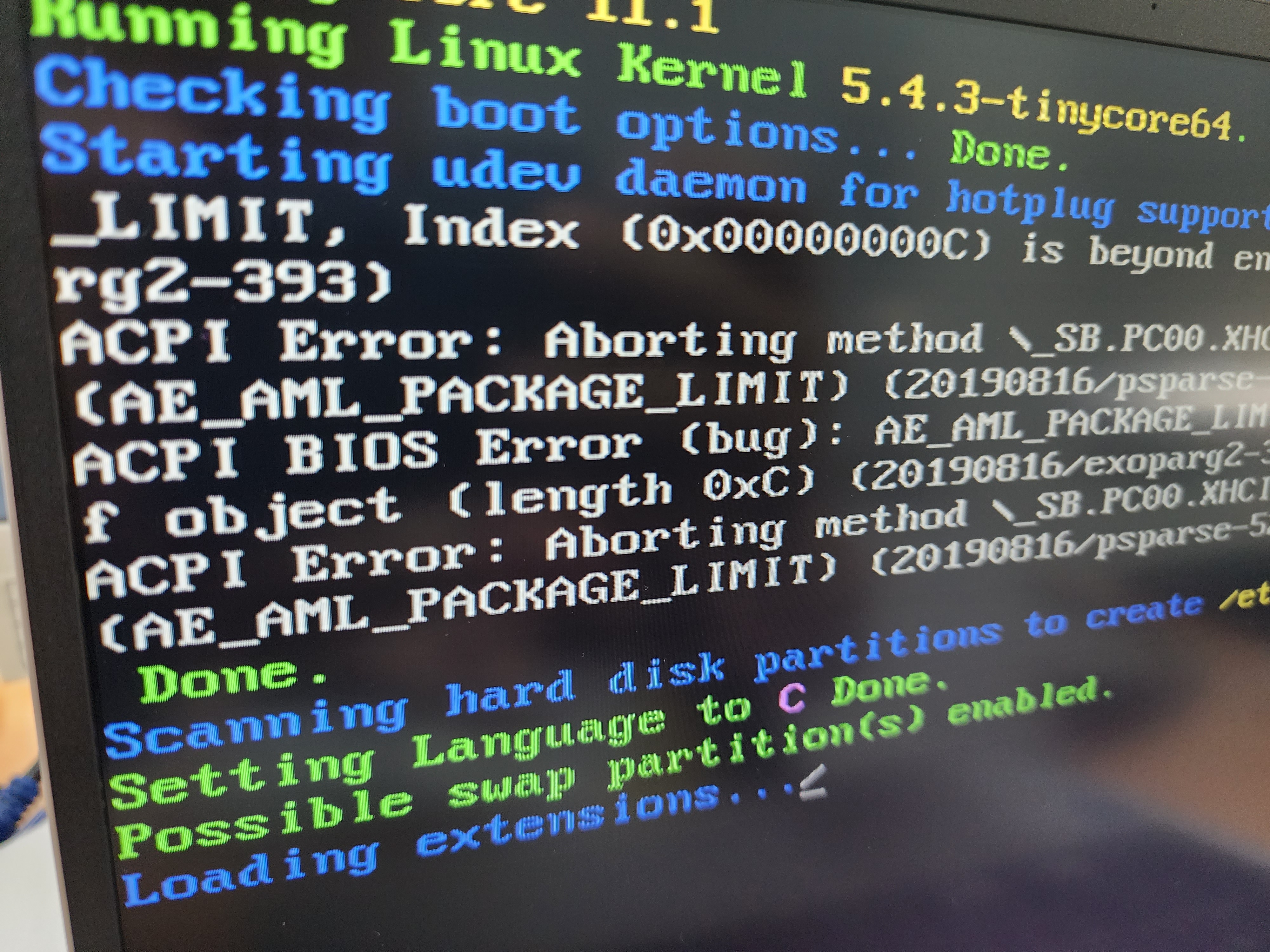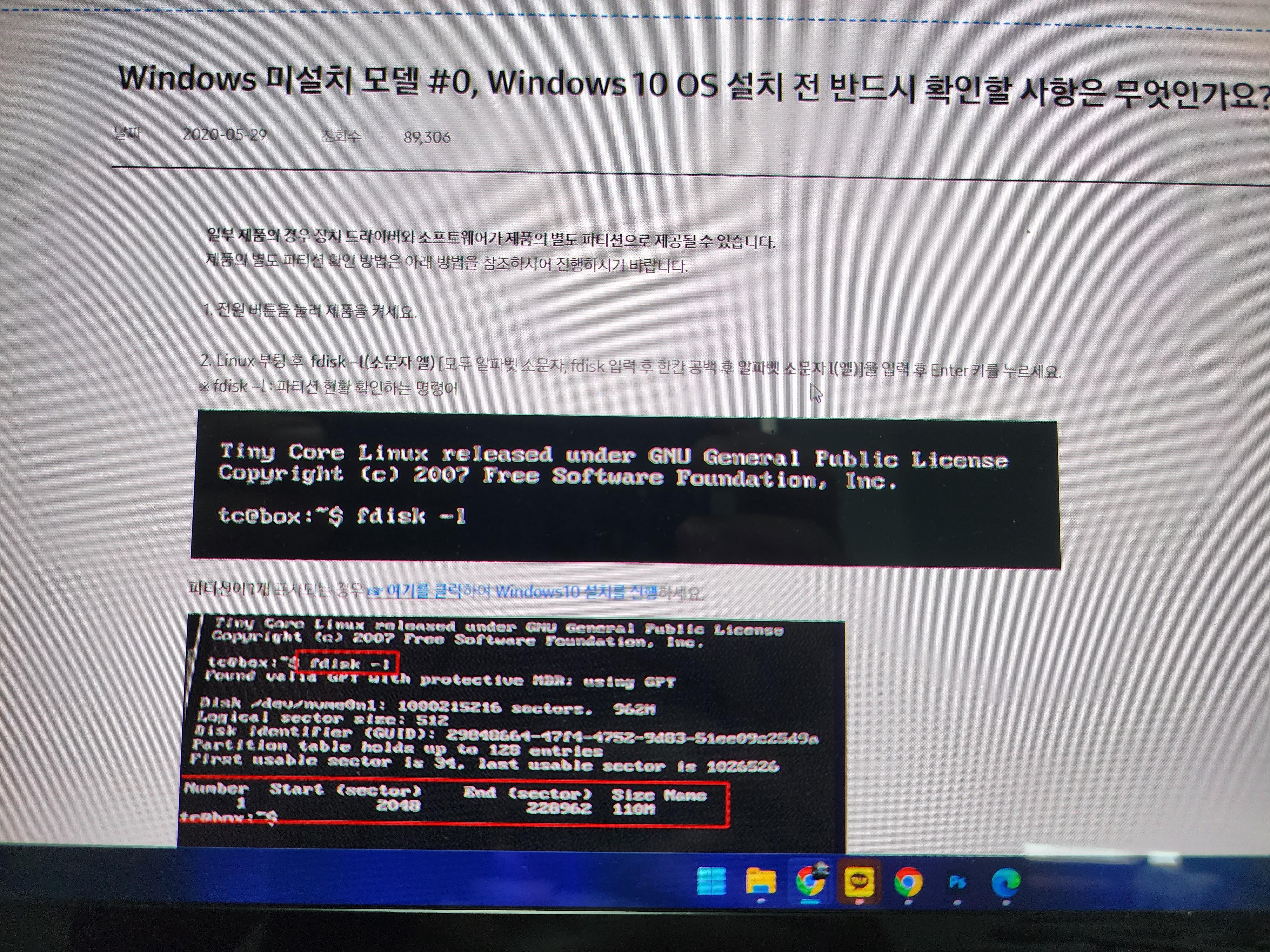 이런 메세지가 뜨고 나서 엔터를 치면 계속 'tc@box:~$' 같은 문구가 뜹니다. 당황스럽습니다. 부팅할 때 Linux 문구가 있어 리눅스 노트북 윈도우 설치라고 검색을 했더니 삼성서비스센터와 다른 몇 명의 블로그에서 나온 정보대로 해봤습니다.