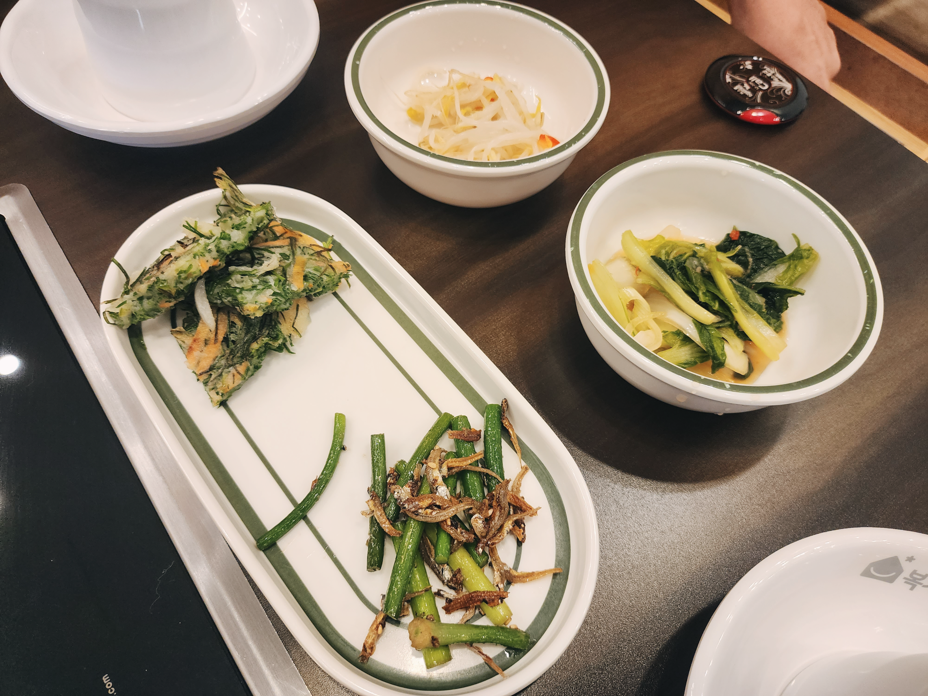 기본메뉴로 멸치마늘쫑, 부추전, 물김치가 나옵니다.