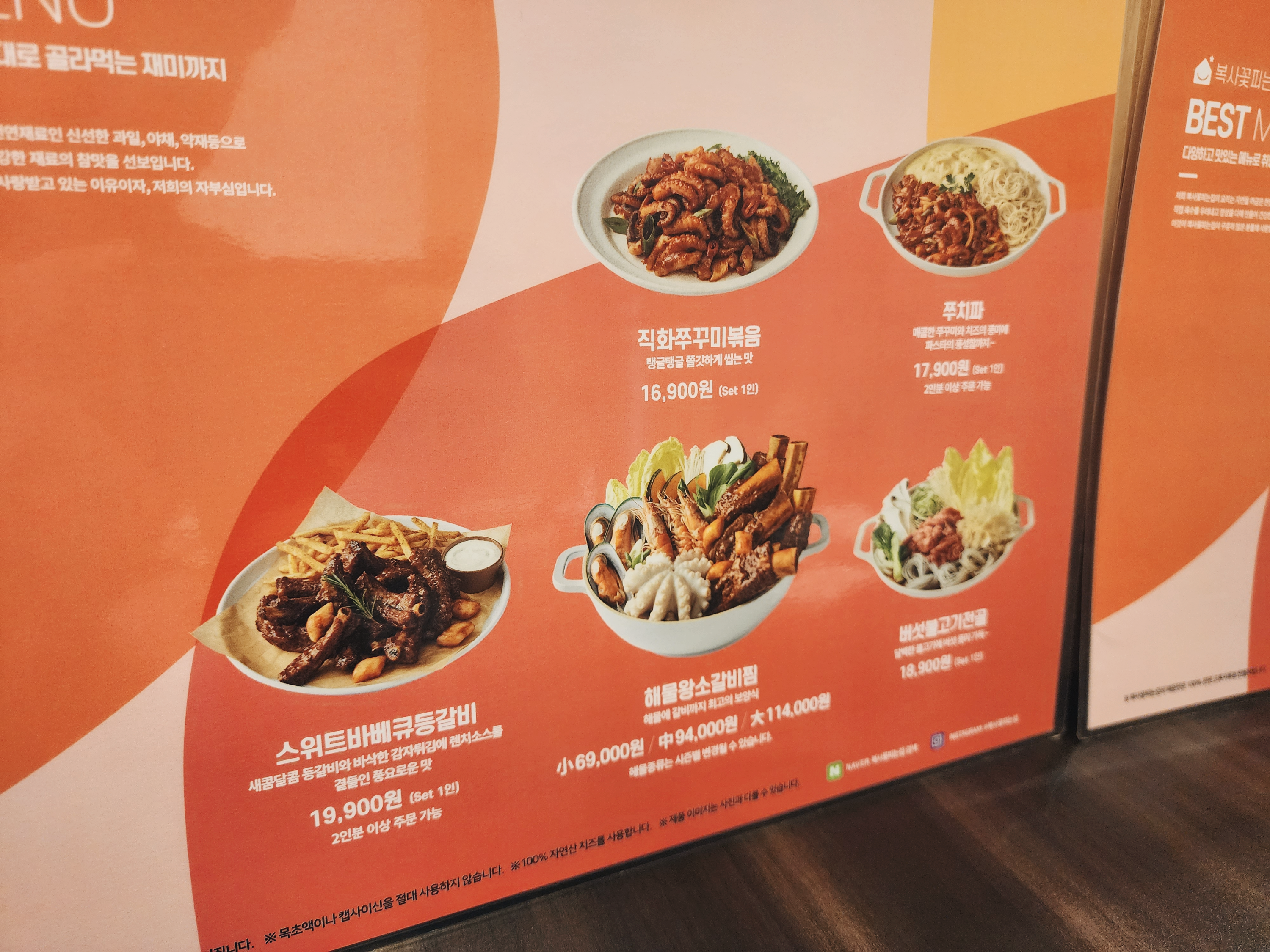 • 메뉴가 다양하고 구성이 좋습니다. (직화메뉴,버섯불고기전골,바베큐등갈비,갈비찜,치즈돈가스,스파게티,새우튀김)