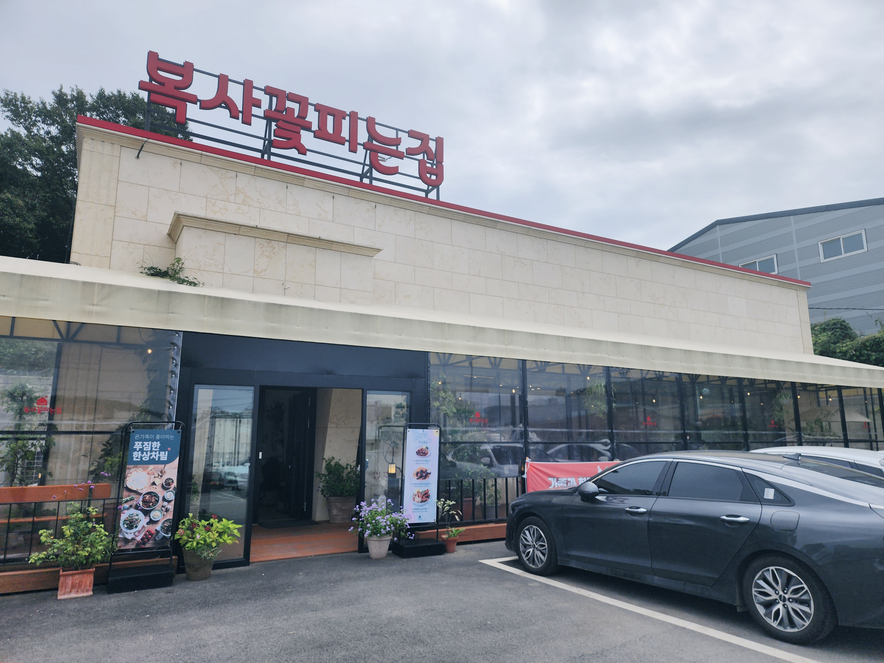 복사꽃피는집은 체인점으로 몇 개가 있는데 처음 가본 곳은 송산점이었습니다. 한적한 길가에 있어 손님이 있을까 싶었는데 웨이팅을 해야 될 정도로 소문이 난 곳 같습니다. 건물 앞마당에 50대 이상 주차를 할 수 있는 넓은 주차장이 있습니다.