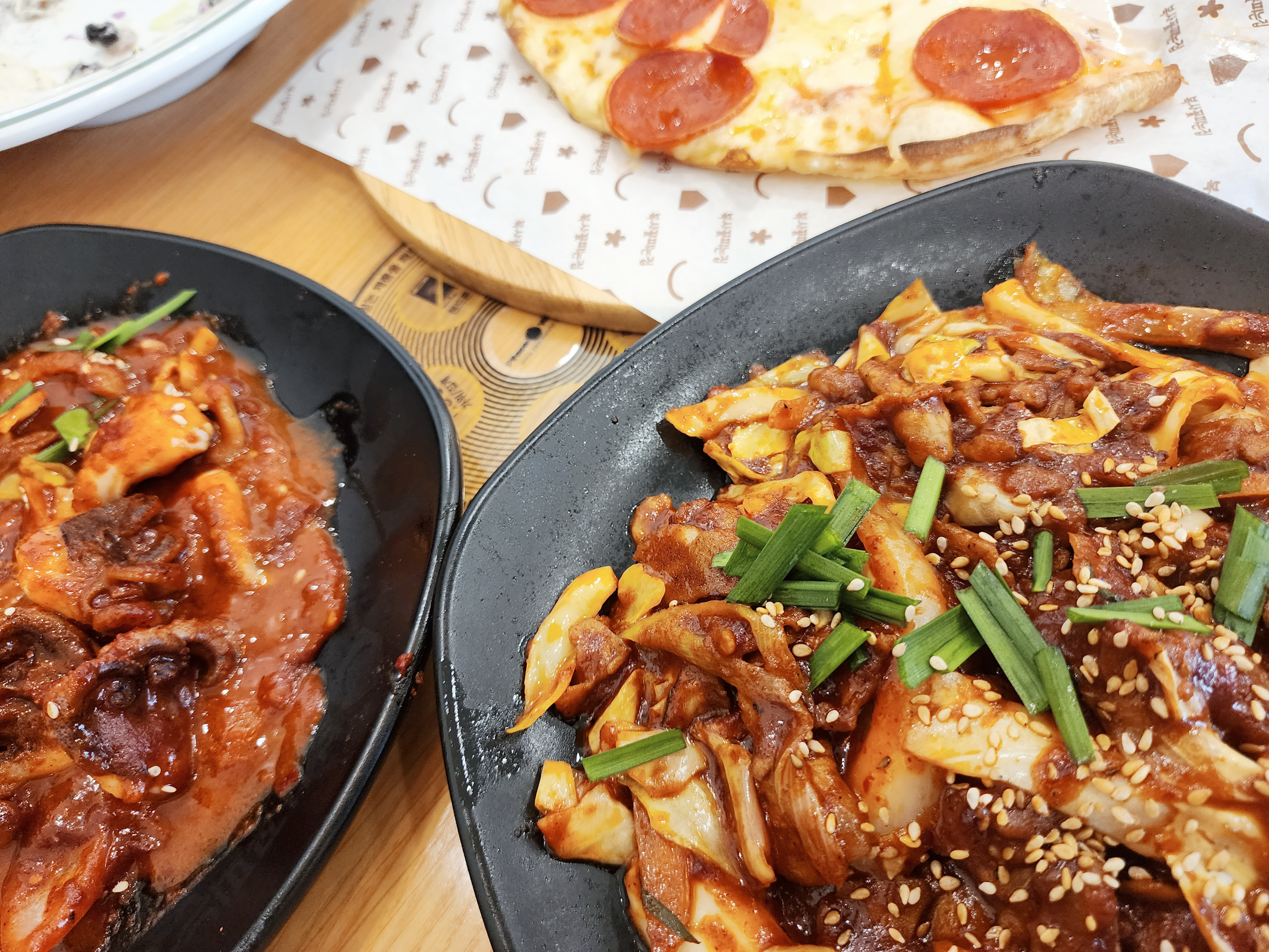 바베큐등갈비가 먹고 싶어 다음에 먹어보기로 했습니다.기본메뉴로 멸치마늘쫑, 부추전, 물김치가 나옵니다.비빔밤처럼 먹을 수 있게 대접에 나옵니다.샐러드 괜찮습니다.직화제육볶음직화쭈꾸미볶음페페로니피자카페테리아커피를 마실 수 있고 남은 피자 포장이 됩니다.