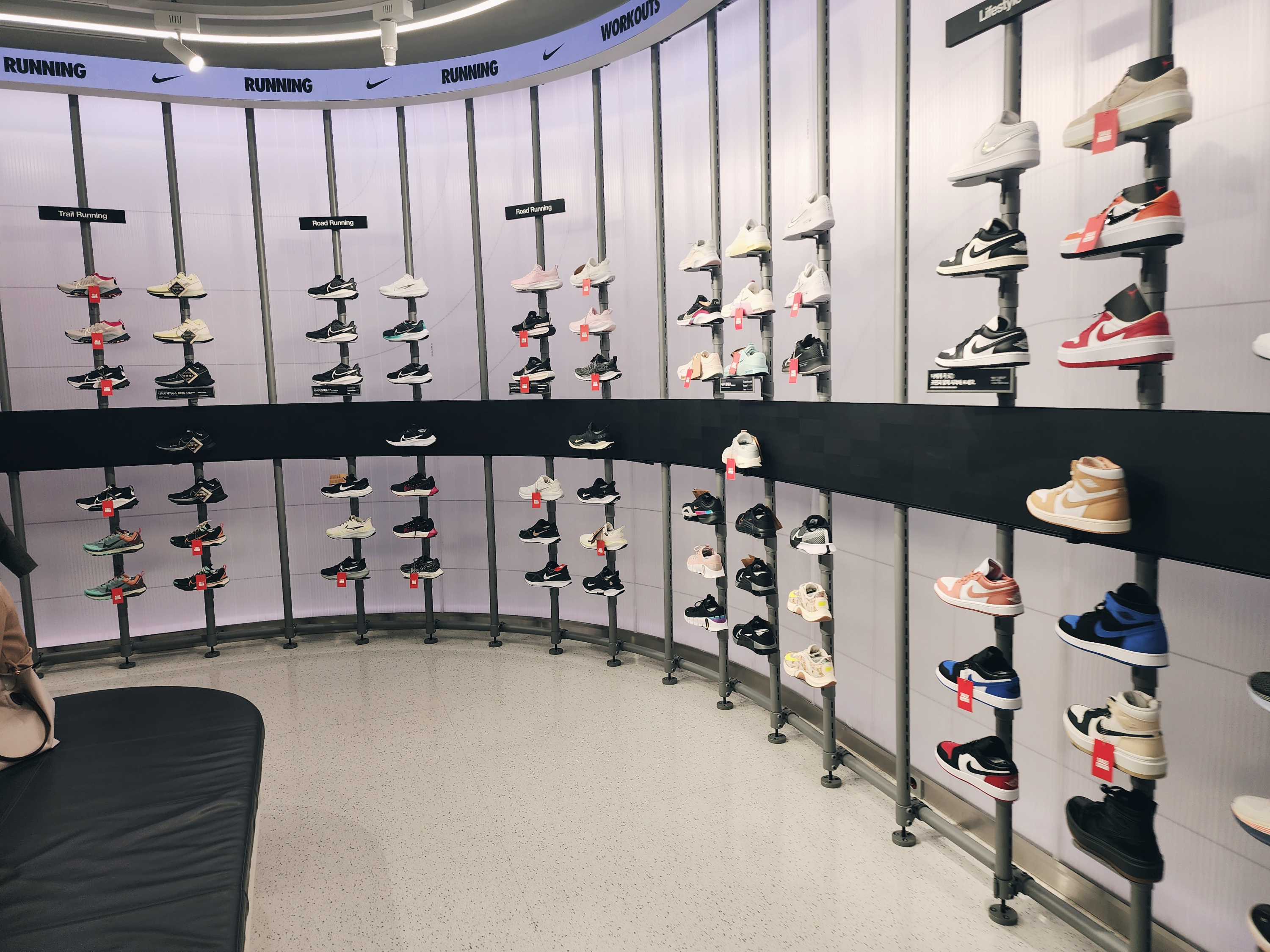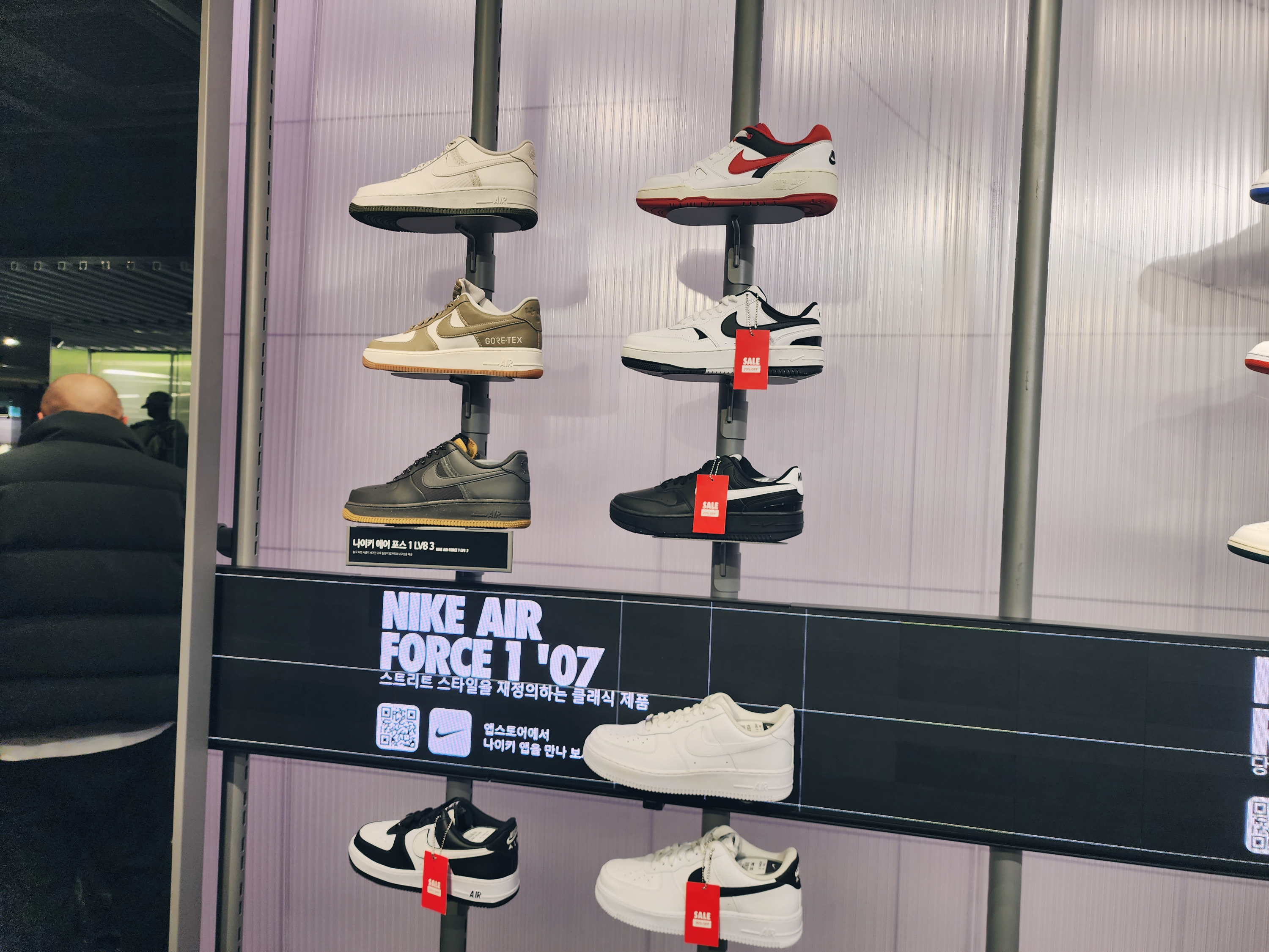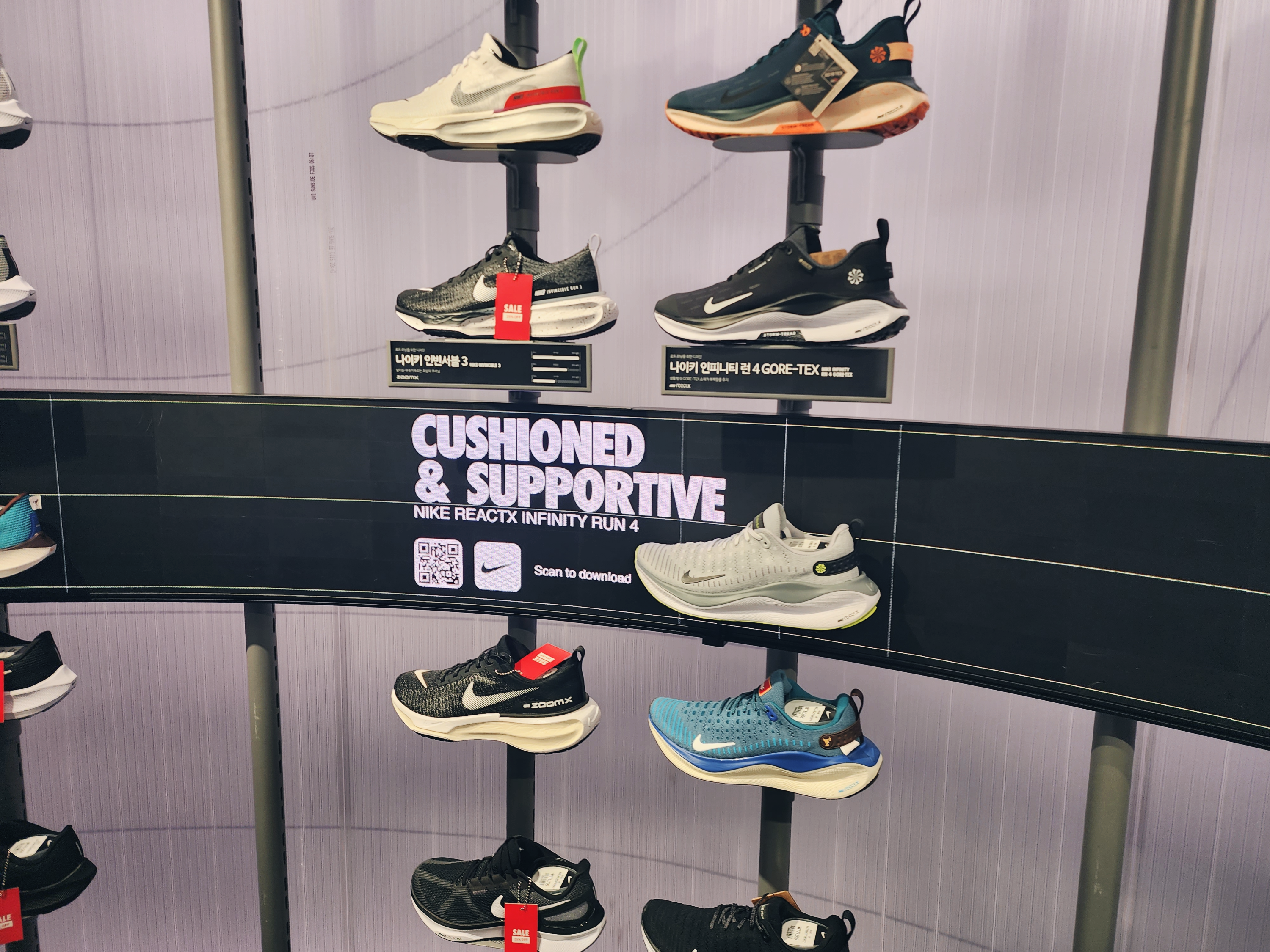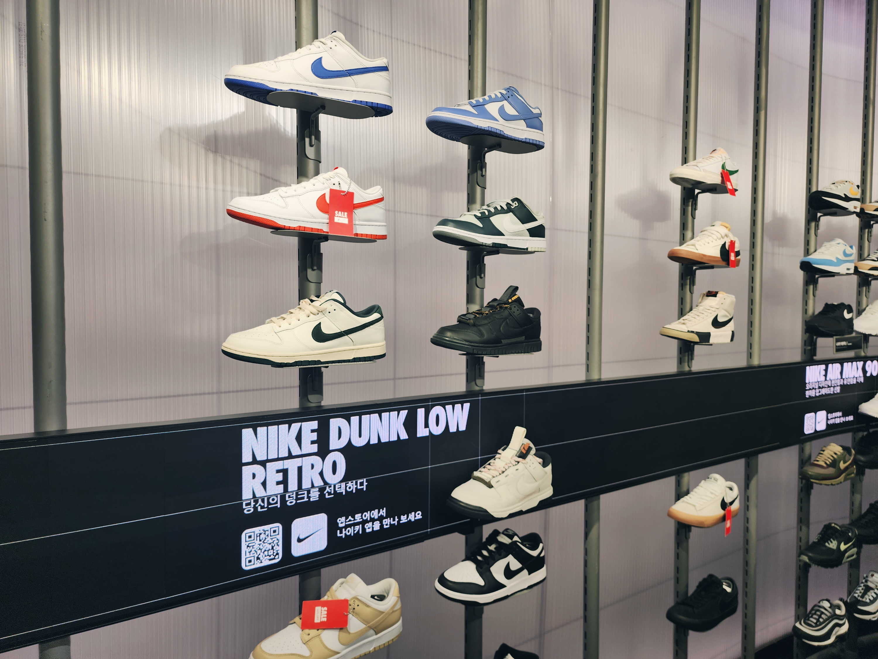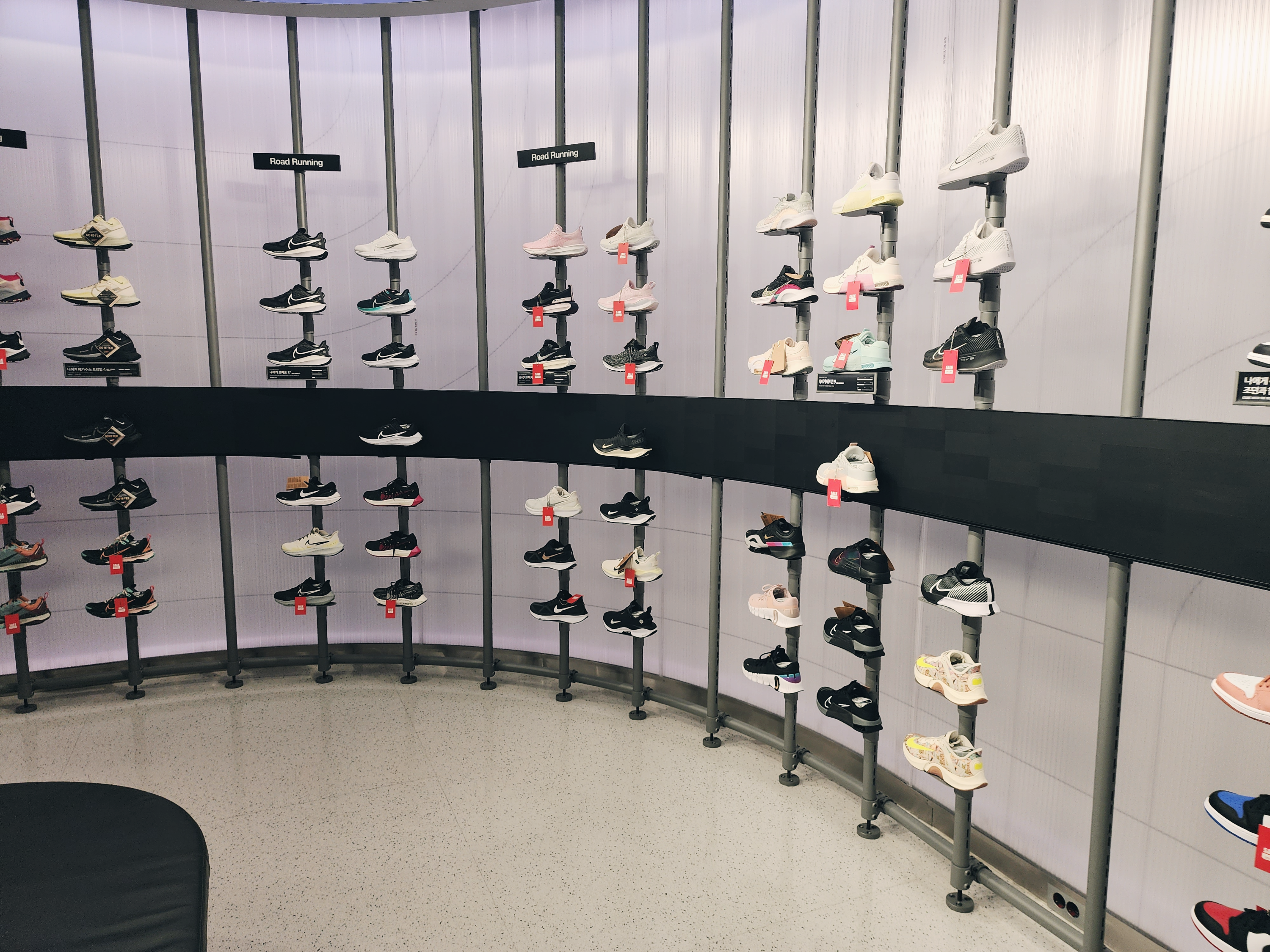 이렇게 1층에는 커스텀을 할 수 있는 매장이 있었고 2층부터는 일반 매장으로 다른곳보다 종류가 더 많았습니다. 2층에는 여성슈즈가 있고 입구에는 행사판매상품이 있습니다. 나이키앱에서 행사하는 모델은 거의 입구 쪽에 있었습니다.