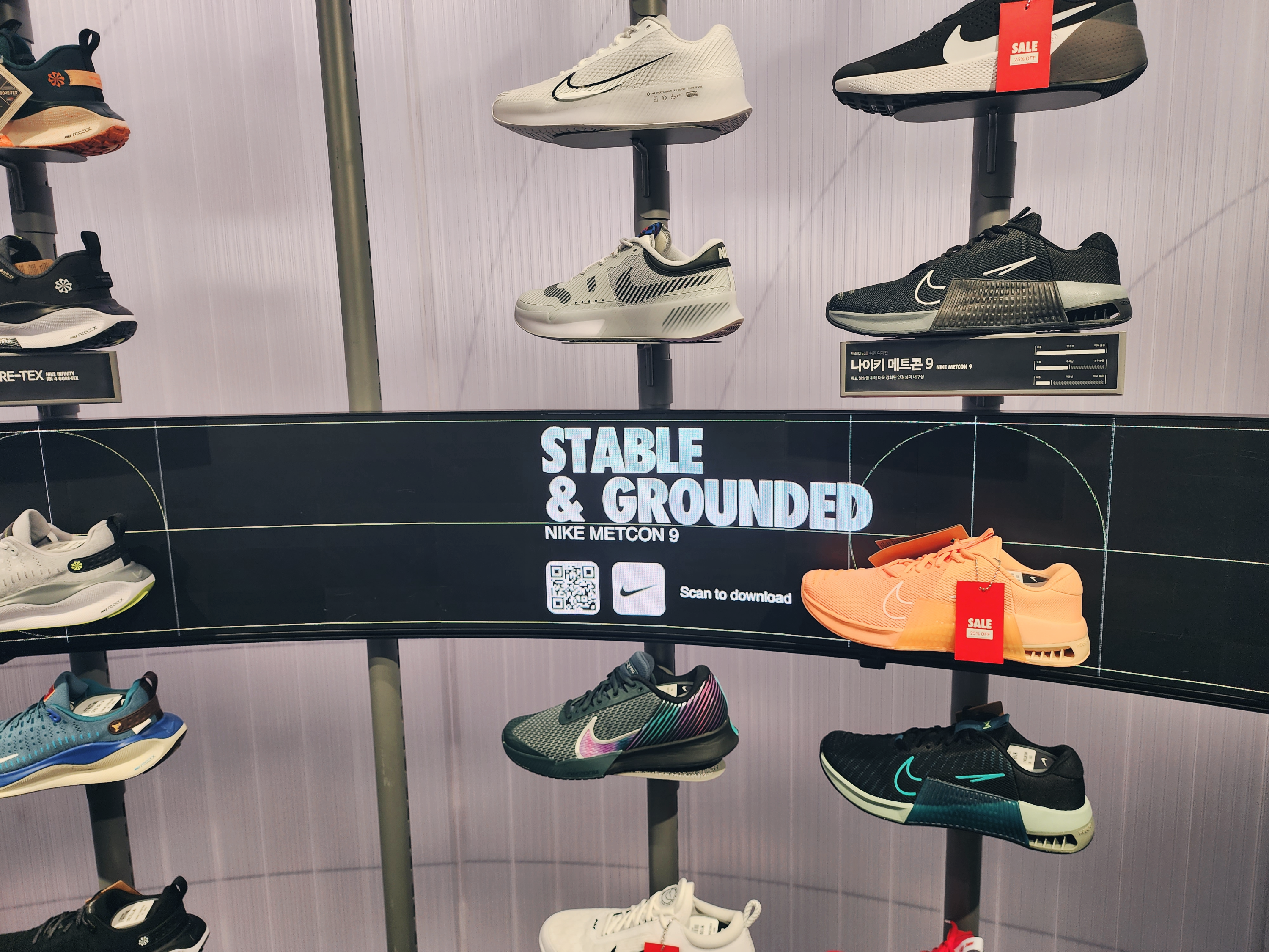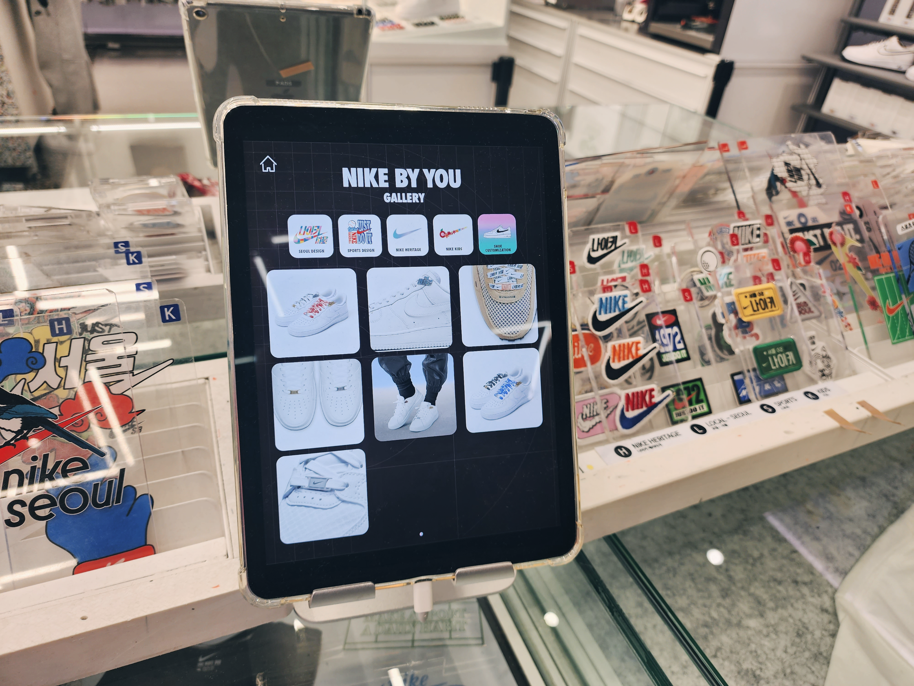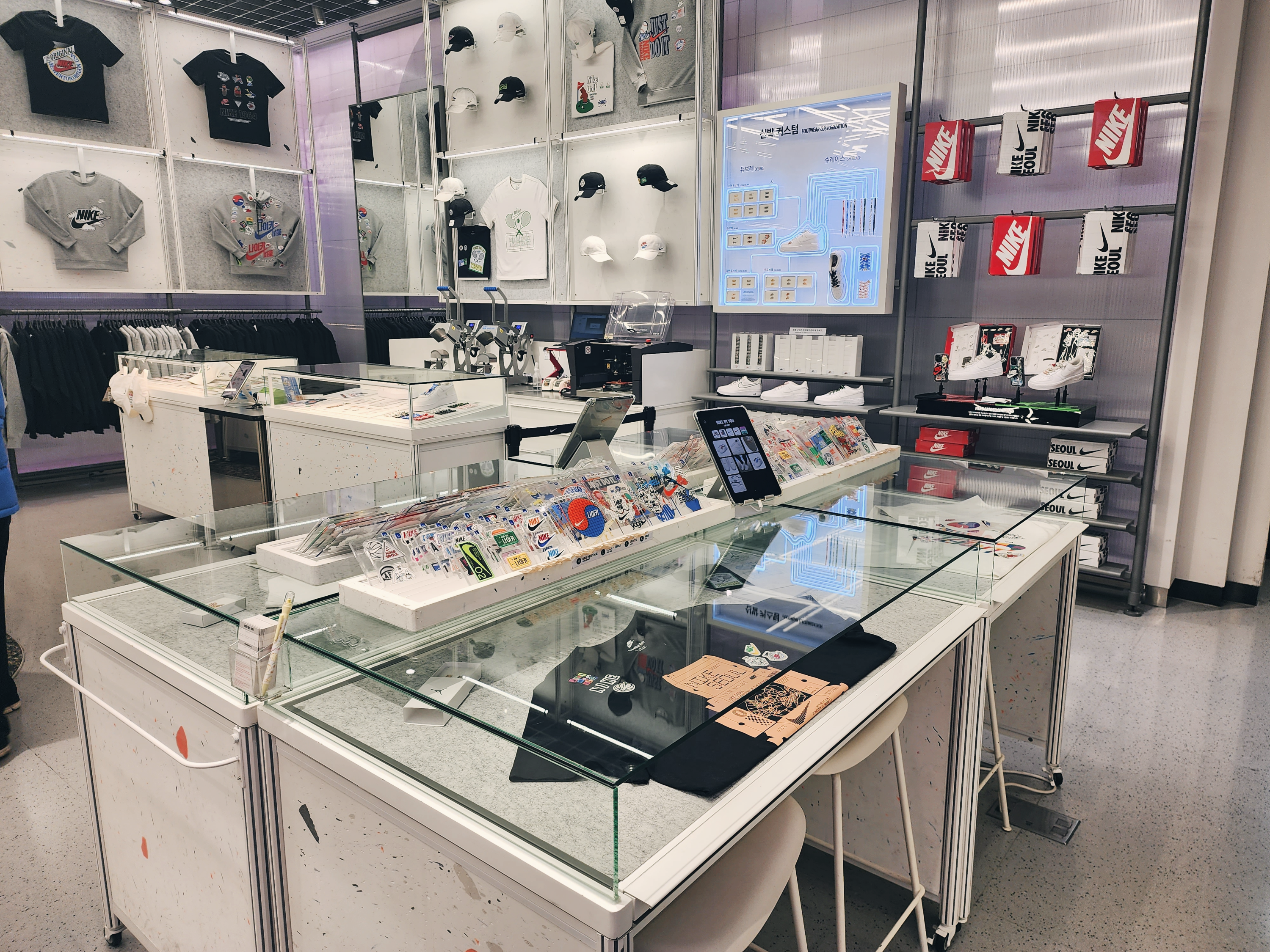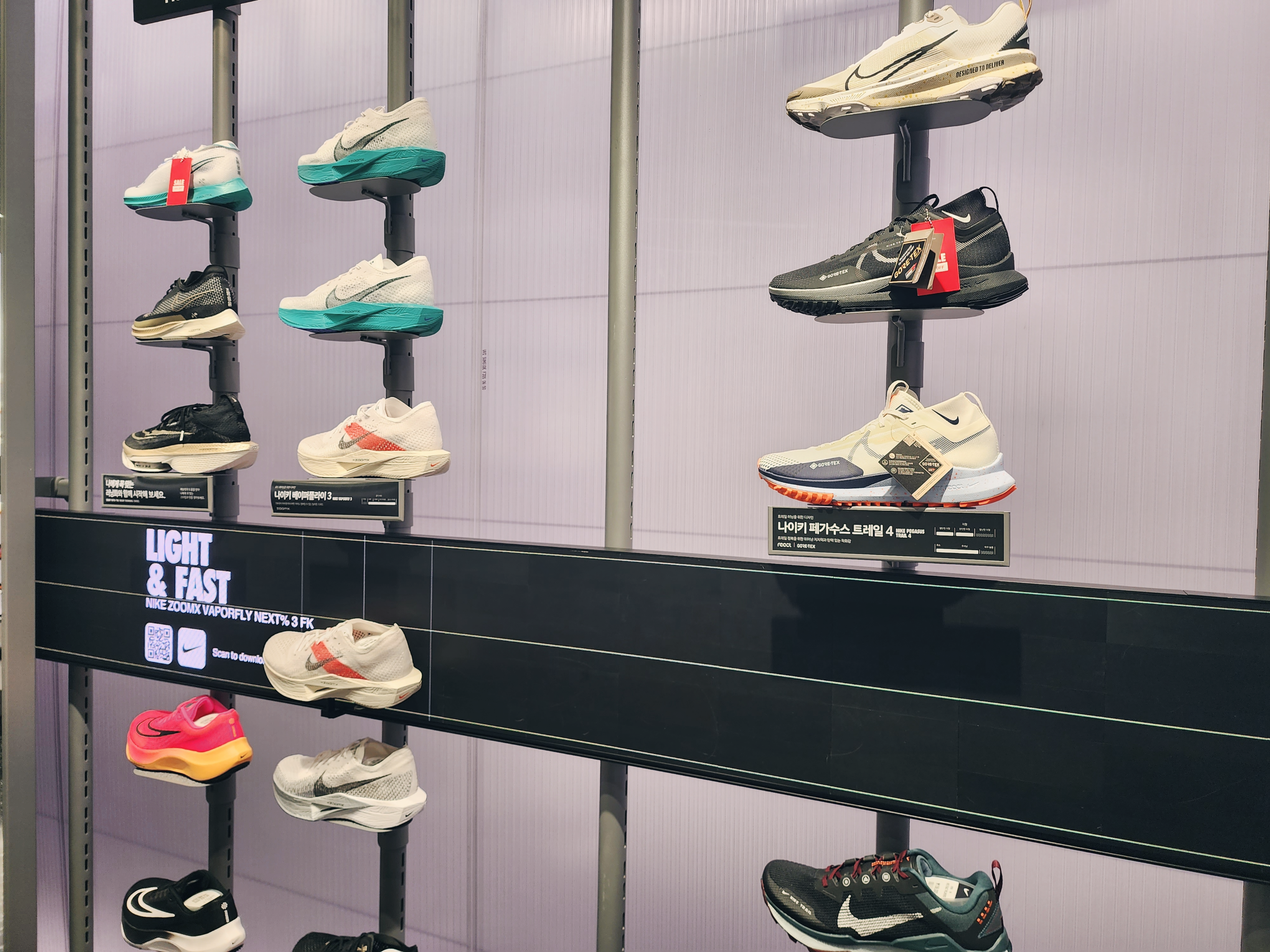 이렇게 1층에는 커스텀을 할 수 있는 매장이 있었고 2층부터는 일반 매장으로 다른곳보다 종류가 더 많았습니다. 2층에는 여성슈즈가 있고 입구에는 행사판매상품이 있습니다. 나이키앱에서 행사하는 모델은 거의 입구 쪽에 있었습니다.