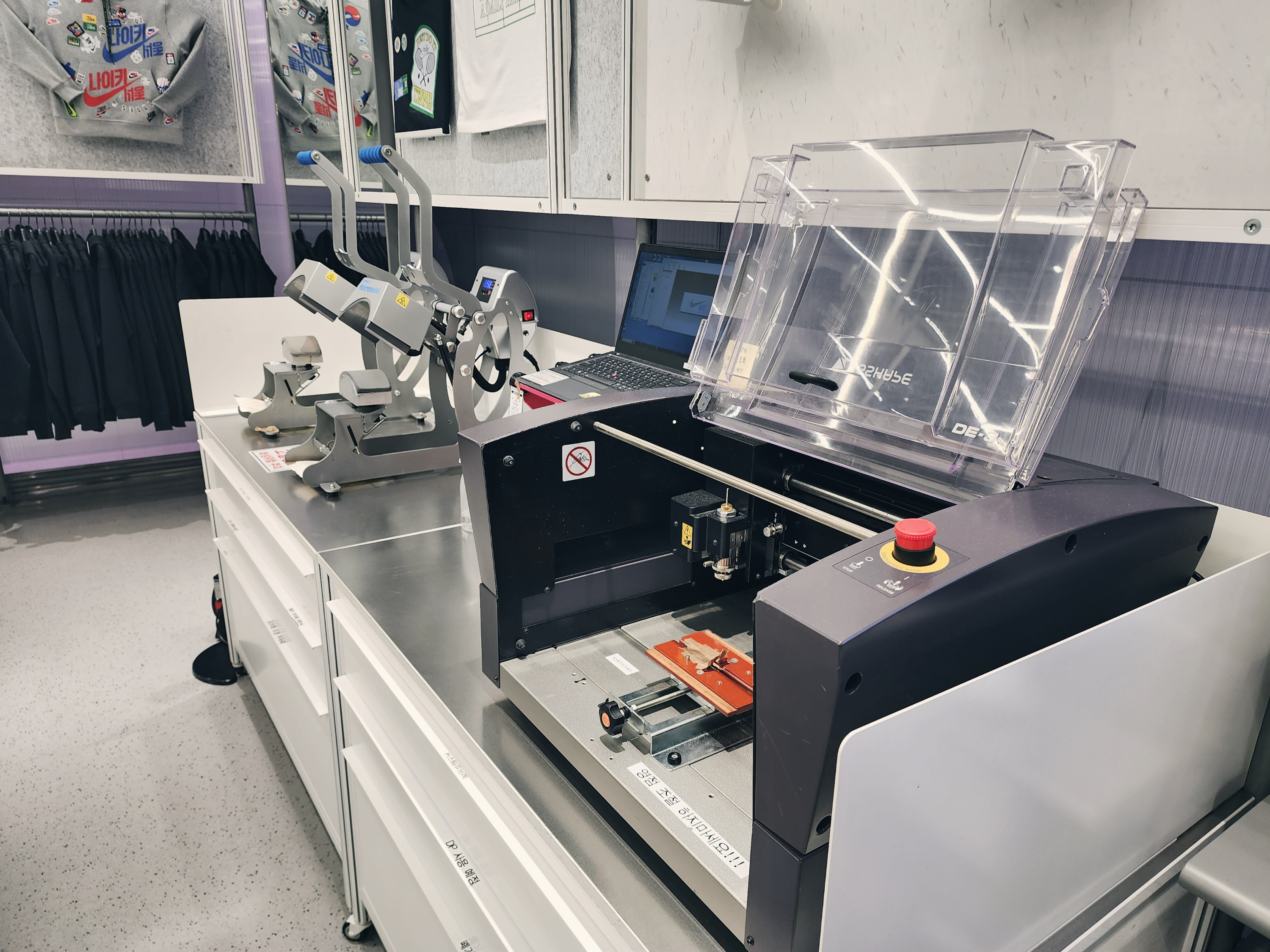 모자에 쓰는 열프레스가 있고 레이저 각인기가 있었고 이 곳은 스태프만 출입이 가능했습니다. 사진은 최대한 가까이에서 찍어봤습니다.