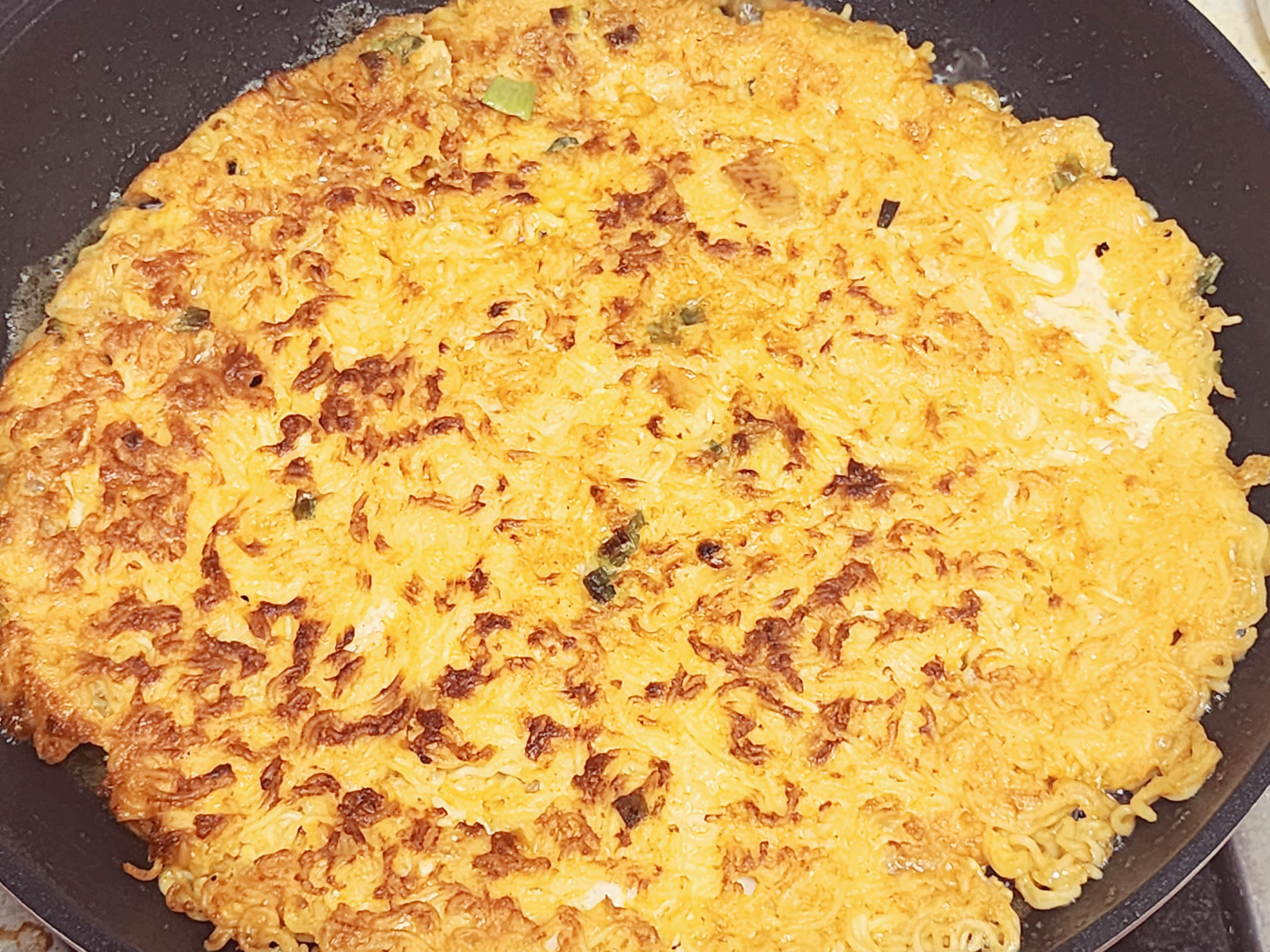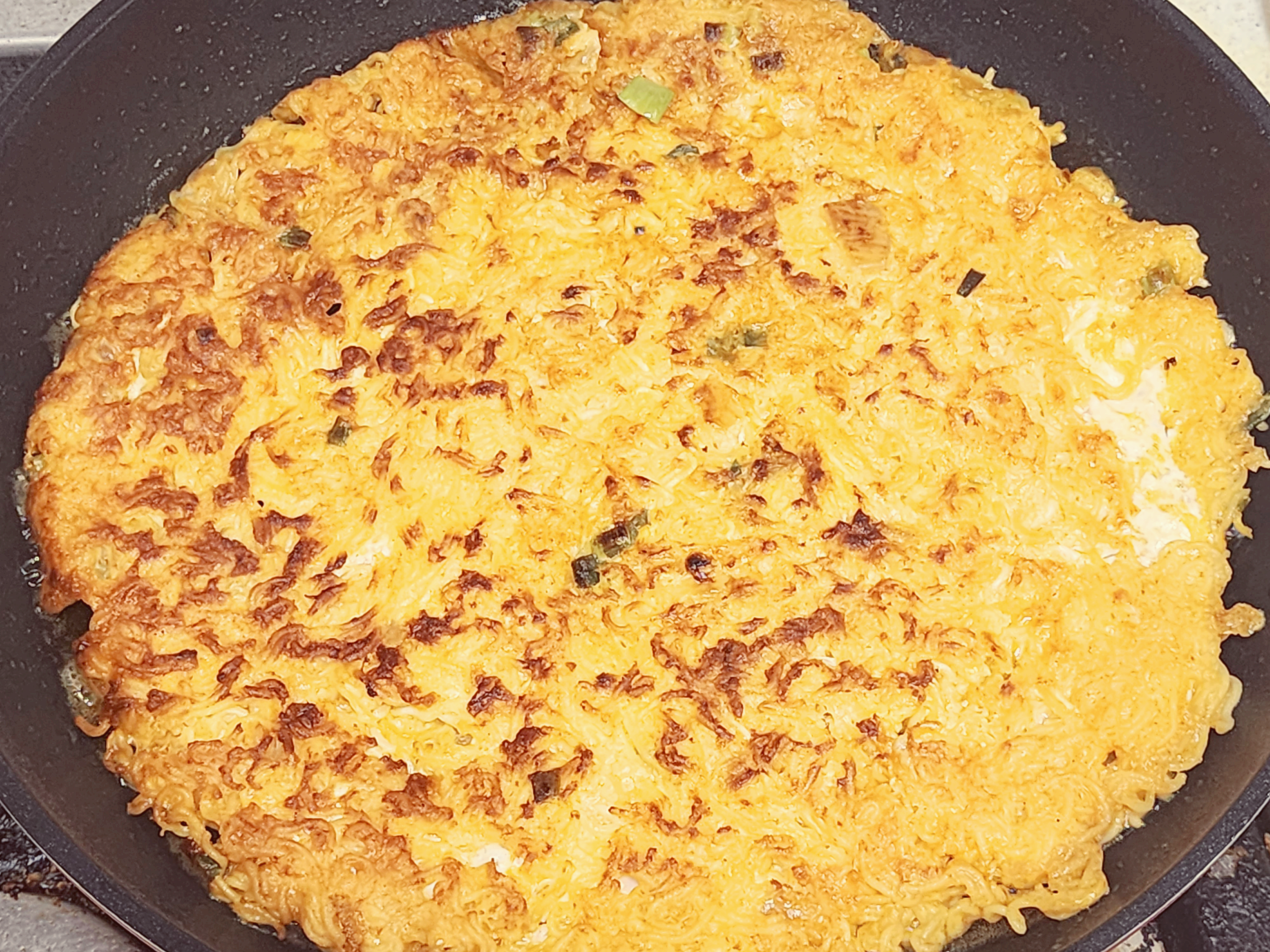 다른 전이나 부침과는 달리 기름의 양이 많이 들어갑니다. 프라이팬바닥이 보이지 않을 정도로 식용유를 넉넉히 넣습니다. 달궈진 프라이팬에 라면 용기에 있는걸 한번에 모두 넣습니다. 프라이팬이 26cm 이상으로 된 프라이팬이 좋습니다. 작은 프라이팬은 두꺼워집니다. 26~28cm 정도가 적당합니다.