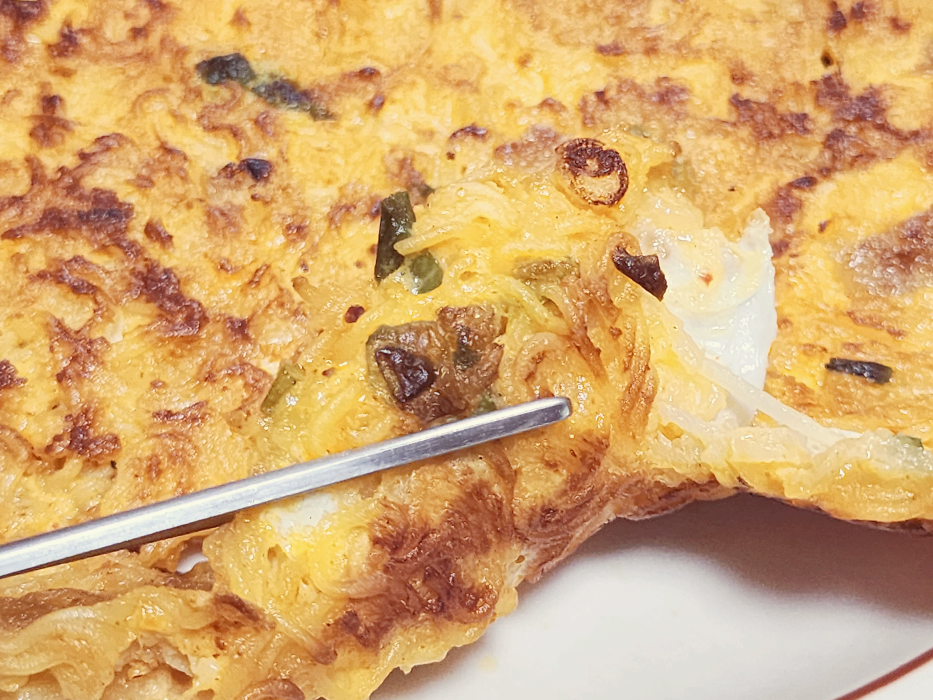 끈기 있게 기다려야 합니다. 불이 셀 경우 바닥이 탈 수 있으니 중간불 이하로 4~5분정도 기다린 후 뒤집게로 살짝 들어 올렸을 때 쳐지지 않는지 확인을 해봅니다. 쳐지지 않으면 그때 뒤집어 줍니다. 기름을 많이 넣기 때문에 프라이팬 스냅으로 뒤집게 없이 하면 기름이 튈 위험이 있으니 꼭 뒤집게를 이용합니다.