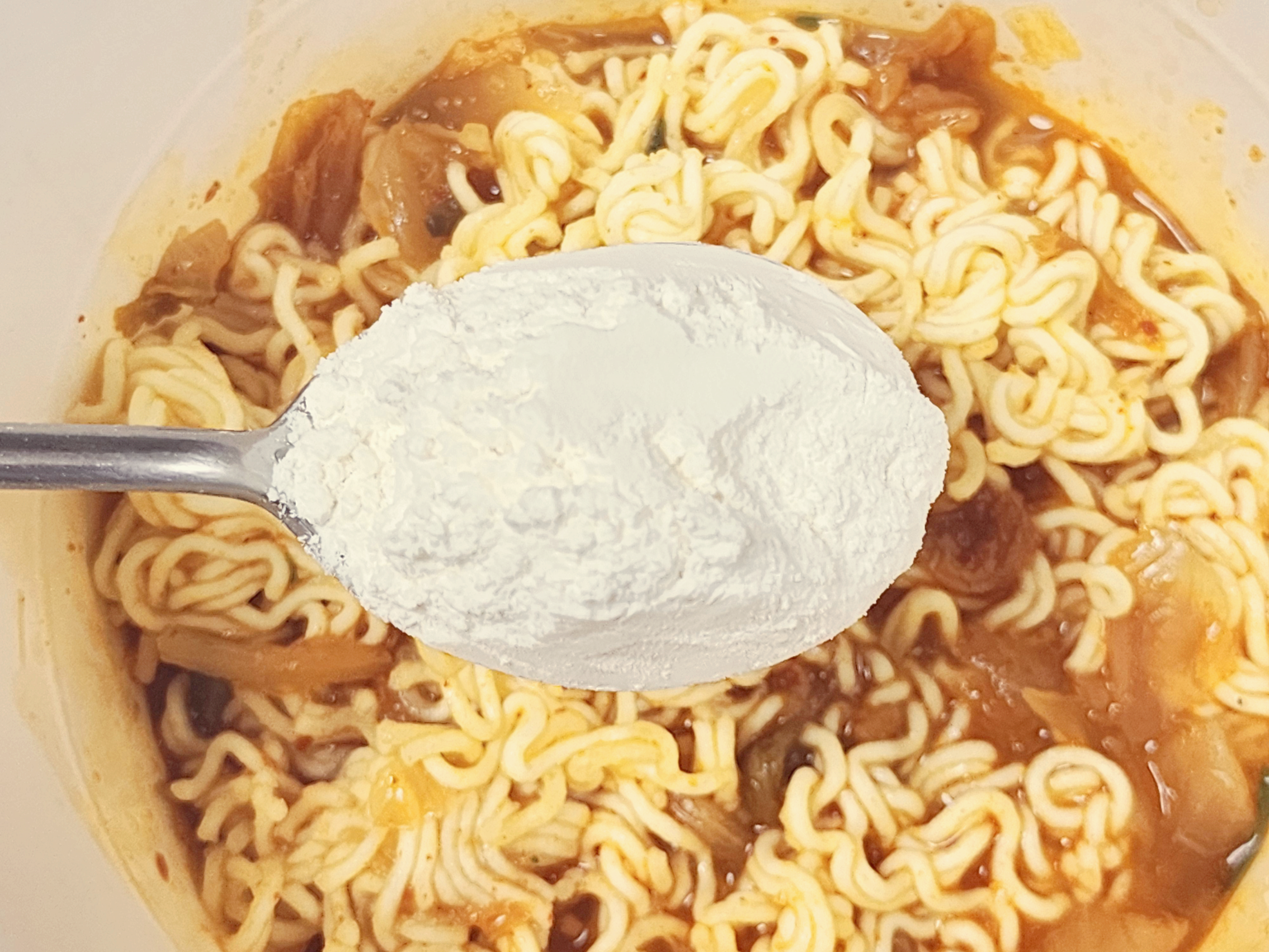 뜨거운 물을 라면이 잠길 정도로 넣어줍니다. 물을 많이 넣게 되면 밀가루의 점성이 약해져 밀가루를 많이 넣어야 하기 때문에 라면이 잠길정도로 넣고 30초정도 기다려줍니다. 뚜껑을 덮고 30초간 기다립니다.