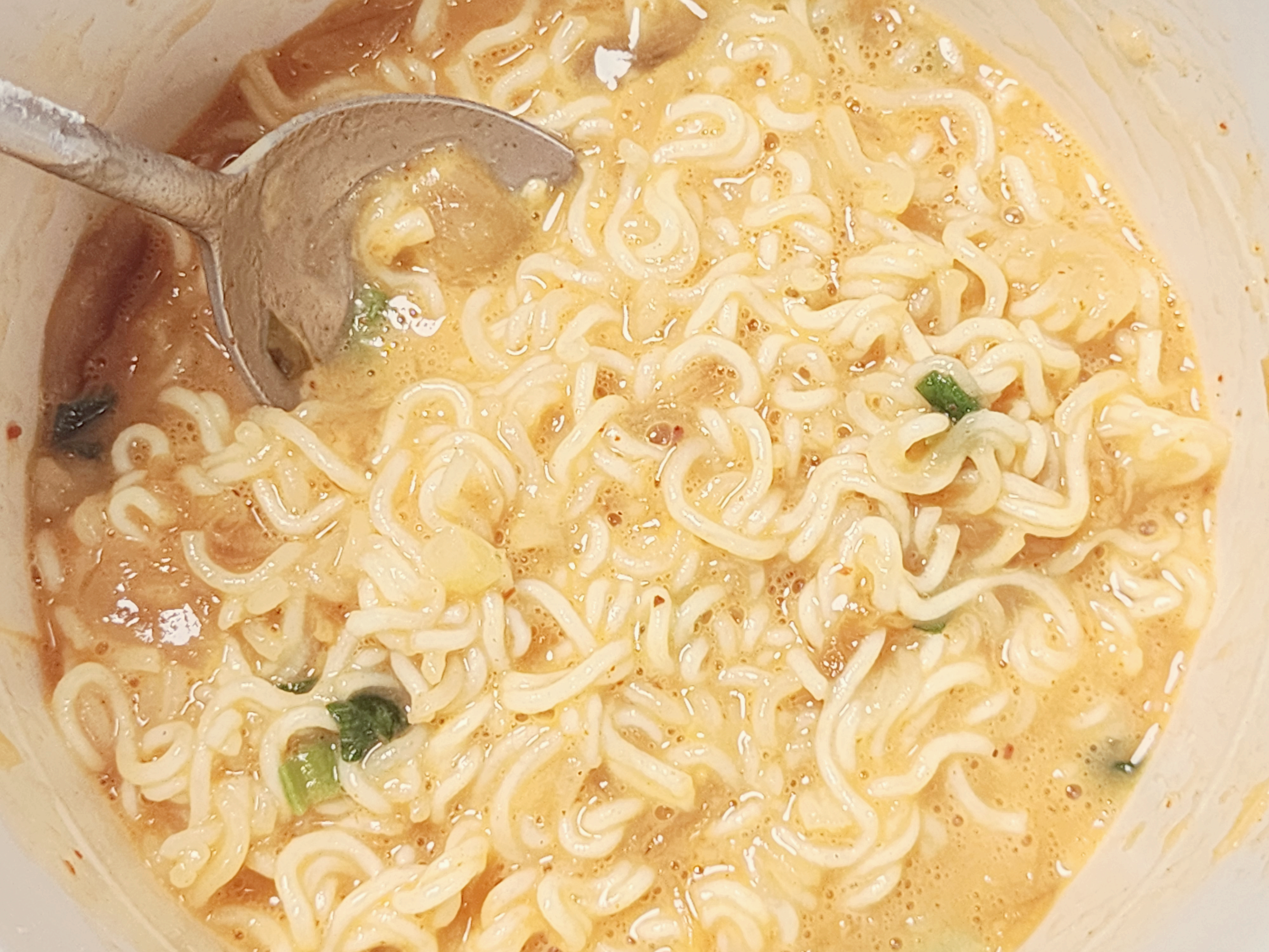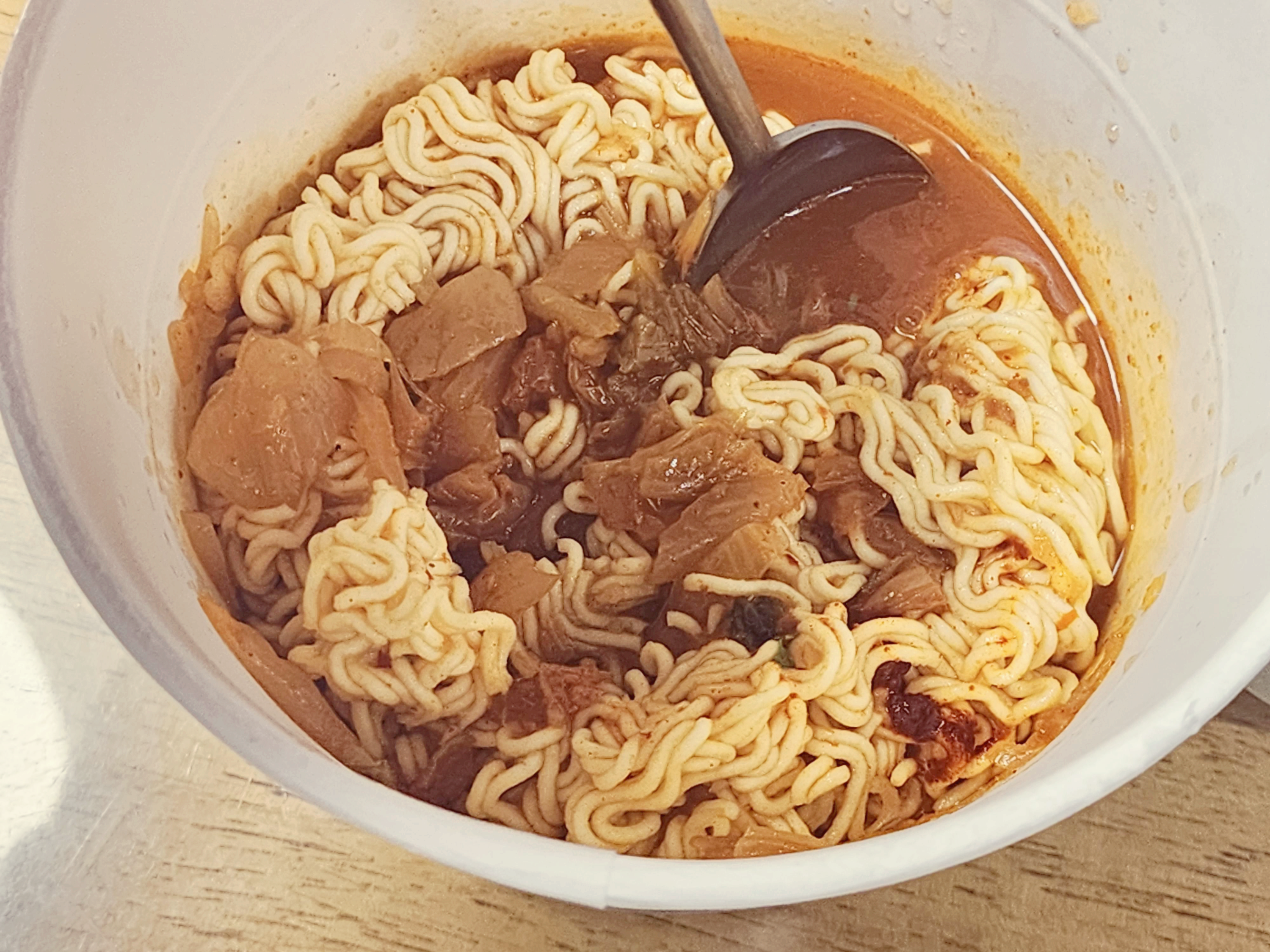 라면이 익으면 쉽게 잘리지 않기 때문에 물을 붇고 1분정도 뒤에 숟가락으로 면을 잘라줍니다. 용기가 찢어지지 않을 정도로 잘라주면 됩니다. 면을 자르고 뚜껑을 덮지 않고 2분정도 기다려 주세요. 뚜껑을 덮지 않아야 계란이 익는 것을 방지합니다.