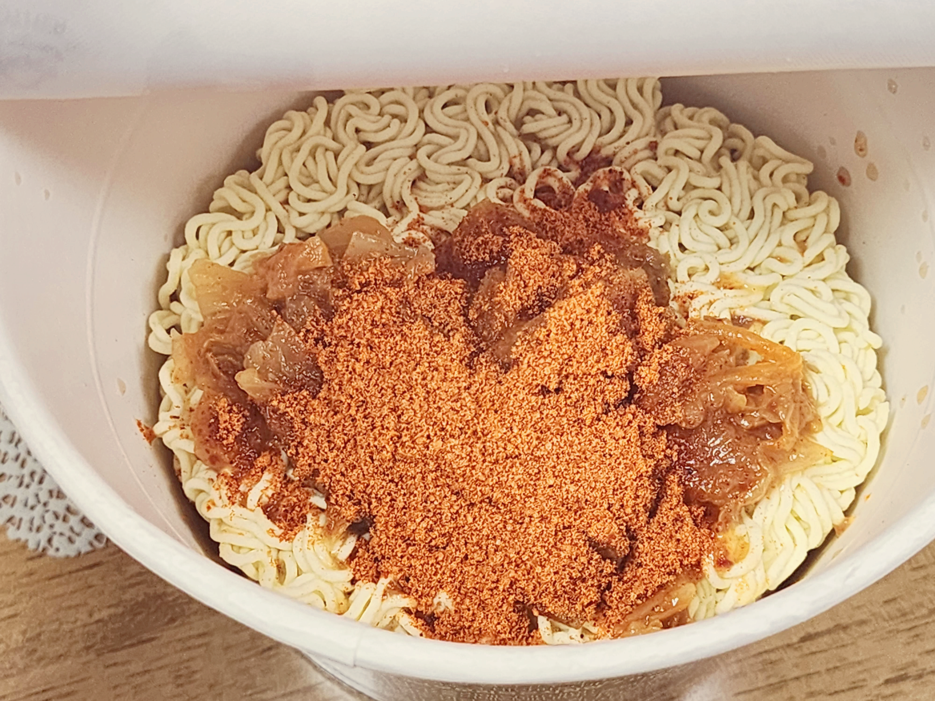 사발면에 스프와 김치가 들어가 있습니다. 김치는 다 넣고 스프는 위에 말한대로 절반정도만 넣습니다.