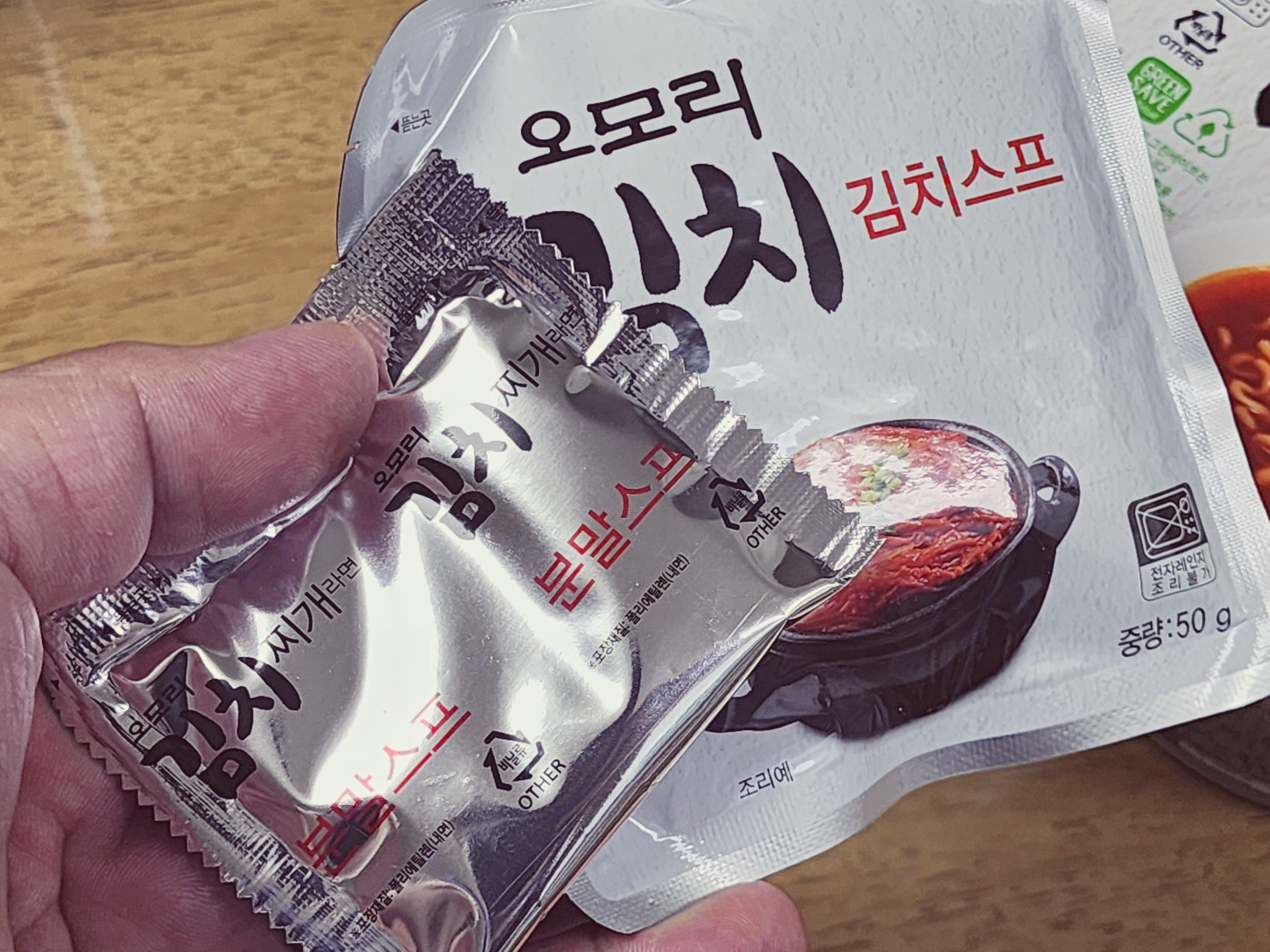 김치찌개 라면에 스프를 절반가량 넣습니다. 2/3를 넣어도 되는데 먹고 나서 느끼함과 짠맛이 있으니 싱겁게 먹는다면 절반을 넣고 좀 짜게 먹는다면 2/3를 넣습니다. 스프가 많을수록 느끼하지만 조미료 버프로 인해 맛있습니다.