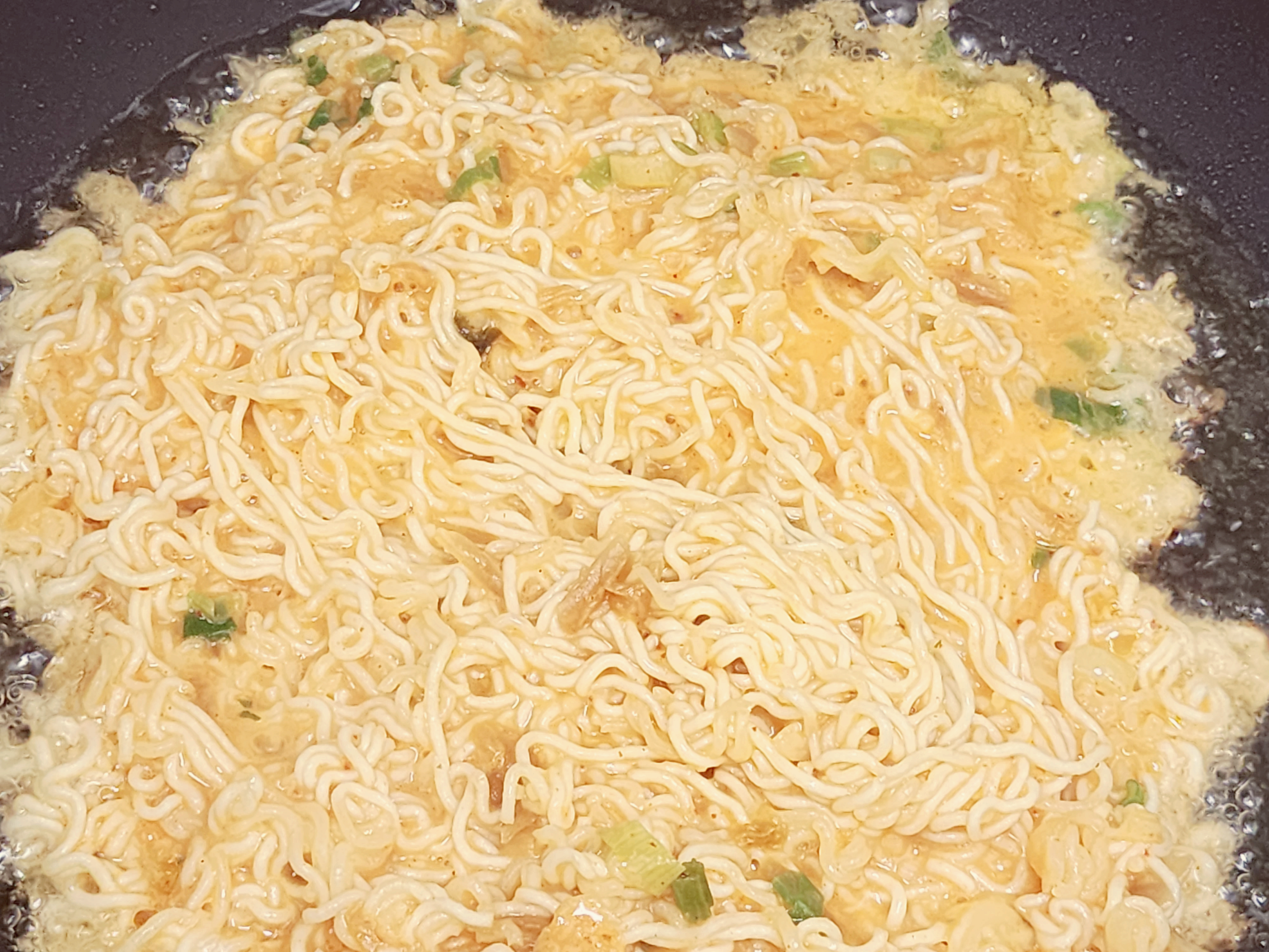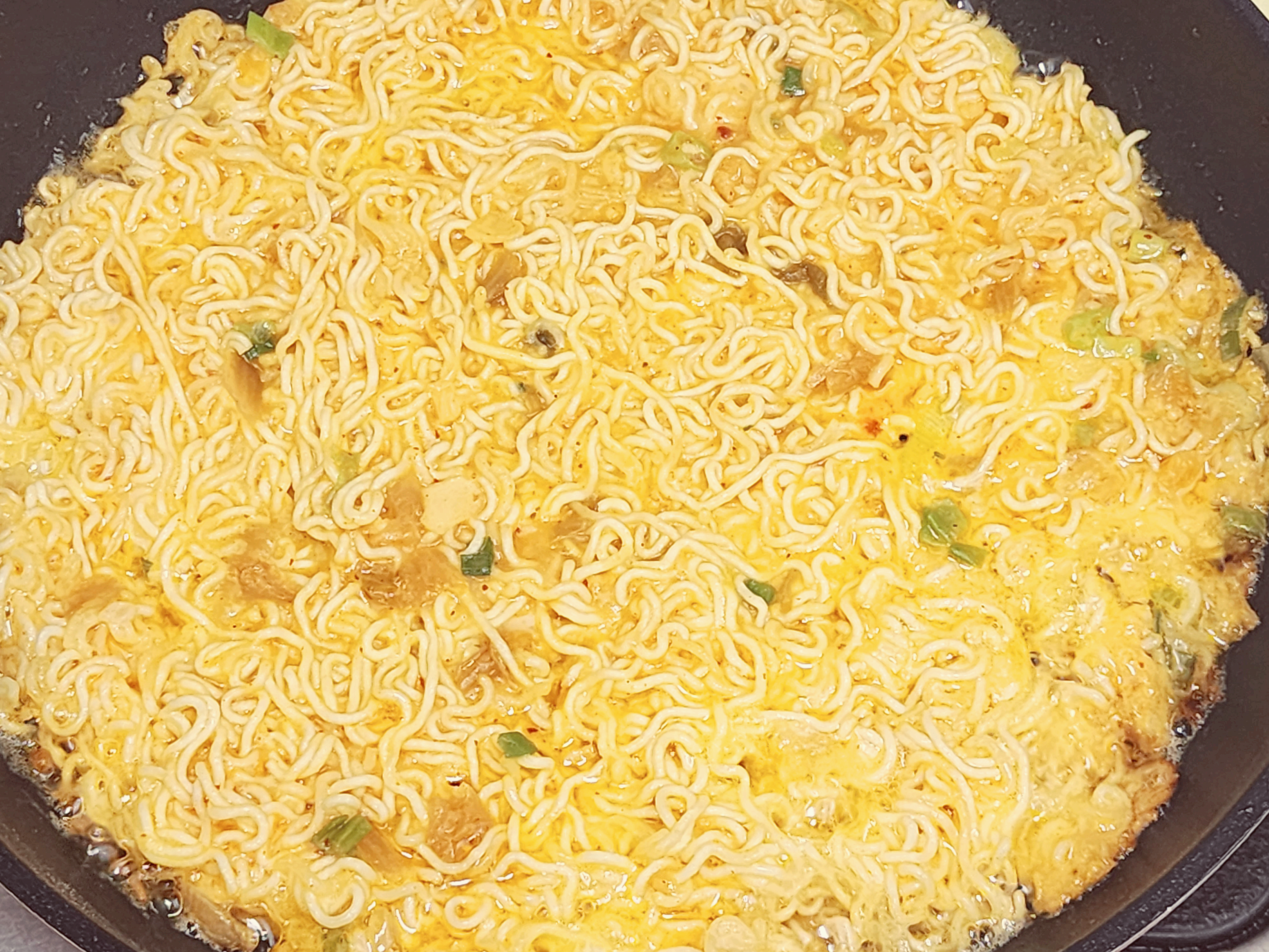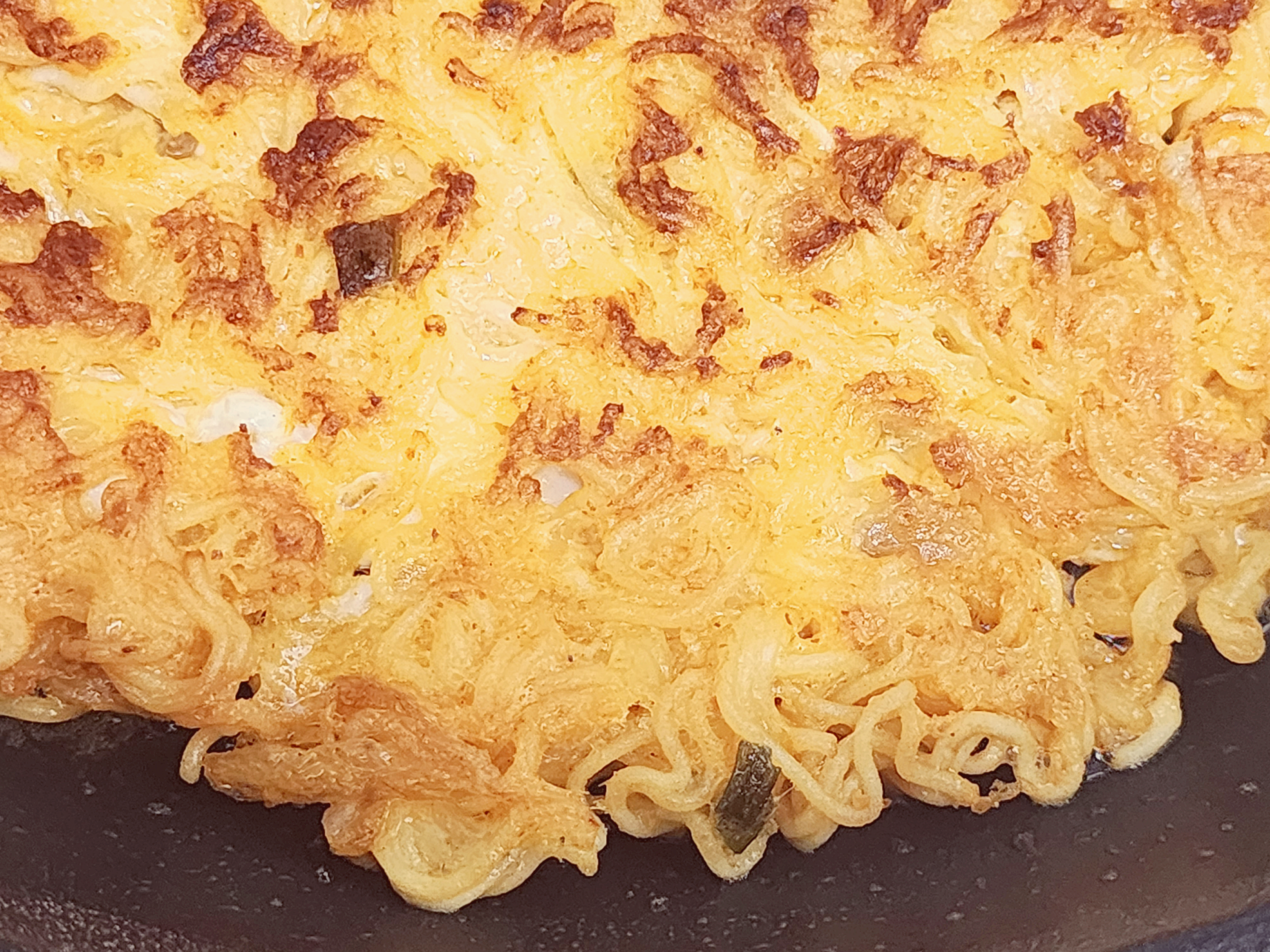 다른 전이나 부침과는 달리 기름의 양이 많이 들어갑니다. 프라이팬바닥이 보이지 않을 정도로 식용유를 넉넉히 넣습니다. 달궈진 프라이팬에 라면 용기에 있는걸 한번에 모두 넣습니다. 프라이팬이 26cm 이상으로 된 프라이팬이 좋습니다. 작은 프라이팬은 두꺼워집니다. 26~28cm 정도가 적당합니다.