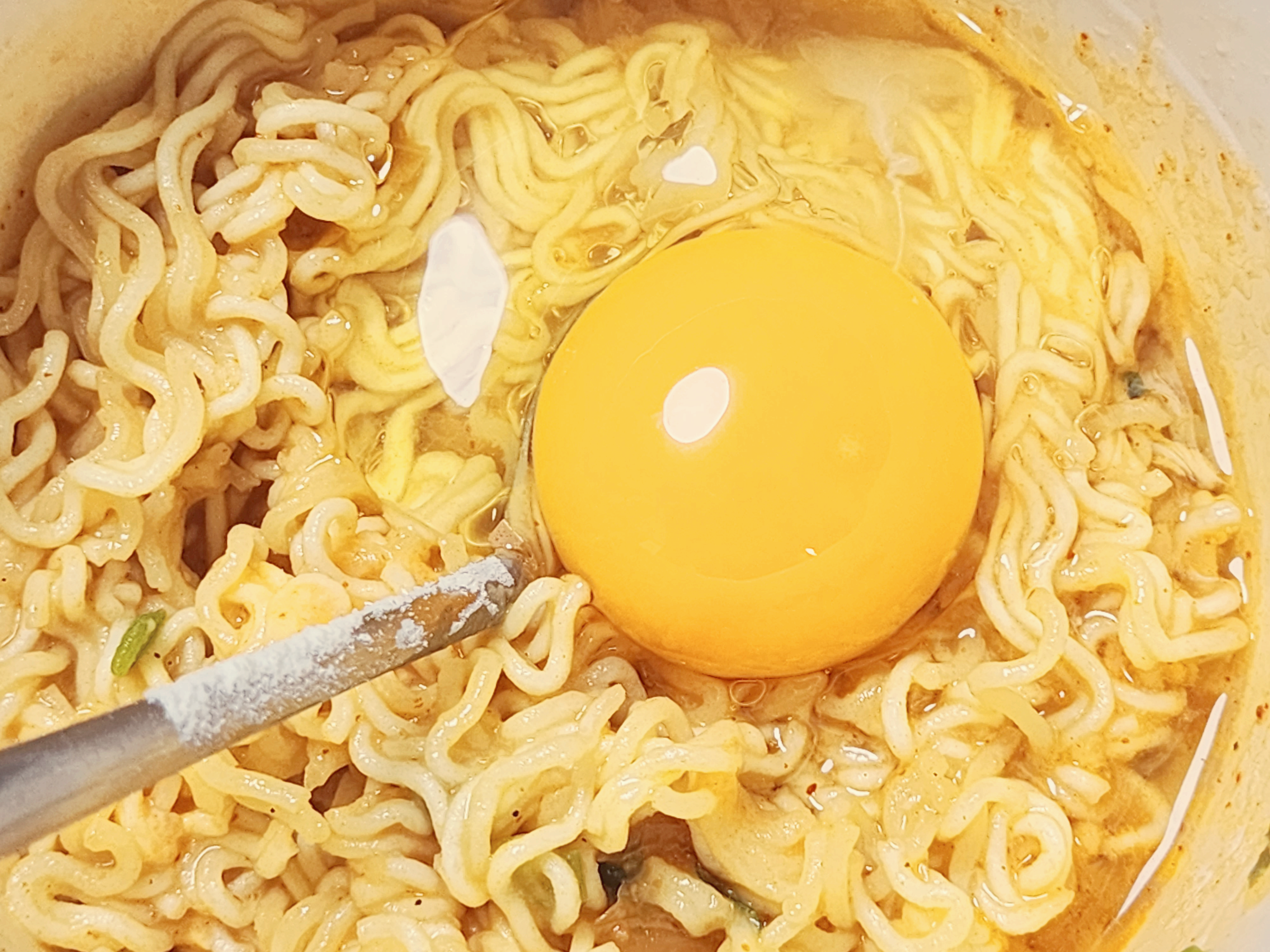 라면이 익으면 쉽게 잘리지 않기 때문에 물을 붇고 1분정도 뒤에 숟가락으로 면을 잘라줍니다. 용기가 찢어지지 않을 정도로 잘라주면 됩니다. 면을 자르고 뚜껑을 덮지 않고 2분정도 기다려 주세요. 뚜껑을 덮지 않아야 계란이 익는 것을 방지합니다.