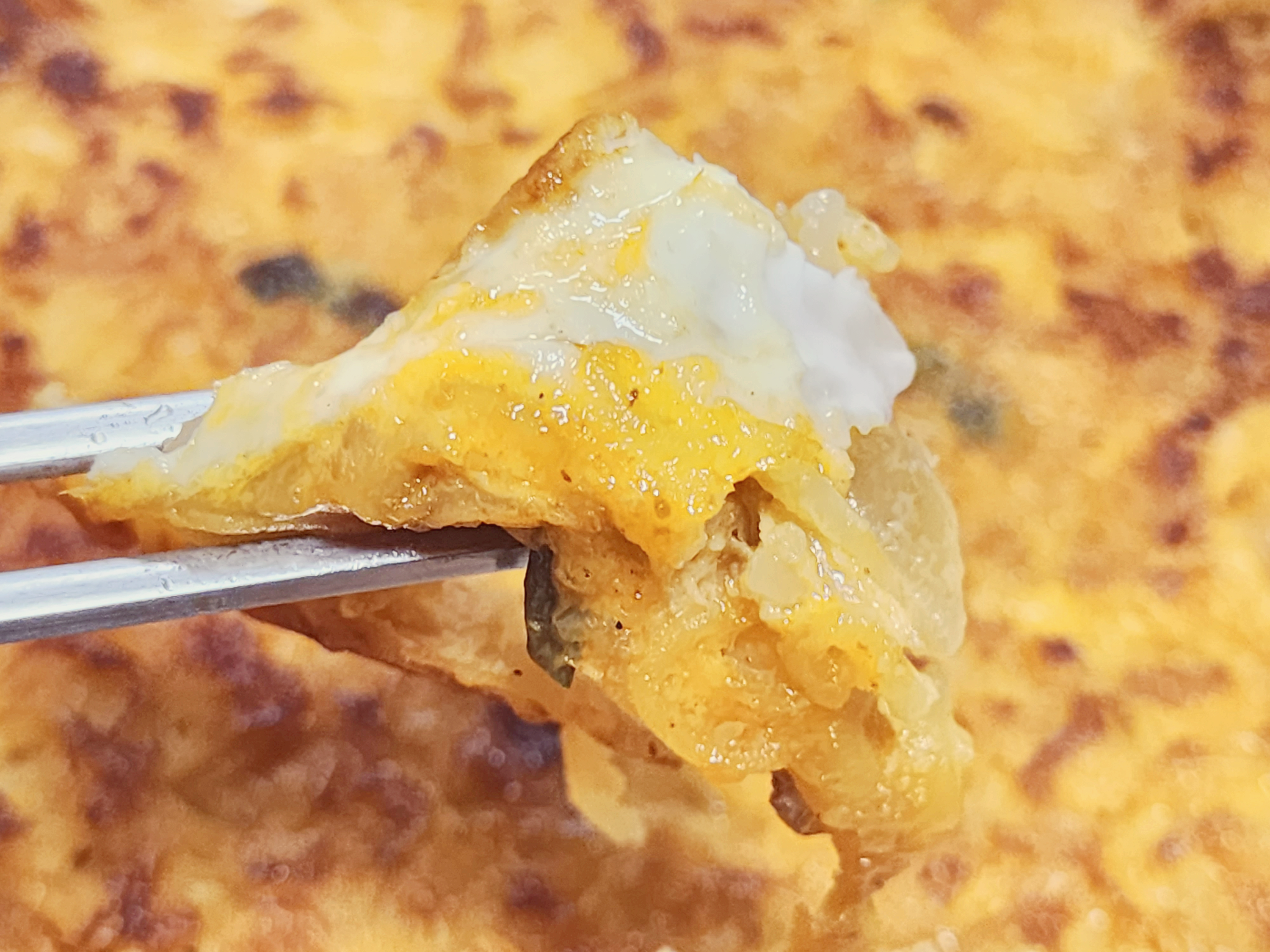 끈기 있게 기다려야 합니다. 불이 셀 경우 바닥이 탈 수 있으니 중간불 이하로 4~5분정도 기다린 후 뒤집게로 살짝 들어 올렸을 때 쳐지지 않는지 확인을 해봅니다. 쳐지지 않으면 그때 뒤집어 줍니다. 기름을 많이 넣기 때문에 프라이팬 스냅으로 뒤집게 없이 하면 기름이 튈 위험이 있으니 꼭 뒤집게를 이용합니다.