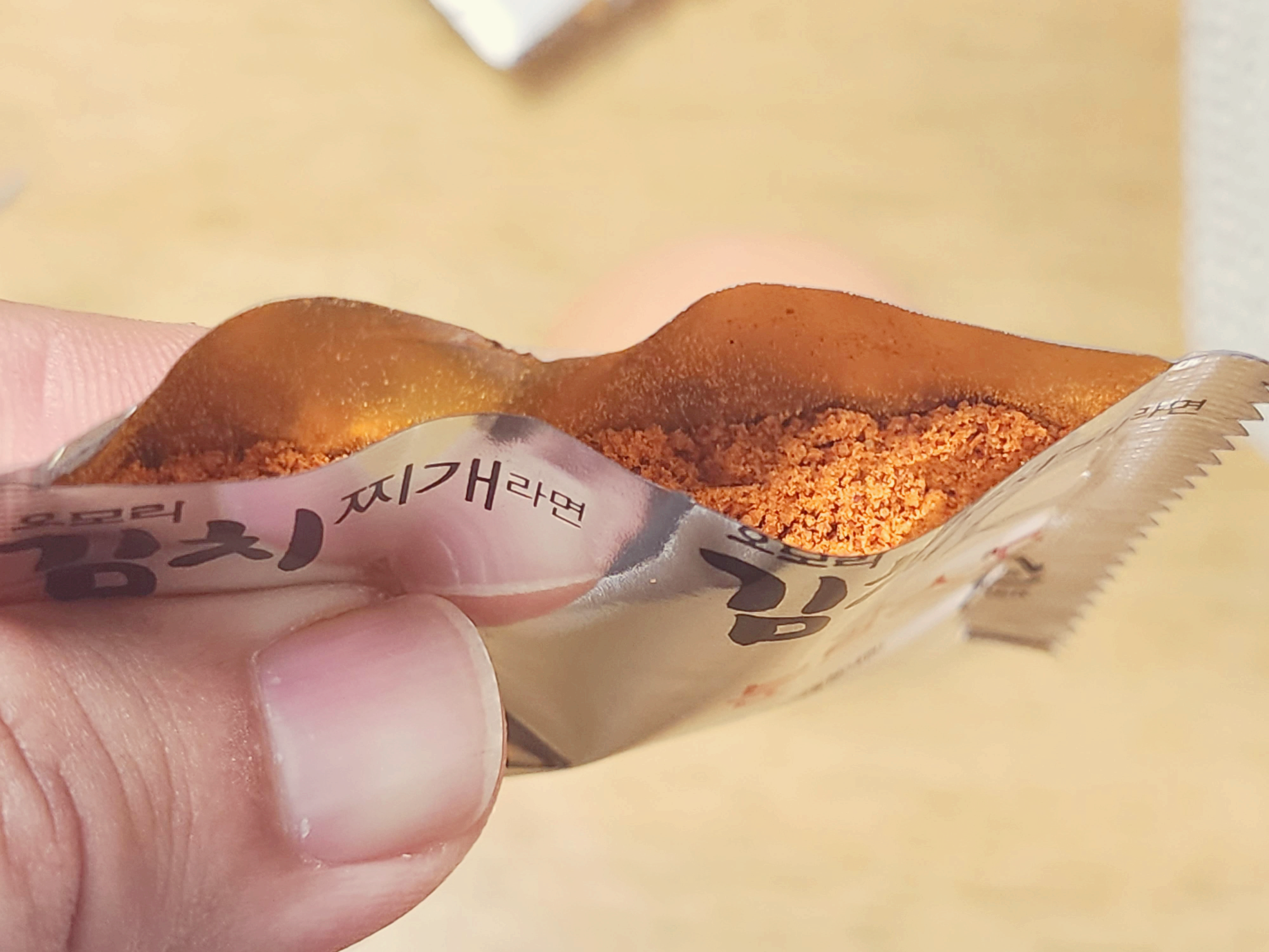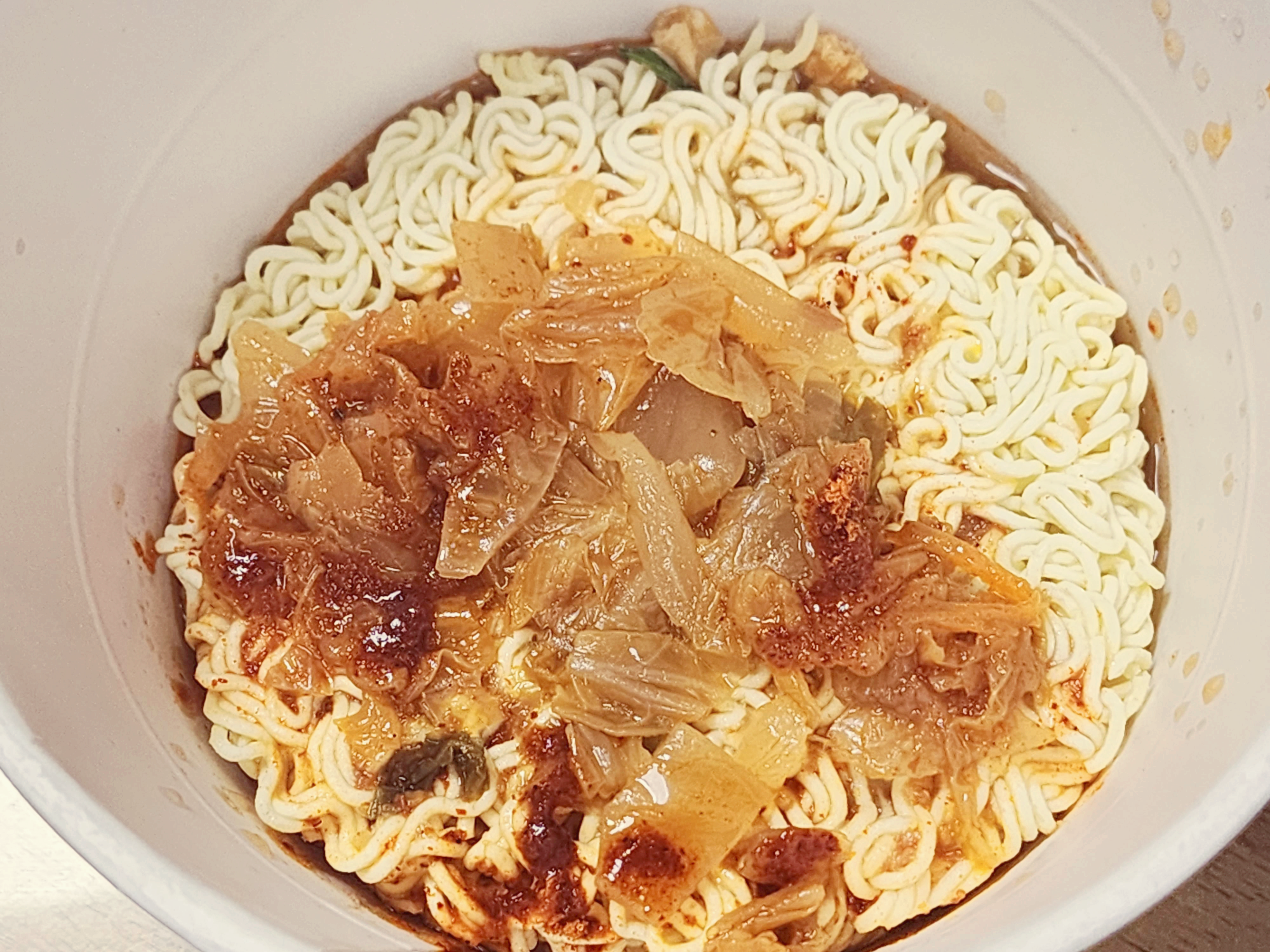 사발면에 스프와 김치가 들어가 있습니다. 김치는 다 넣고 스프는 위에 말한대로 절반정도만 넣습니다.