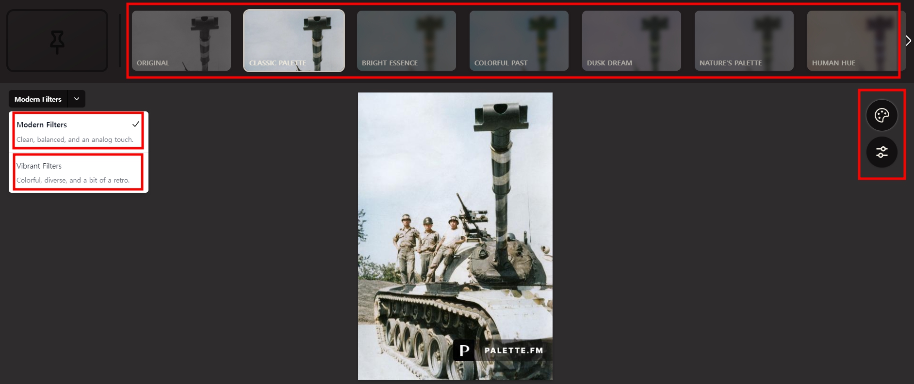 필터가 2개가 있는데 필터마다 색을 보정한 사진이 20장씩 나옵니다. 총 40장의 사진을 쉽게 볼 수 있으니 선택하여 다운로드를 할 수 있습니다. 이 사이트가 다른 사이트보다 건물이나 사물, 배경의 색을 표현할 수 있어 추천합니다.