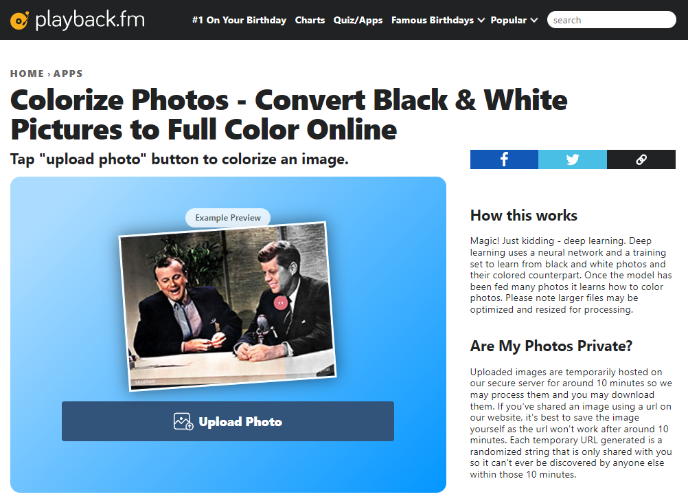 Colorize photos online for free. Turn your old black and white photographs into color photos with our free online tool.