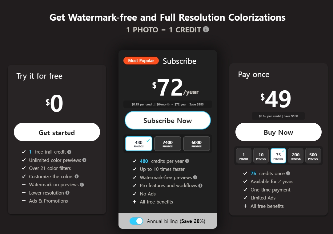 이미지컬러라이저는 회원가입없이 사용이 가능합니다. 인물은 차이가 있는데 사물, 풍경이 거의 표현이 되지 않는 곳입니다. 이 사이트는 '흑백사진>컬러사진'을 하기보다는 사진의 구김이나 훼손을 AI가 보정을 해주는 기능이 있으니 한번 테스트 해보시길 바랍니다. 제가 테스트를 해보니 아주 만족하지는 않았고 리터칭은 괜찮은 편이였습니다. 리터칭을 다시 한번 해보세요.