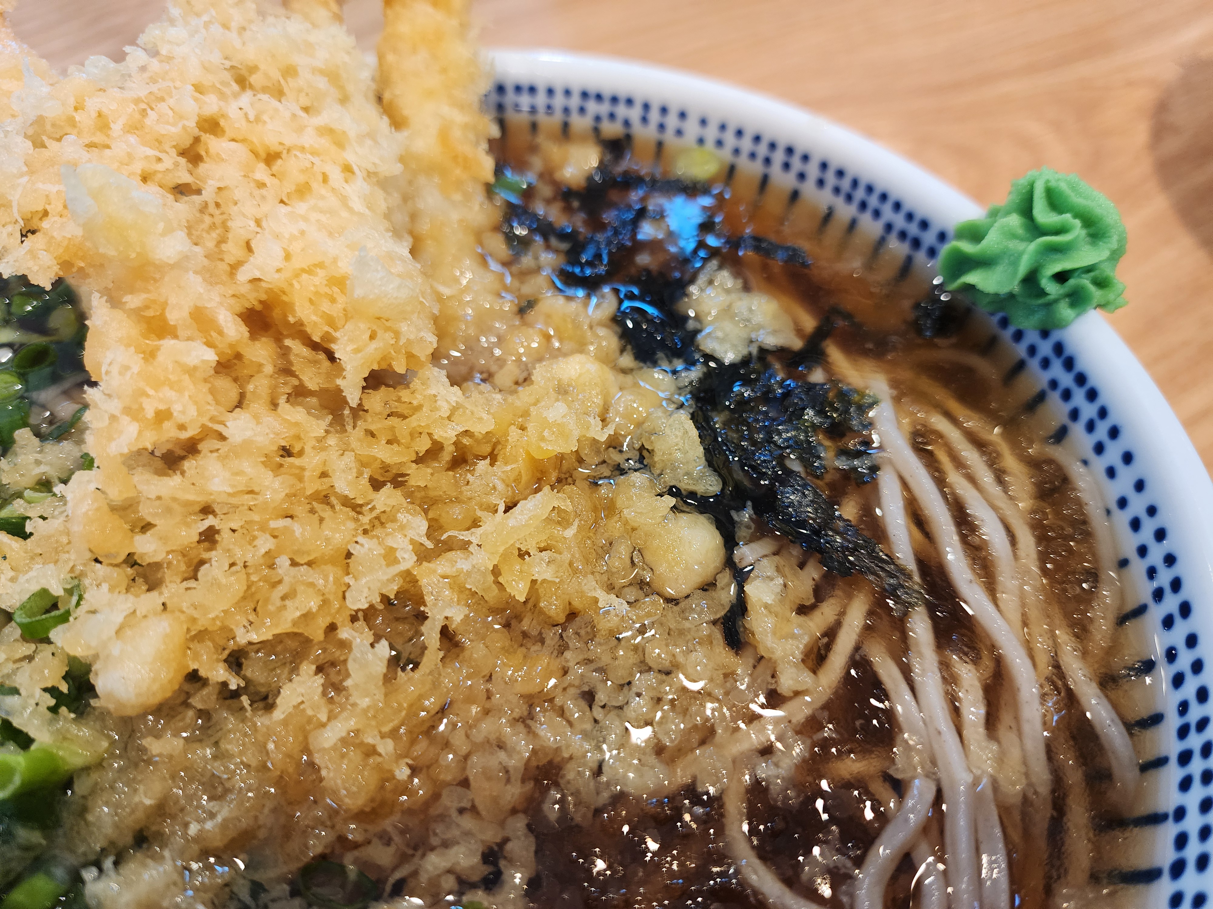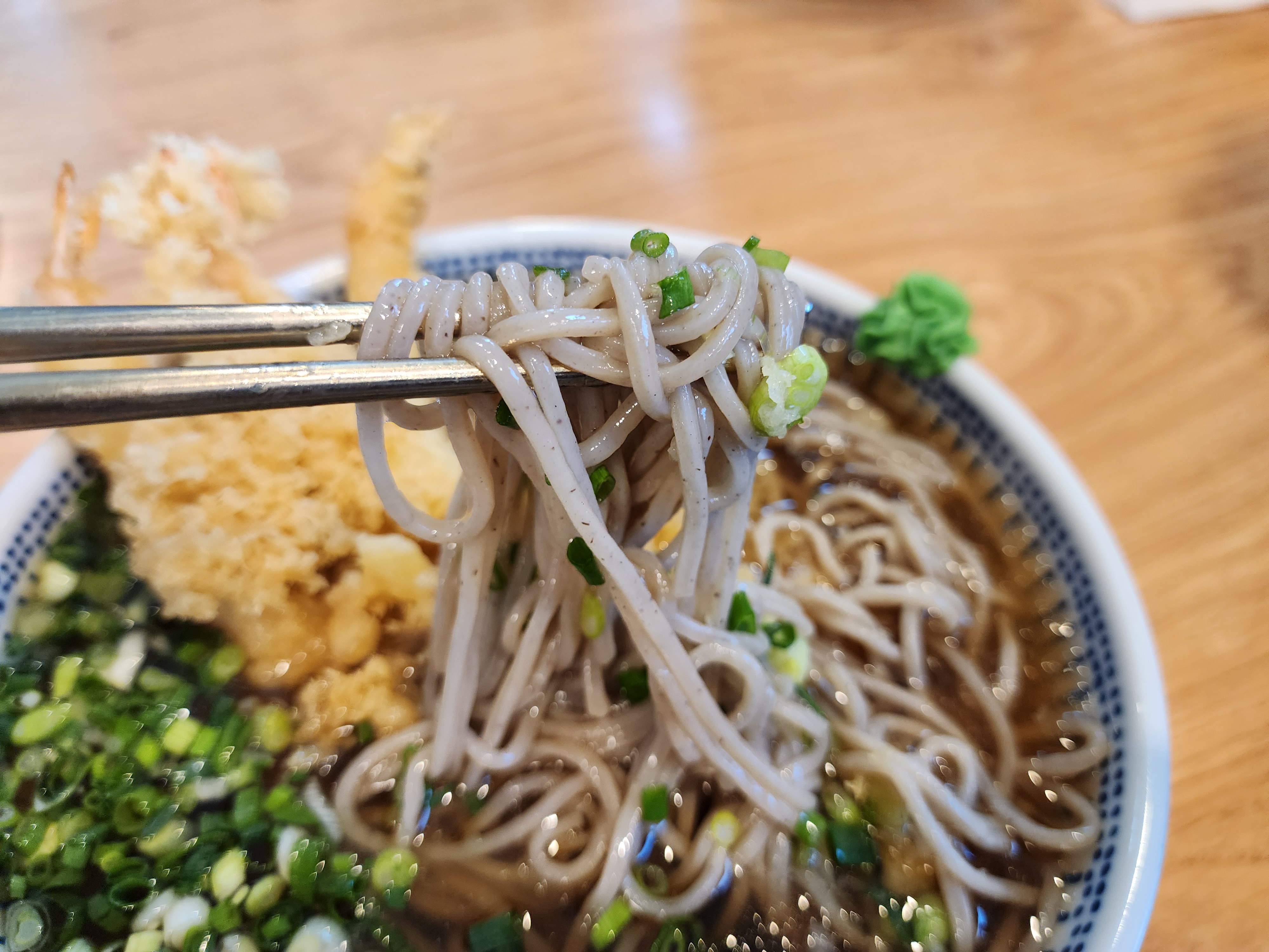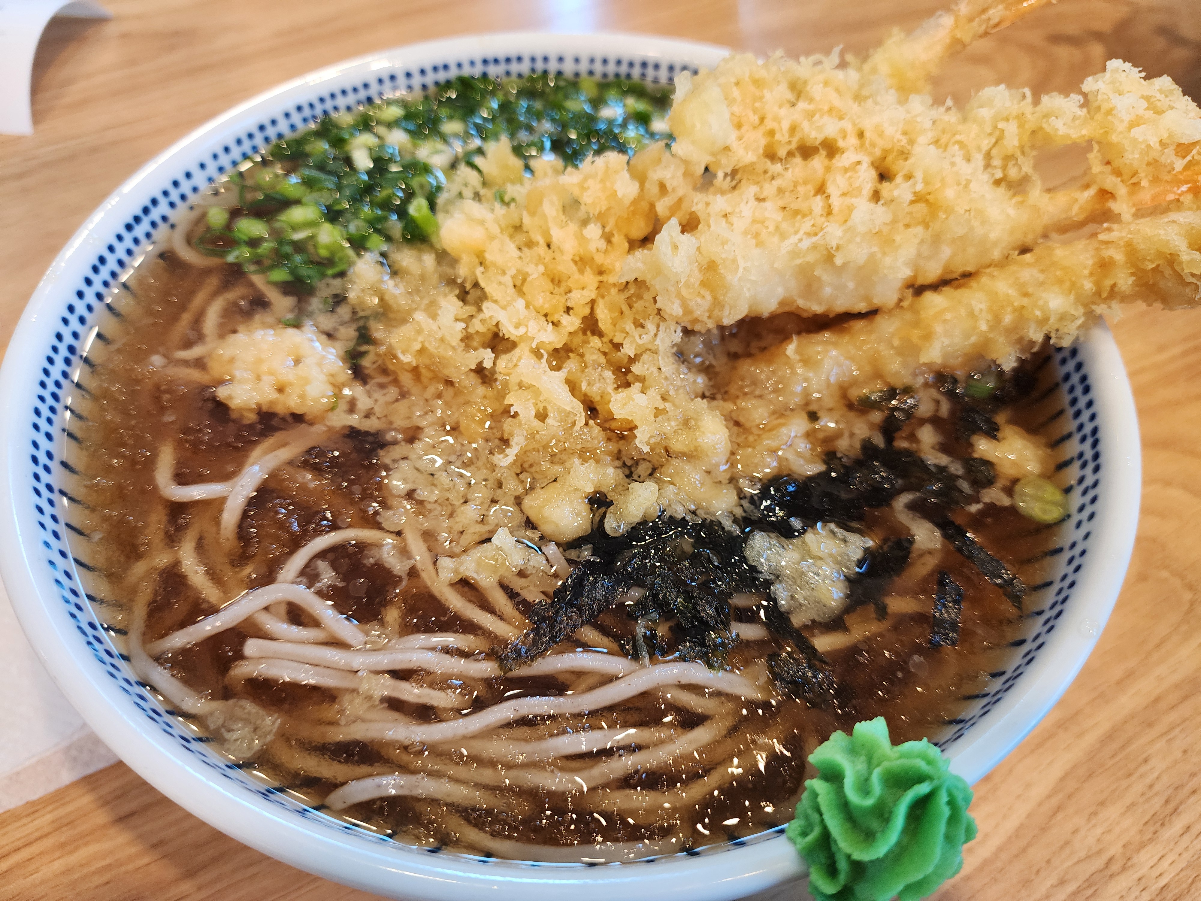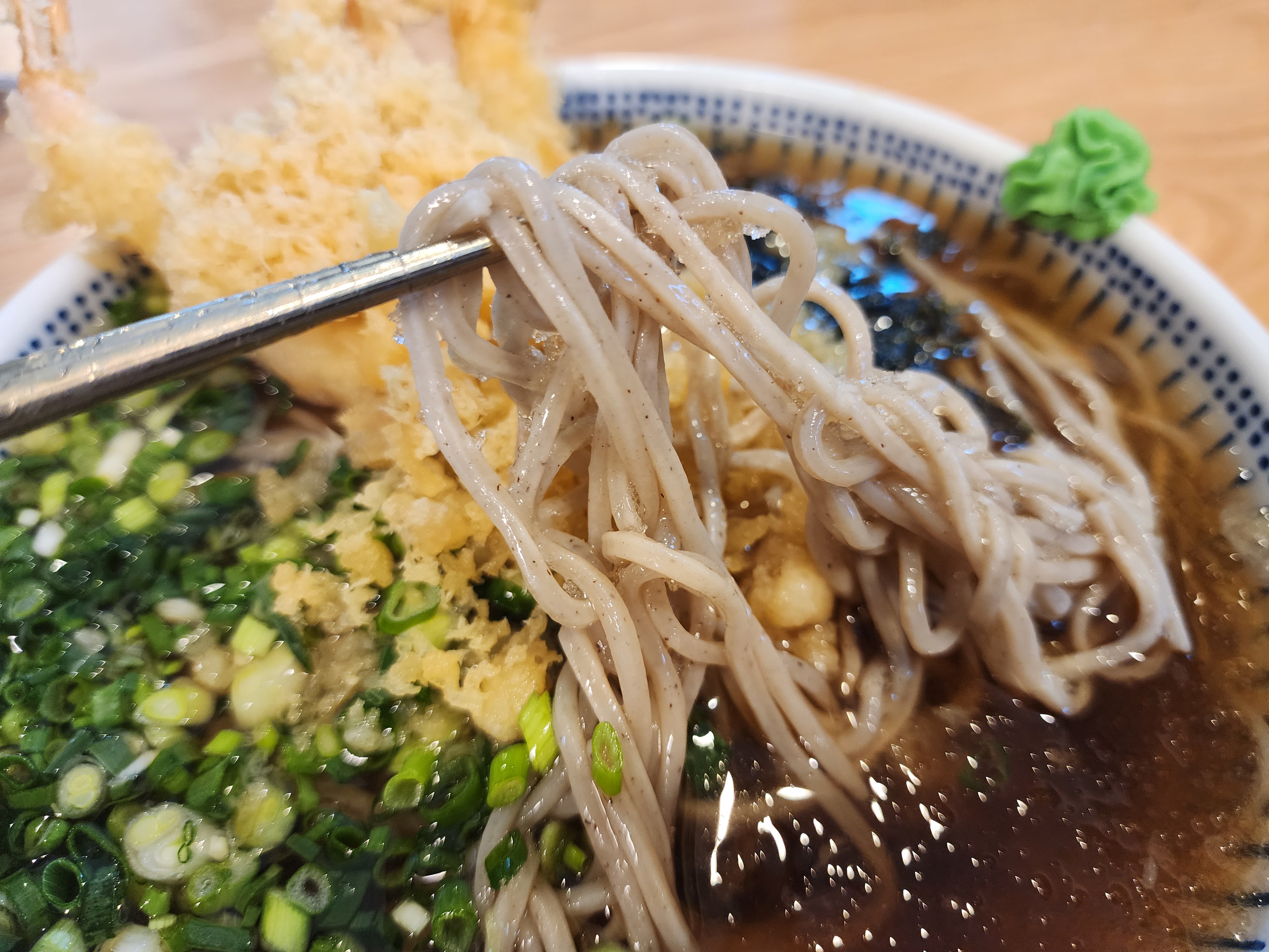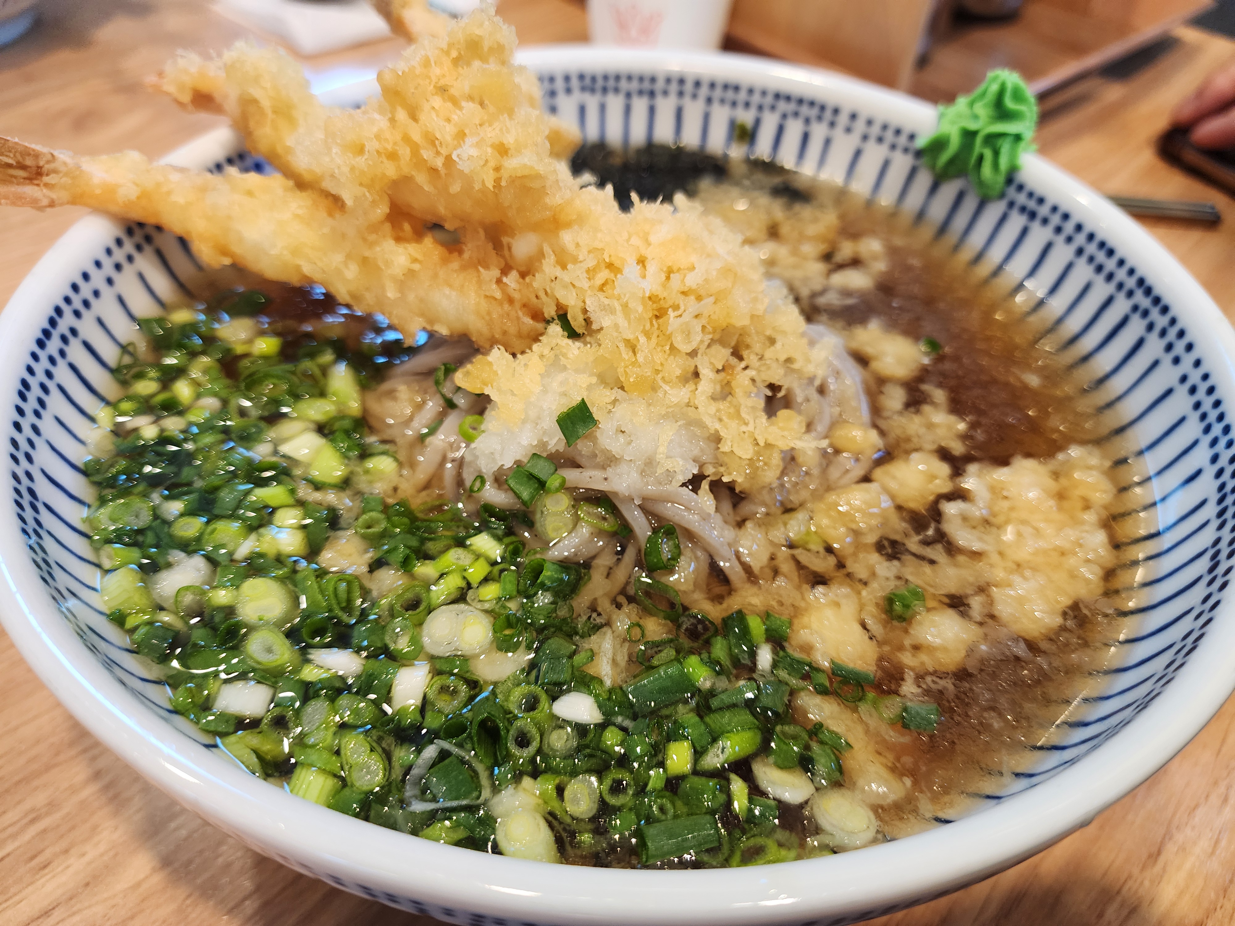 새우소바는 기본 새우가 3마리가 나오는데 곱빼기를 주문할 경우 새우가 1마리가 더 들어가 있었습니다. 새우튀김에 붙어 있는 튀김옷들이 벗겨져 튀김우동의 느낌도 나면서 시원한 소바를 맛볼 수 있습니다. 소바는 무김치를 함께 먹어야 소화가 잘된다고 하여 김치를 가지고 왔습니다.