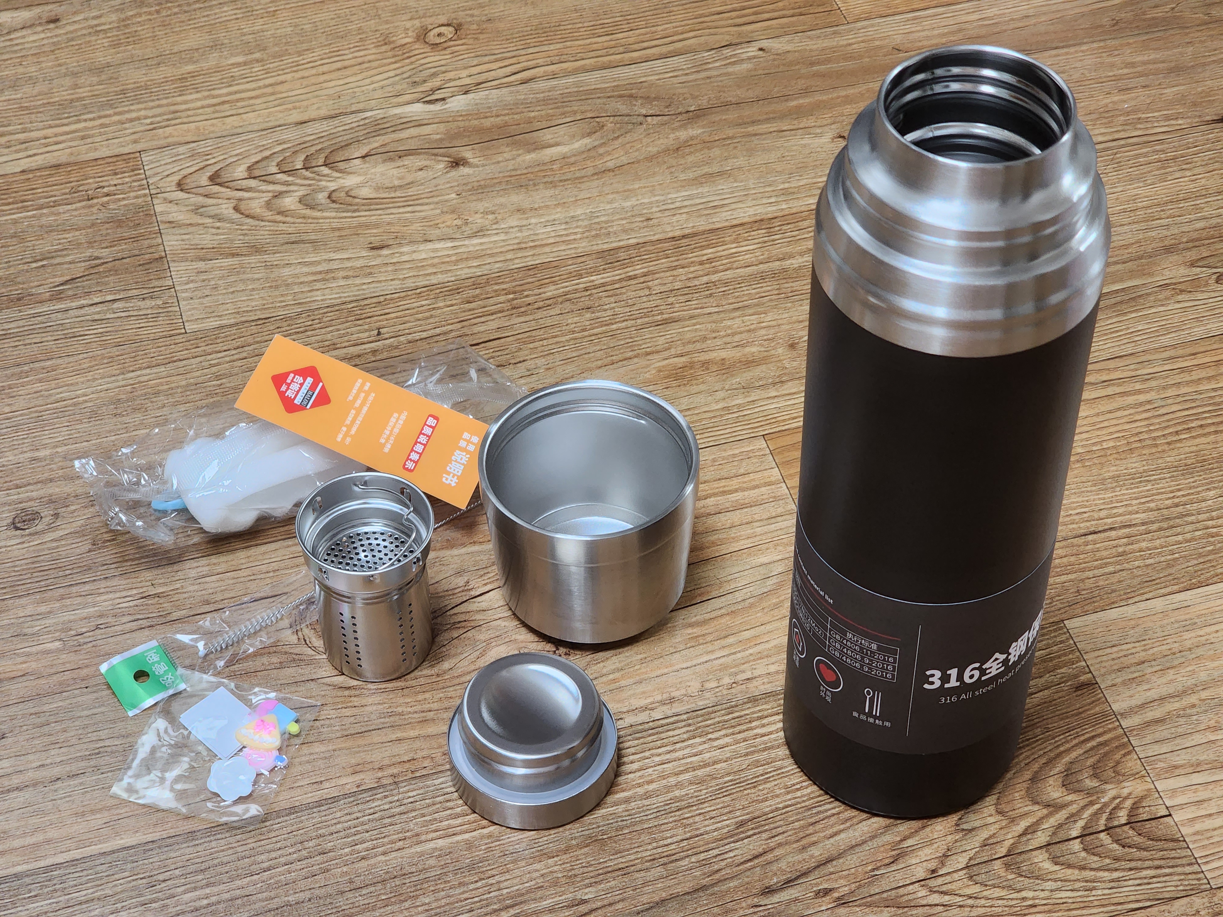 스테인레스 SUS316으로 재질이고 고무패킹이 아닌 모델을 찾아 구매했습니다. 찻잎을 넣을 수 있는 차망(티포트)도 있었습니다. 사은품으로 수세미하고 스티커를 받았습니다. 1L를 구매한 이유는 브랜드 제품이라고 하더라도 500ml정도의 크기의 보온병은 물온도 지속시간이 짧기 때문입니다. 1L를 넣고 24시간 뒤에 열었을때도 미지근했습니다.