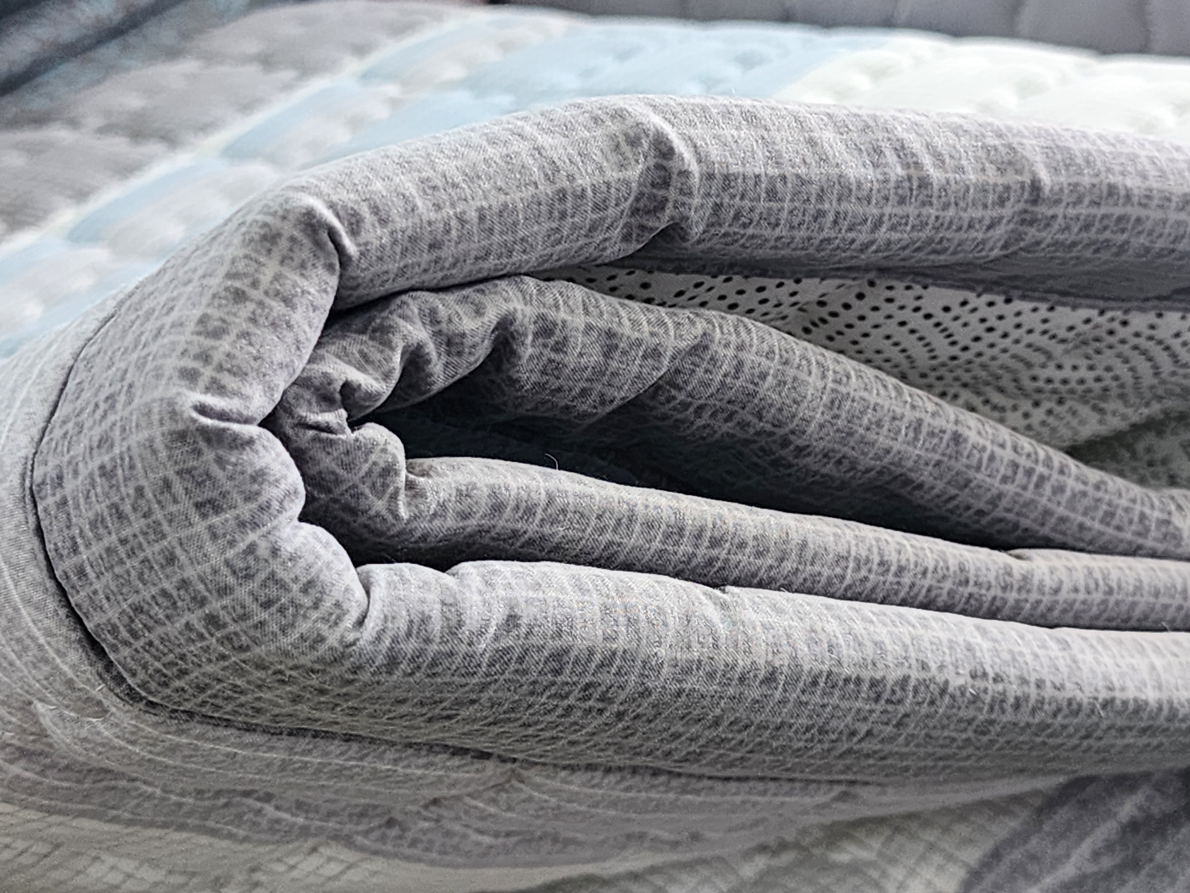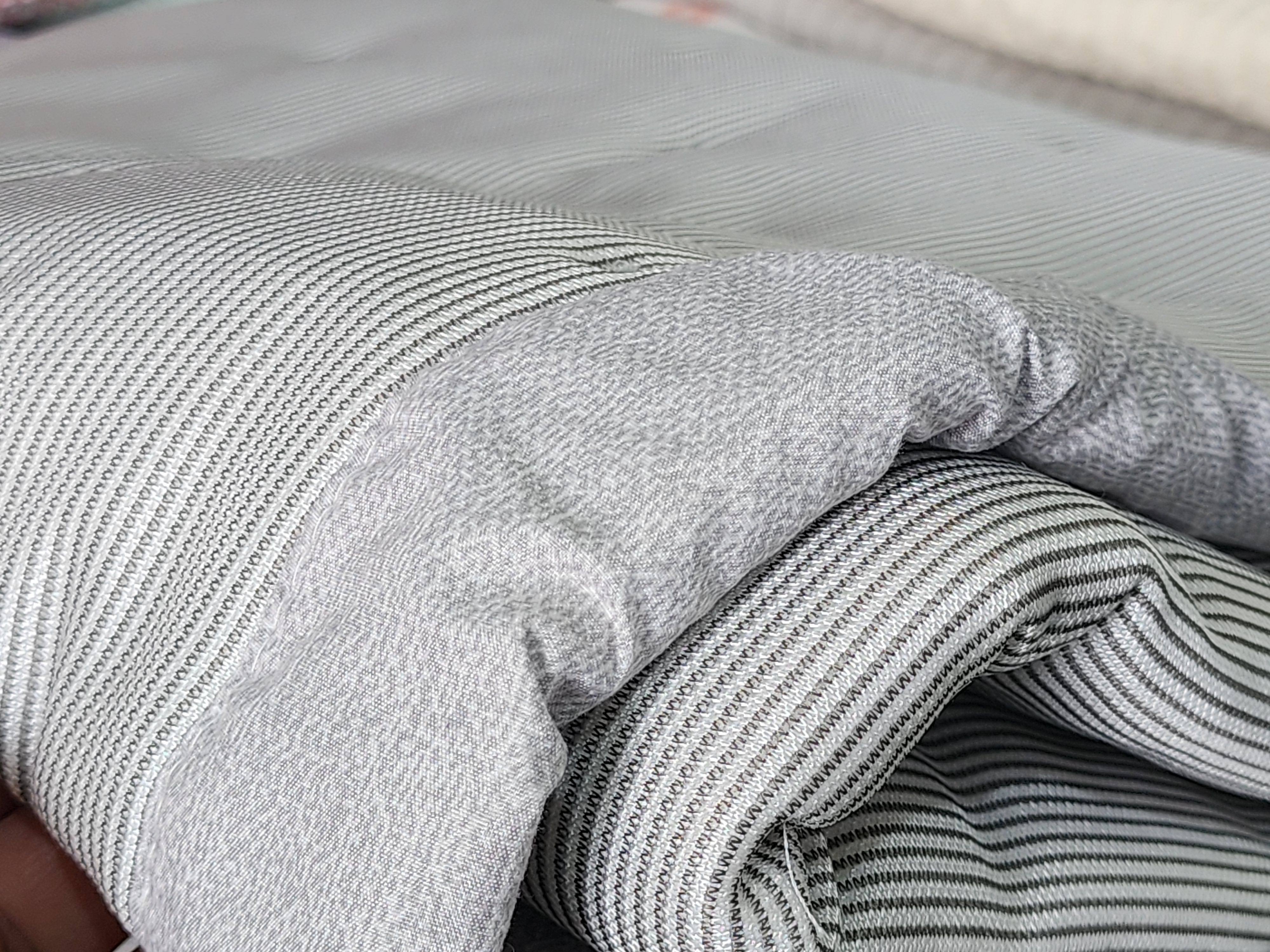 누울 때 끈적이지 않고 시원하지 않고 차가운 느낌의 냉감 이불이였습니다. 은색 스트라이프로 되어 있는 것도 있었고 꽃무늬 스타일도 있었습니다. 안쪽과 바깥쪽이 다른 패턴으로 질리지 않고 여름에 시원하게 쓸 수 있을 것 같습니다.
